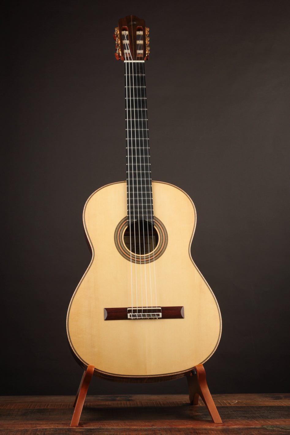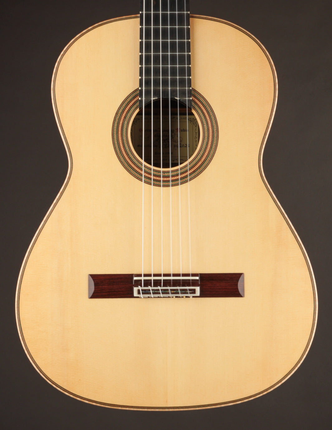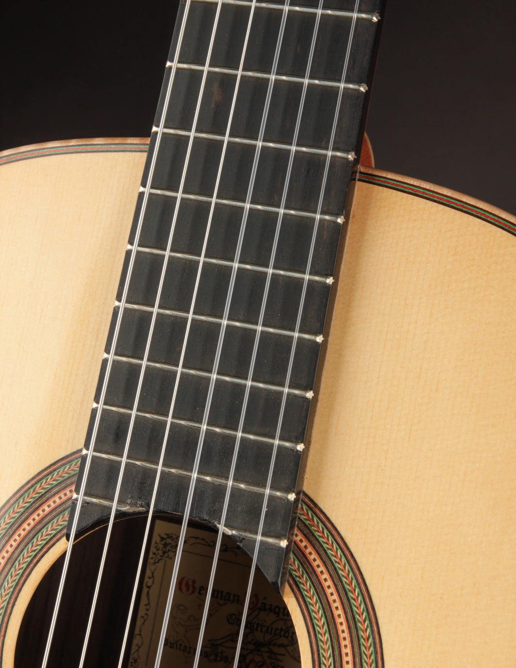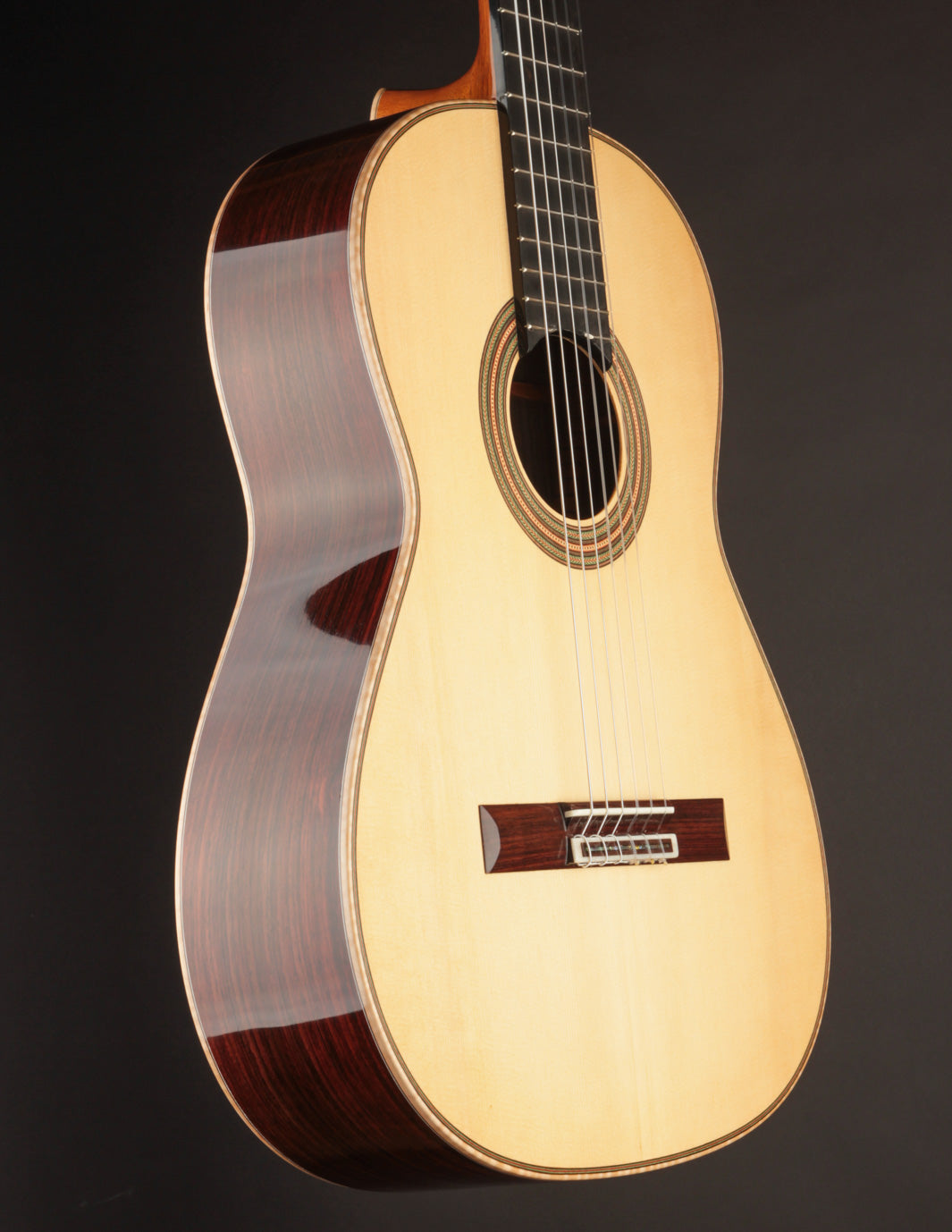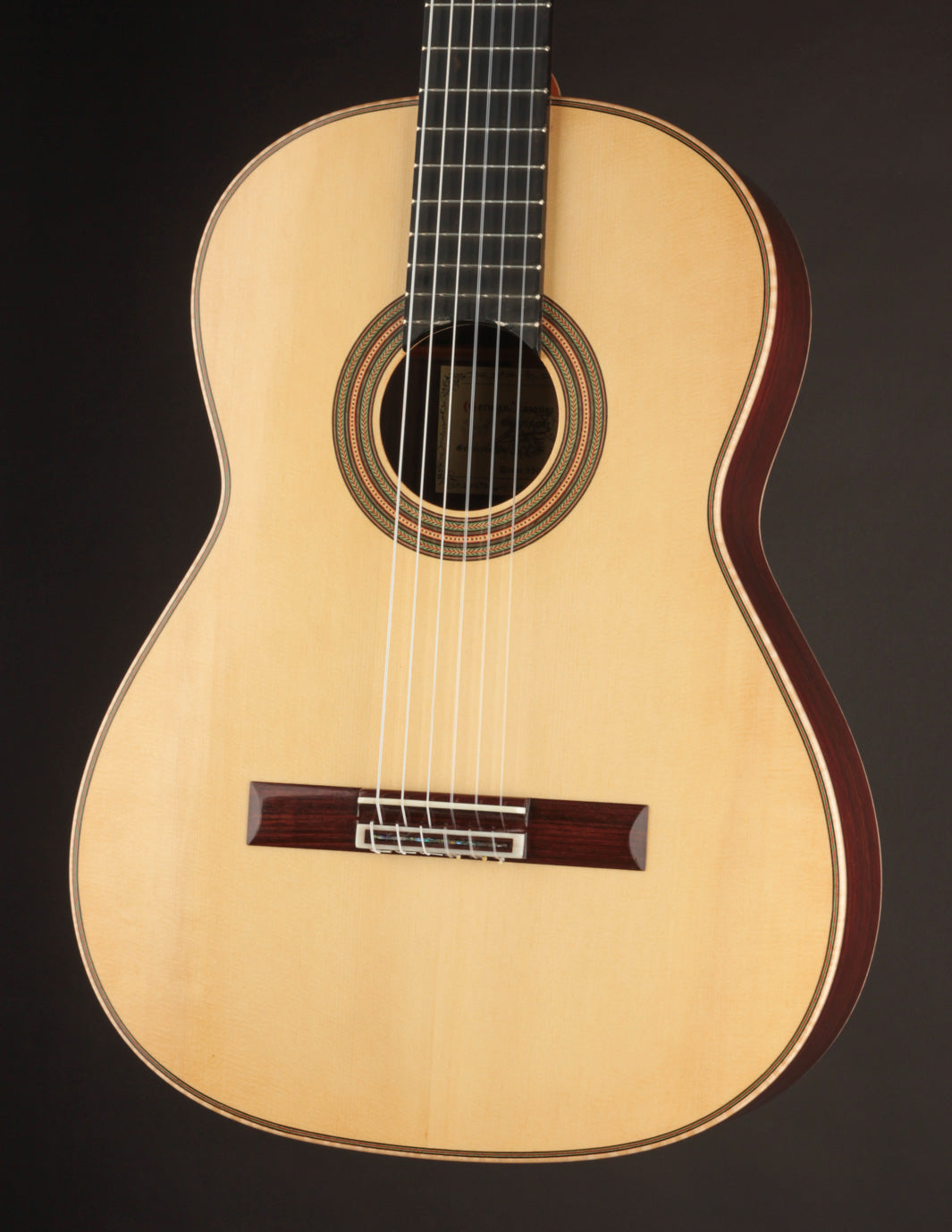 An inspired interpretation of the venerable Hermann Hauser instruments from the 1930s. French polished finish, stellar tonewoods—a deeply expressive, house favorite model from a modern master classical guitar luthier.