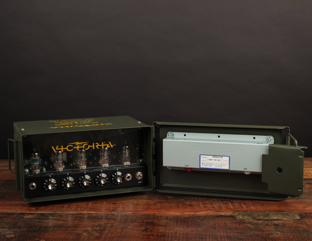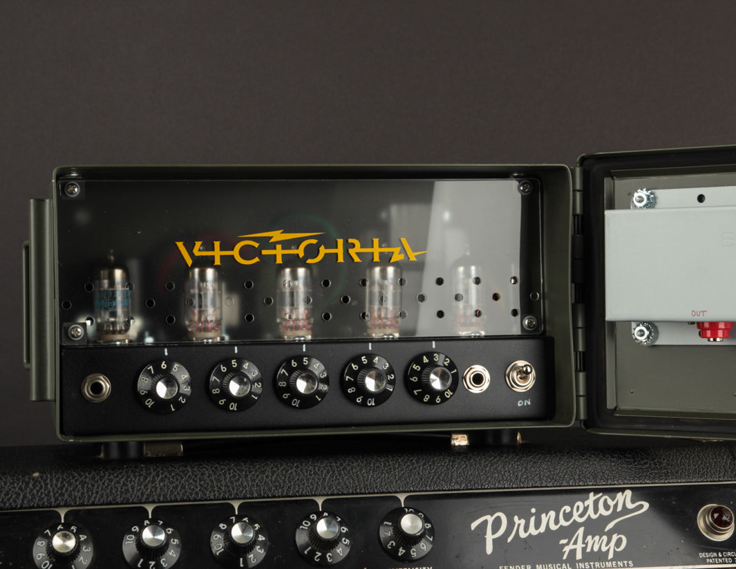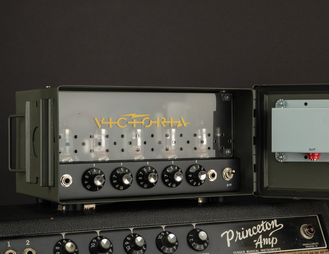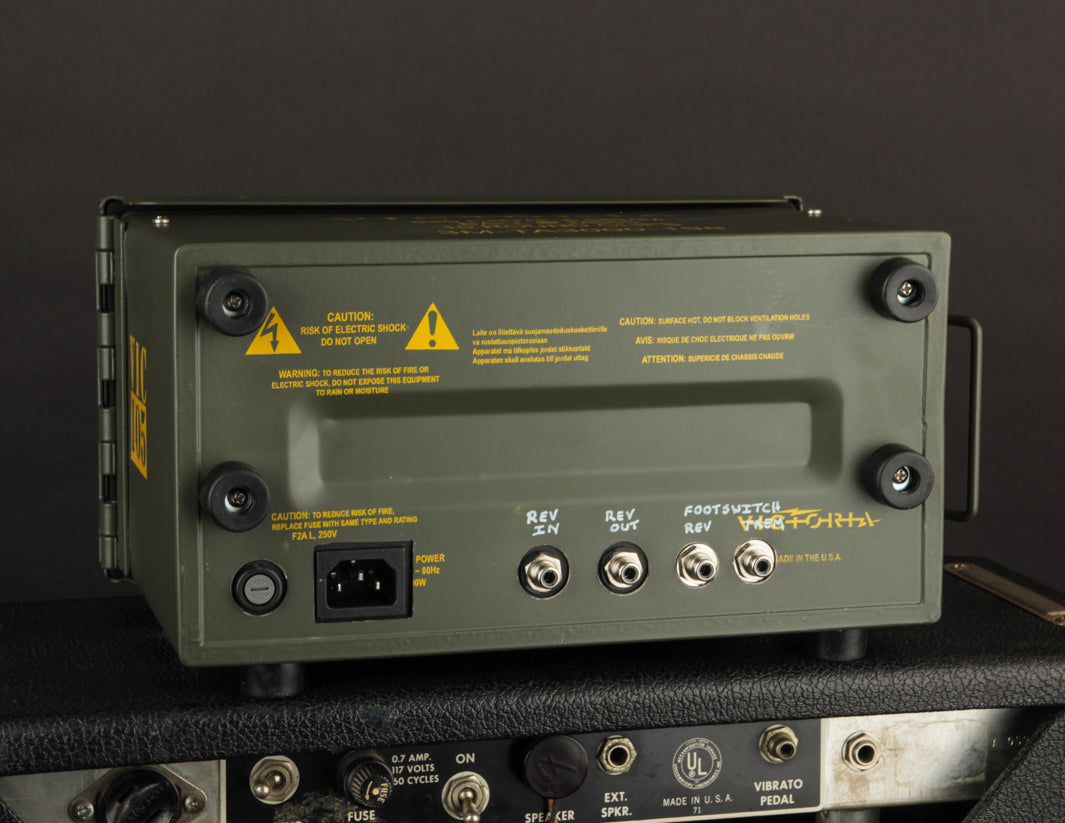 The Reverberammo offers the same functionality and feature set as the Reverberato, but it's housed in a repurposed .50 Caliber ammunition canister. A vented plexi glass panel is inset into the can with Victoria's logo silkscreened across the front of it. It's also backlit with a pilot lamp to showcase the exposed transformer and tube complement. The hinged canister door holds the spring reverb tank, which can be removed and placed adjacent to or on top of the canister during use.