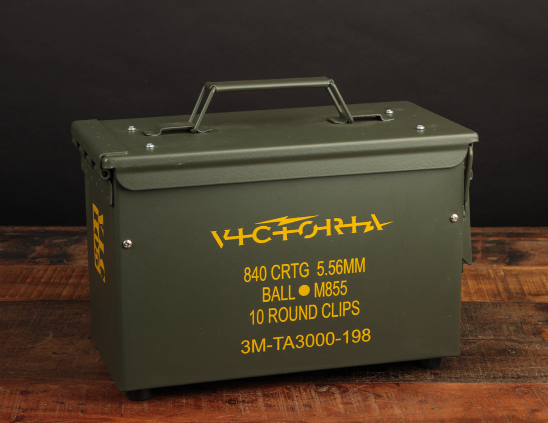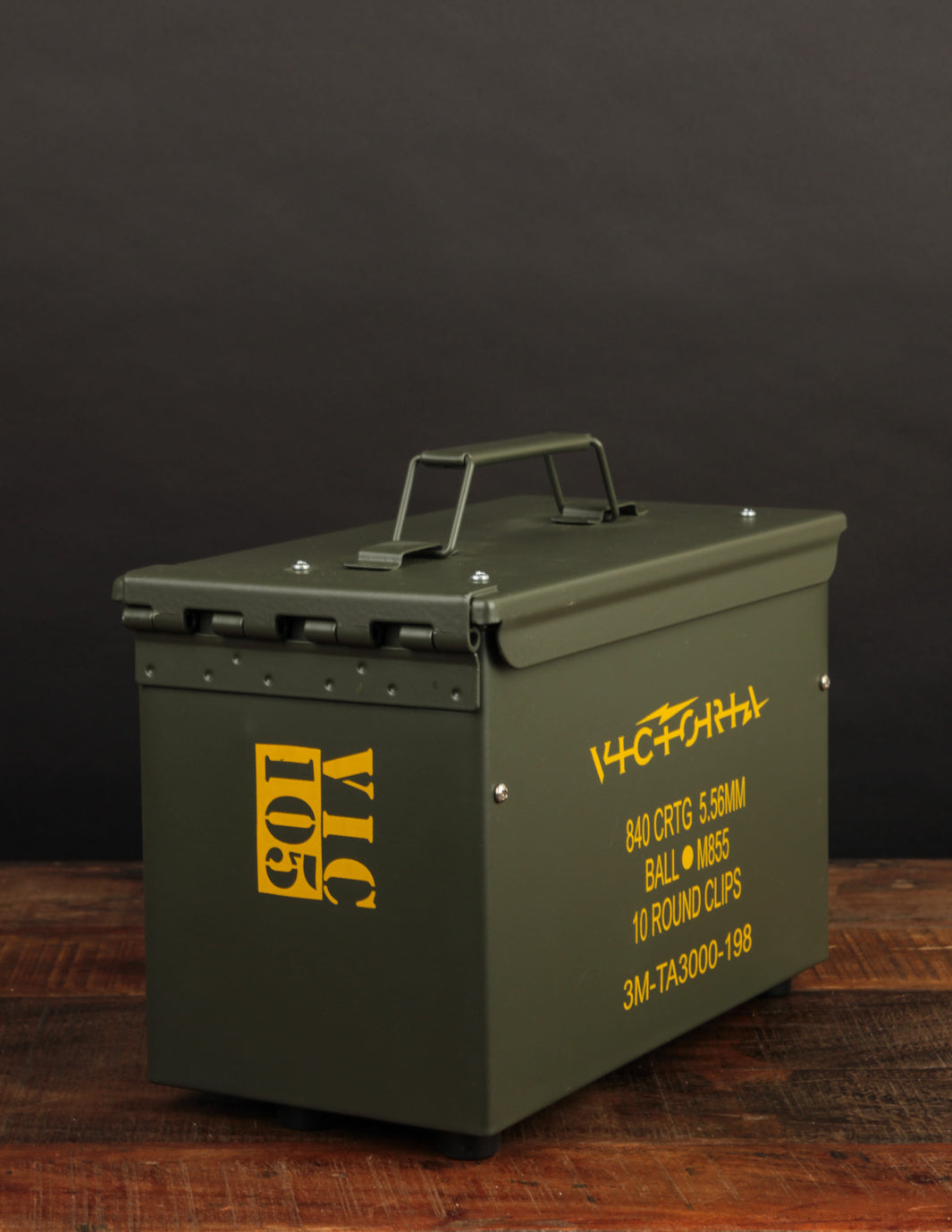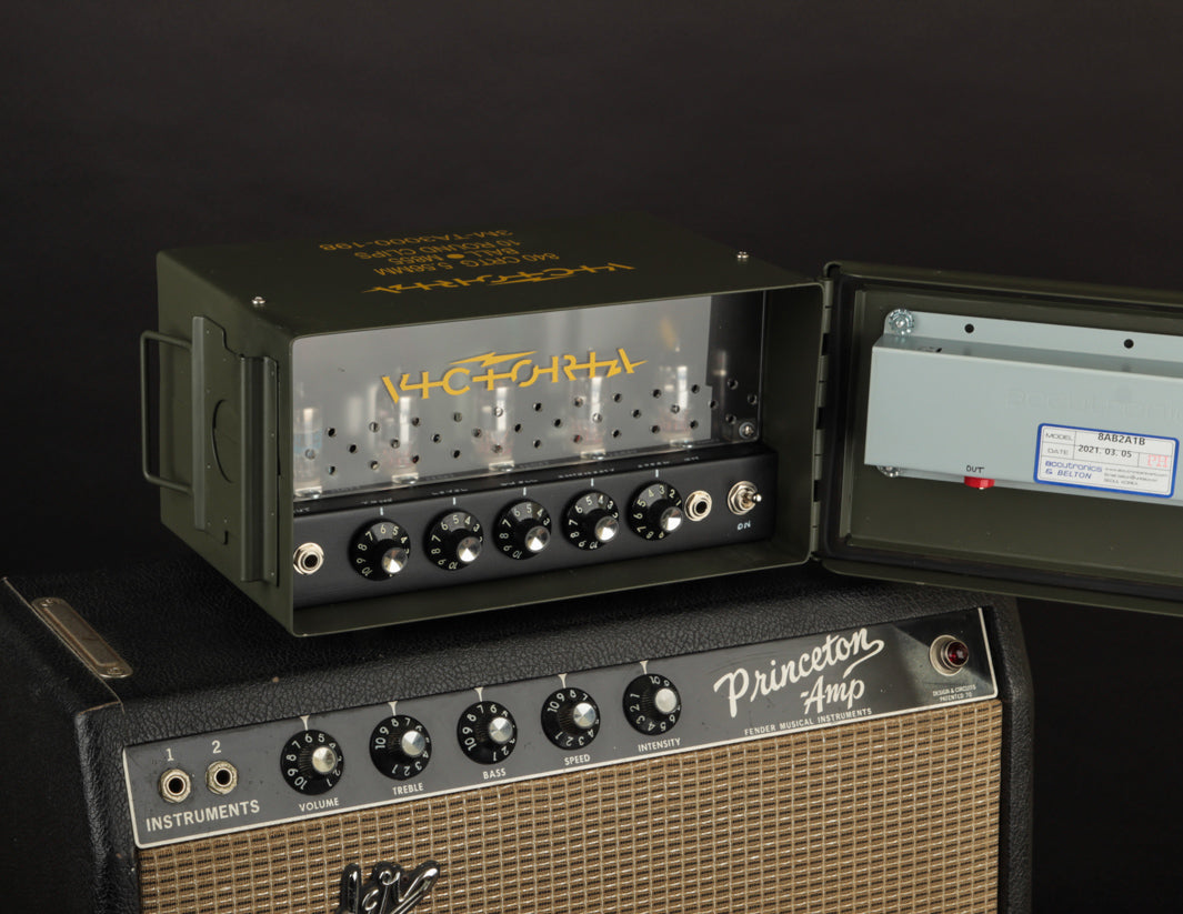 The Reverberammo offers the same functionality and feature set as the Reverberato, but it's housed in a repurposed .50 Caliber ammunition canister. A vented plexi glass panel is inset into the can with Victoria's logo silkscreened across the front of it. It's also backlit with a pilot lamp to showcase the exposed transformer and tube complement. The hinged canister door holds the spring reverb tank, which can be removed and placed adjacent to or on top of the canister during use.
