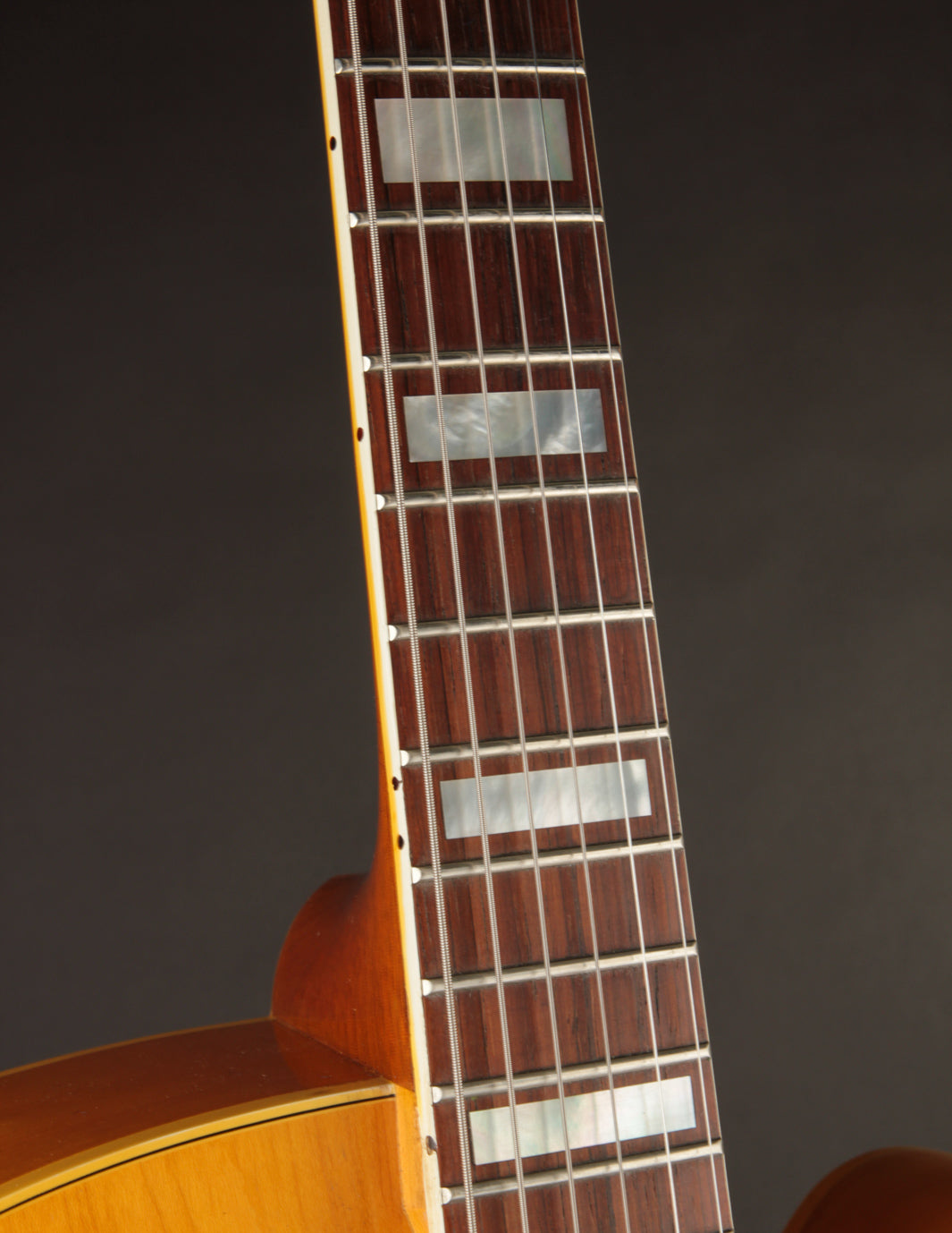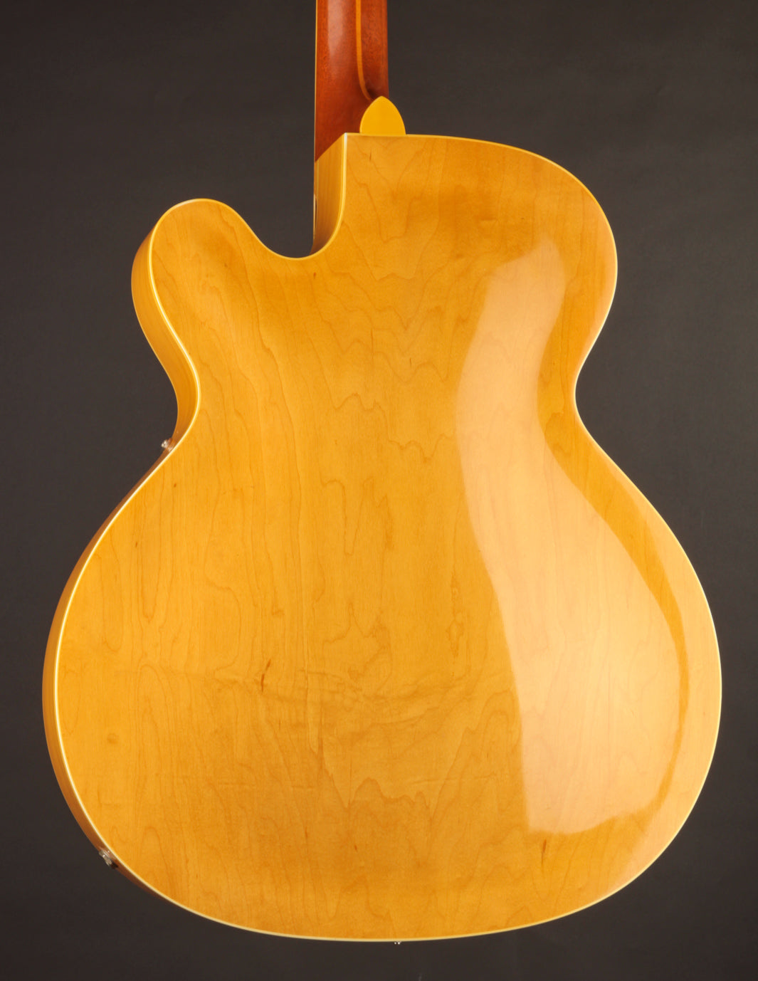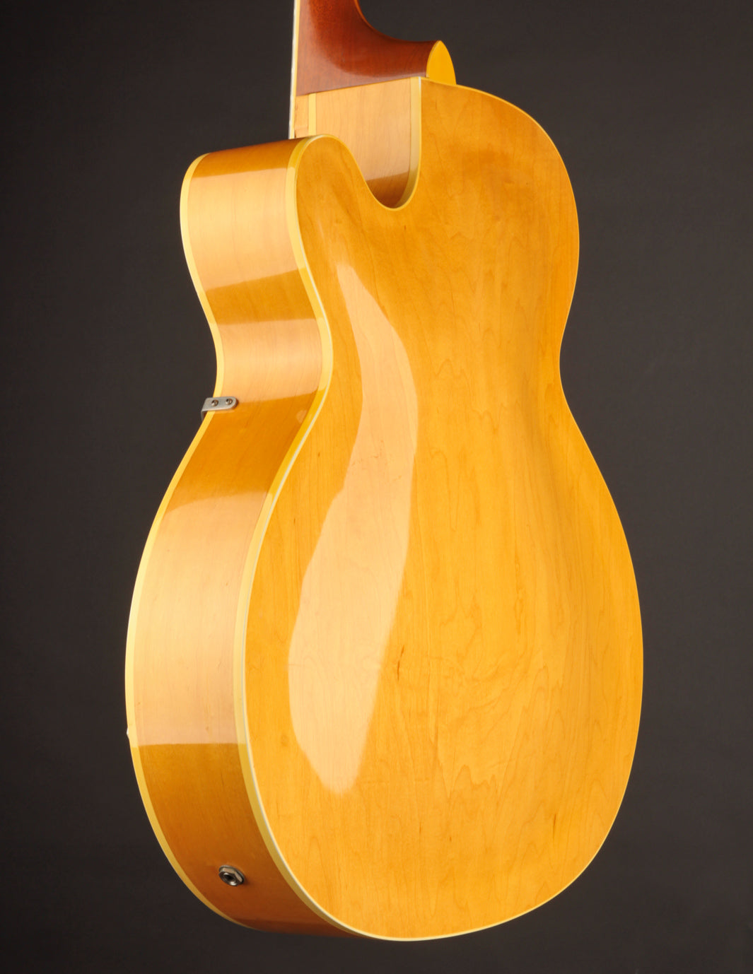 Tone and playability are excellent as you might guess! The neck - a full soft V to C carve with a nice meaty taper and factory medium jumbo frets - offers an excellent playing experience. The twin NY pickups are well balanced with a distinctive top end tonality that is as responsive as the guitar is acoustically. The long scale makes for a snappy feel, which makes it great for powerful jazz tones in the neck position and a brighter, punchier tone ripe for rockabilly and swing in the bridge position.