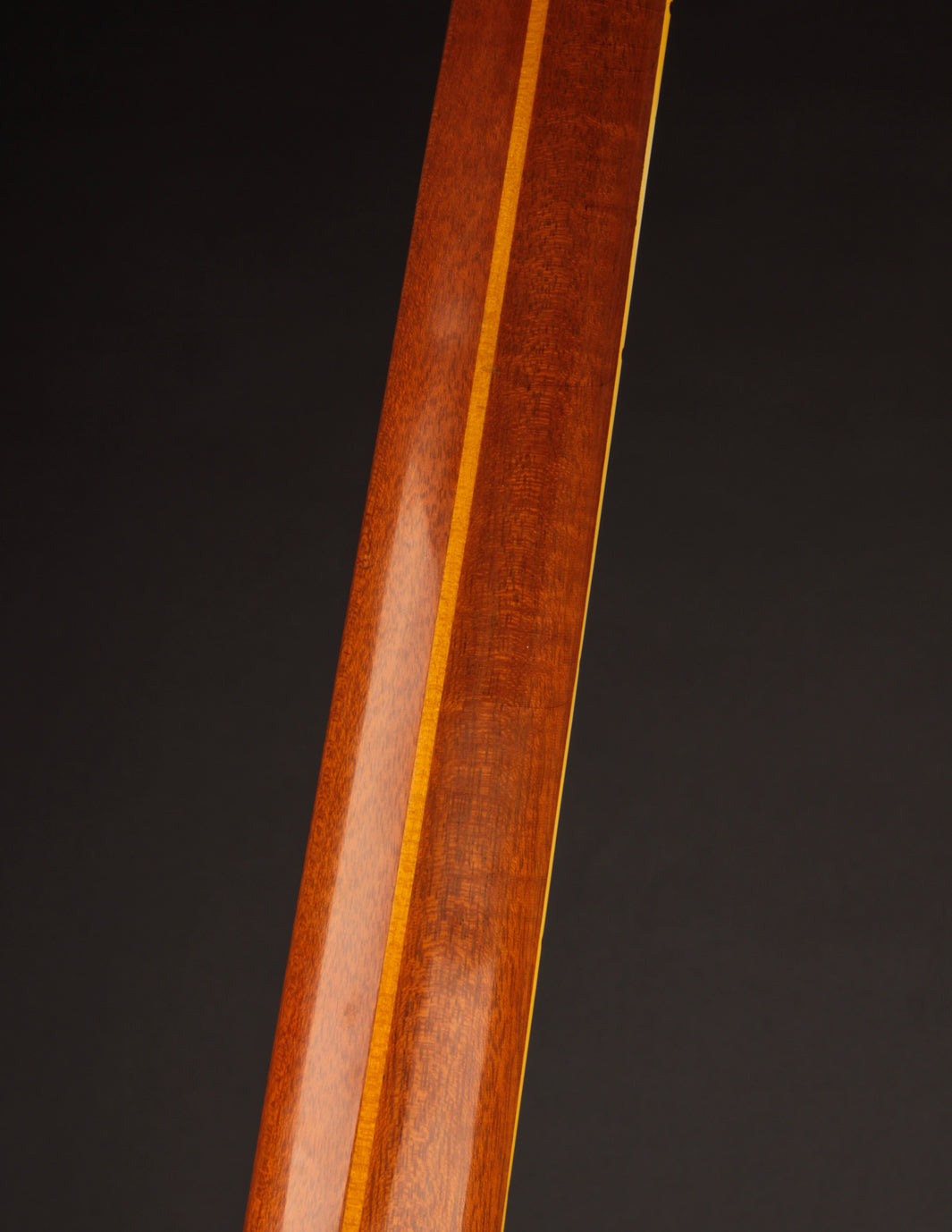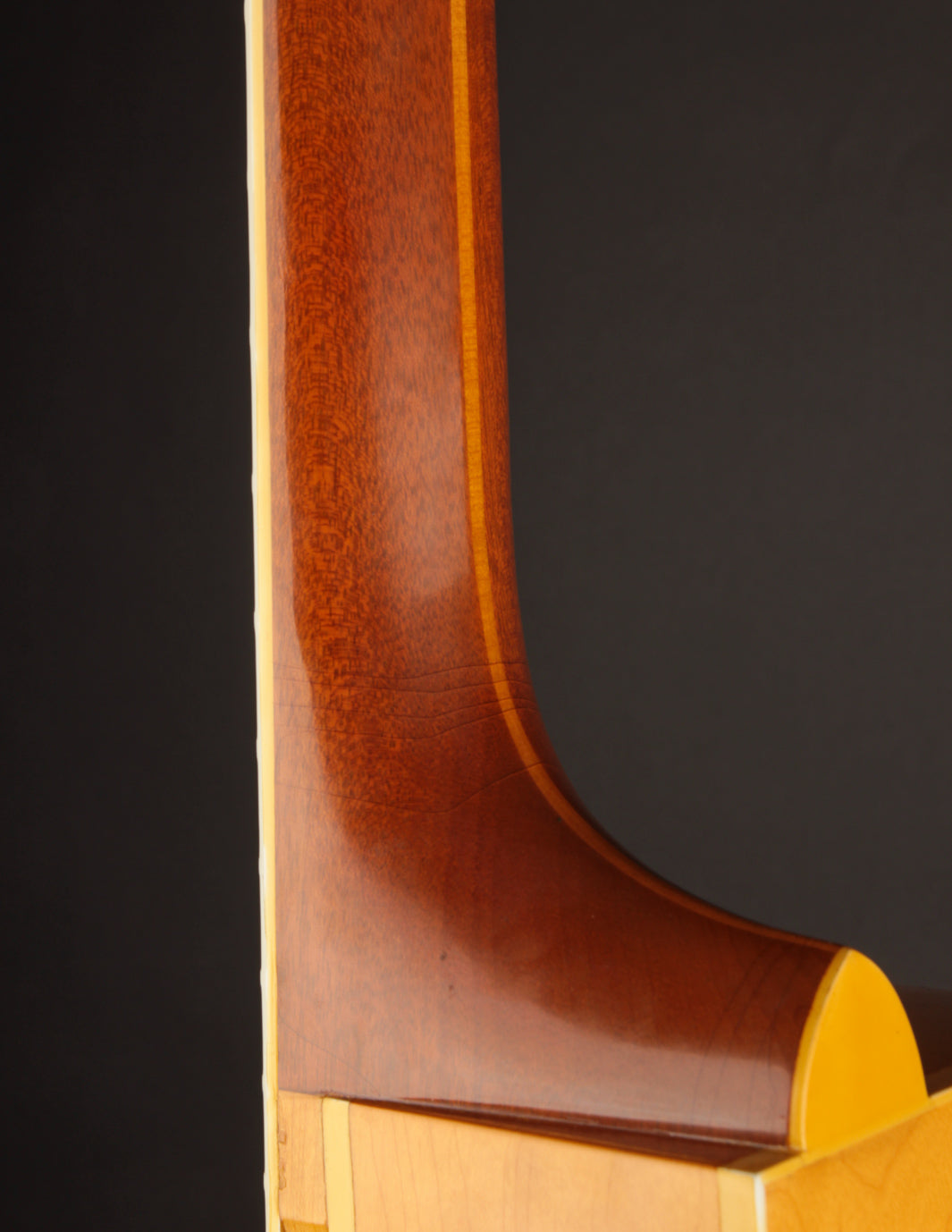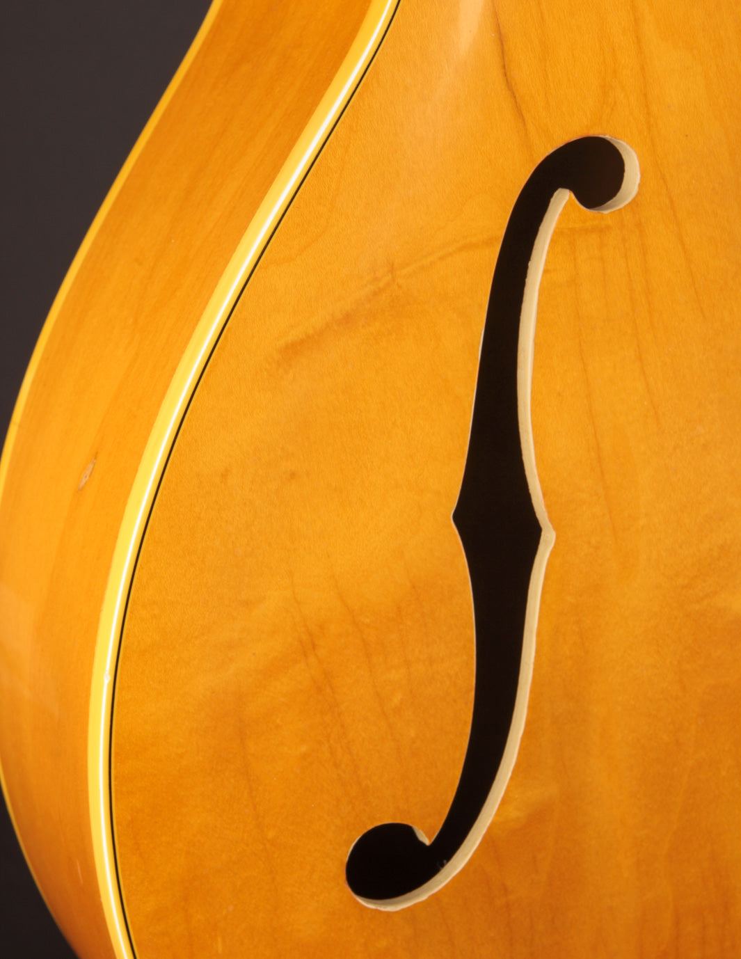 Tone and playability are excellent as you might guess! The neck - a full soft V to C carve with a nice meaty taper and factory medium jumbo frets - offers an excellent playing experience. The twin NY pickups are well balanced with a distinctive top end tonality that is as responsive as the guitar is acoustically. The long scale makes for a snappy feel, which makes it great for powerful jazz tones in the neck position and a brighter, punchier tone ripe for rockabilly and swing in the bridge position.
