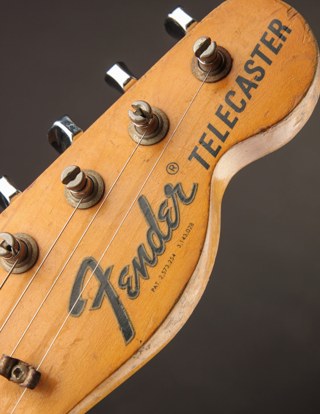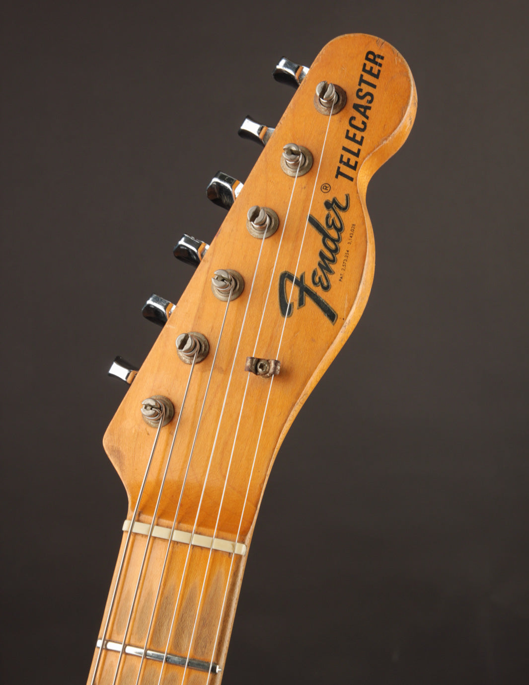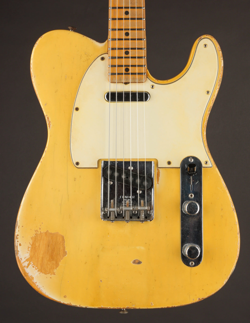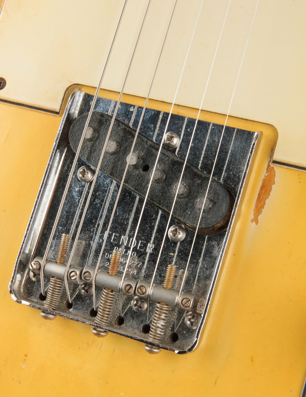 We took the opportunity to restore more of a period look to the guitar by outfitting it with a custom-ordered Spitfire pickguard (one of the best examples of their work we've ever seen, honestly) and a vintage-correct Patent Number telecaster bridge with original post-1967 saddles. The original control plate and knobs remain along with the original tuners.