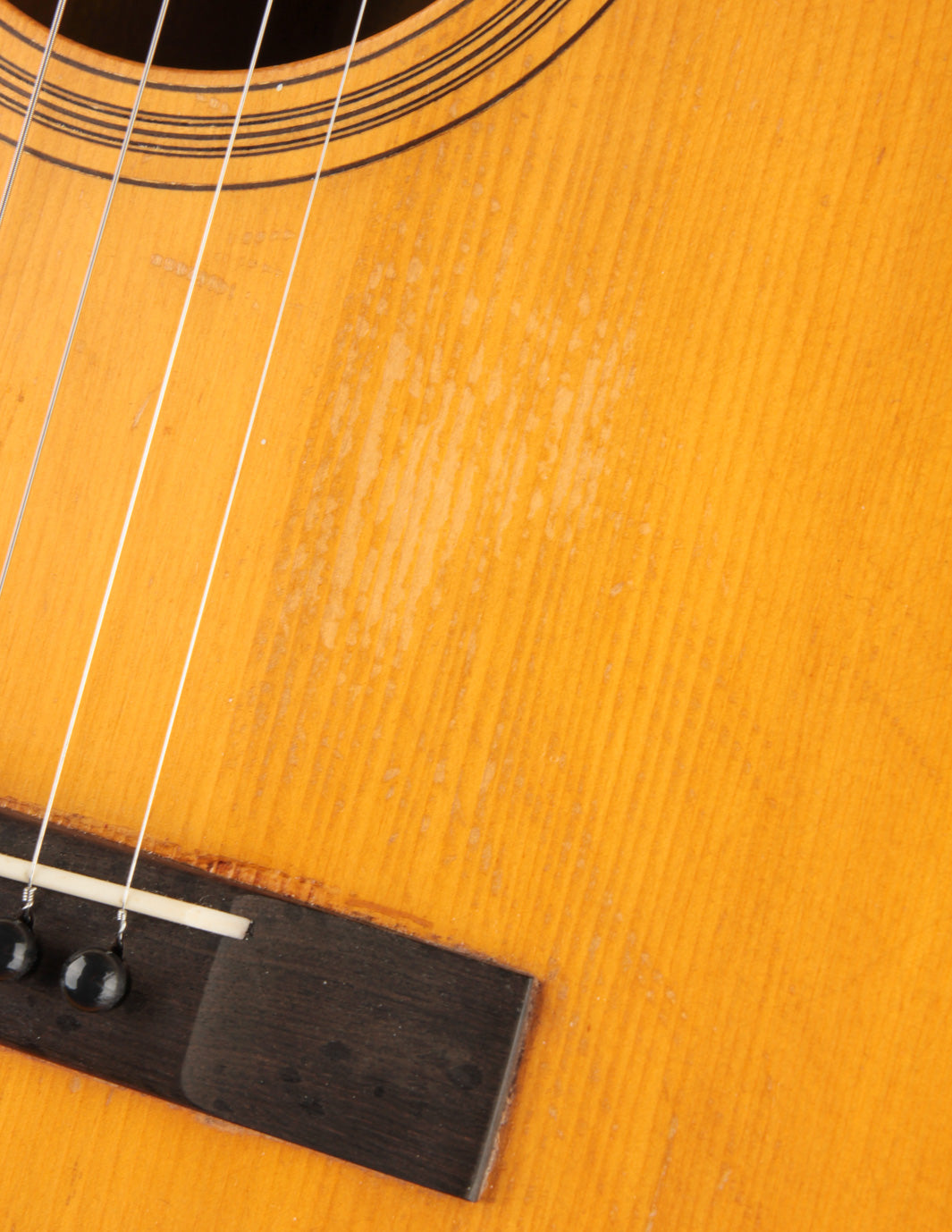 The guitar's overall condition is lovely for its age. The bridge is a replacement, made with the appropriate footprint, but all other structural components are original. There is a small amount of scattered playwear, in the form of scratches, dings, etc., but nothing glaring or off-putting. We have it strung with .011 - .052 strings, with a .012 and .016 for the high E and B respectively; and we feel that's the best combination of gauges for tone and tension combined. Priced with its original chipboard-style hard case (one latch does not function). Expedited shipping only at online checkout -- please call us for an in-hand description!