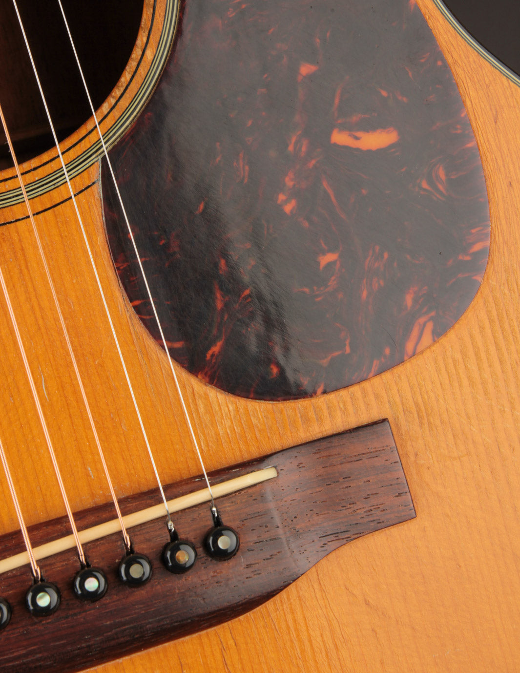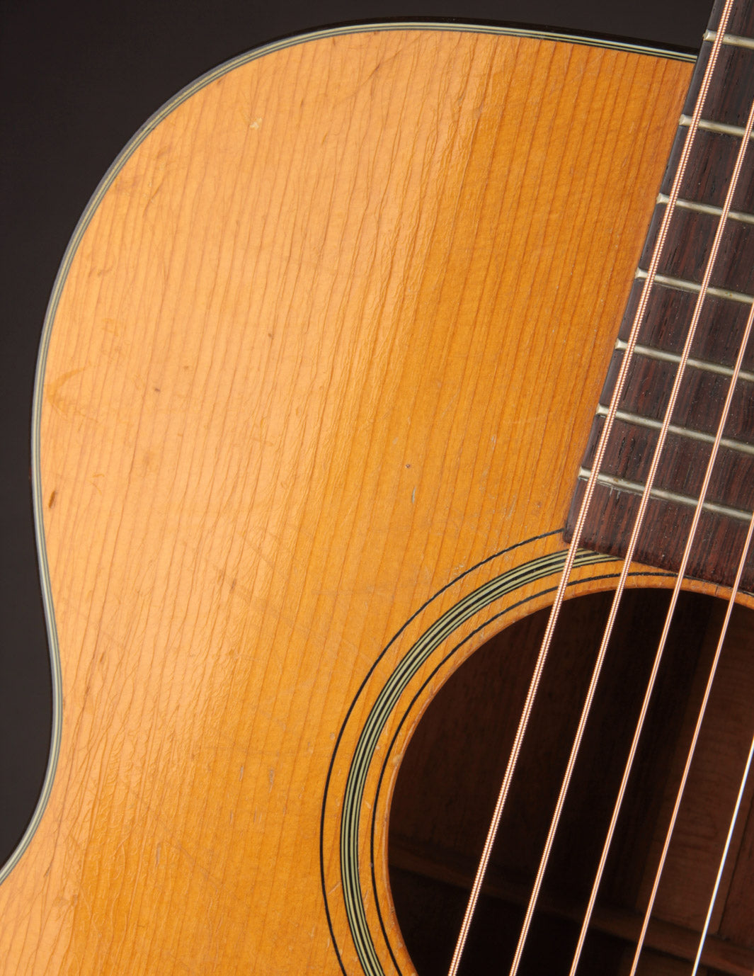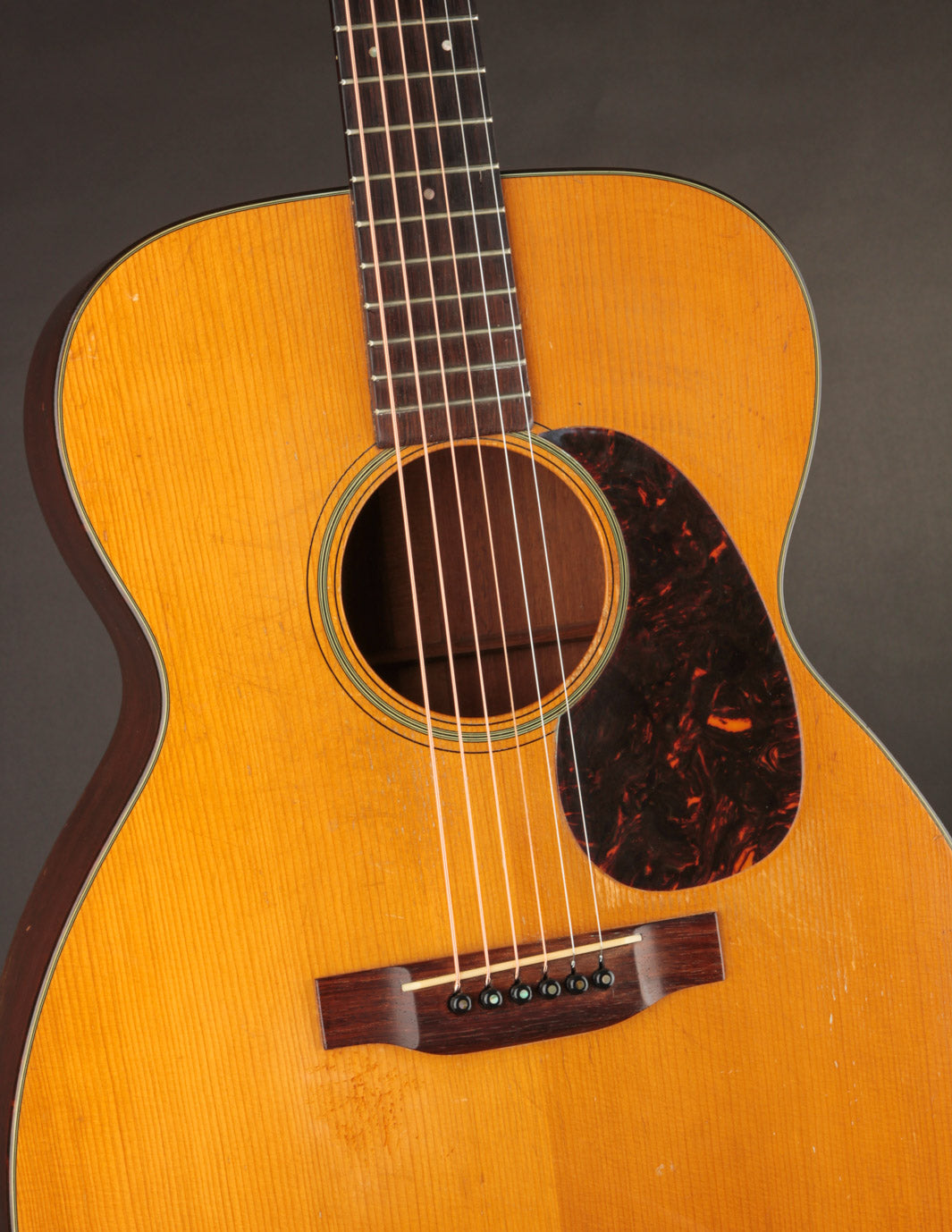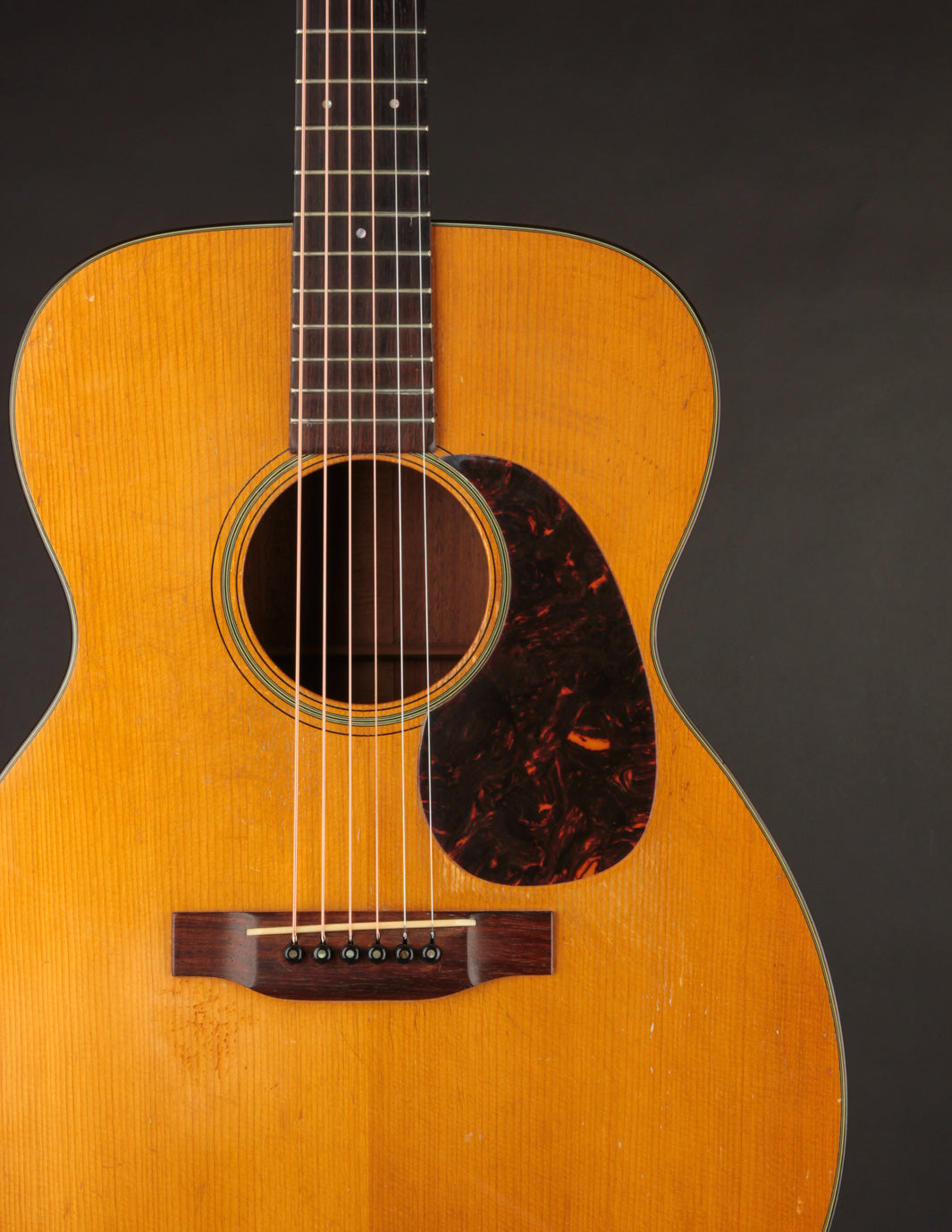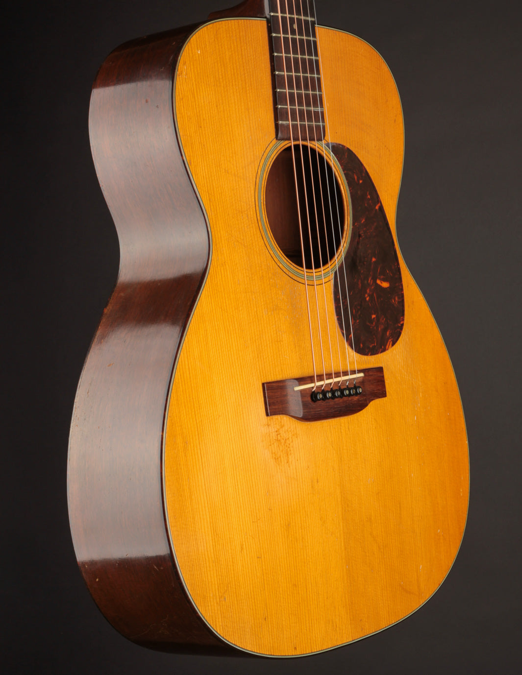 This guitar is in lovely, original condition, with just one finish touch up on the top (done by TJ Thompson). It exhibits the expected playwear and lacquer checking seen on most 80-year old Martins that have lead a life of regular gigging. The action currently sits at 4/32" on the bass side and 3/32" on the treble side under tension of light strings. These measurements may prove a tad higher than pure fingerstylists would desire, though there's adequate saddle height; and the setup can be adjusted for lower action. Price includes a contemporary Martin hardshell case. Expedited shipping required -- interested parties are invited to contact us for an in-hand description!
