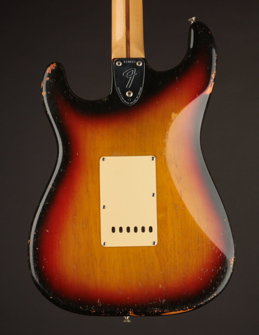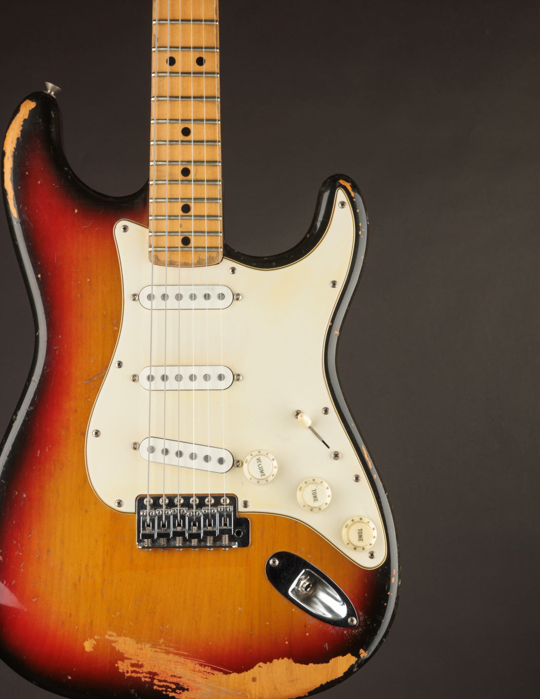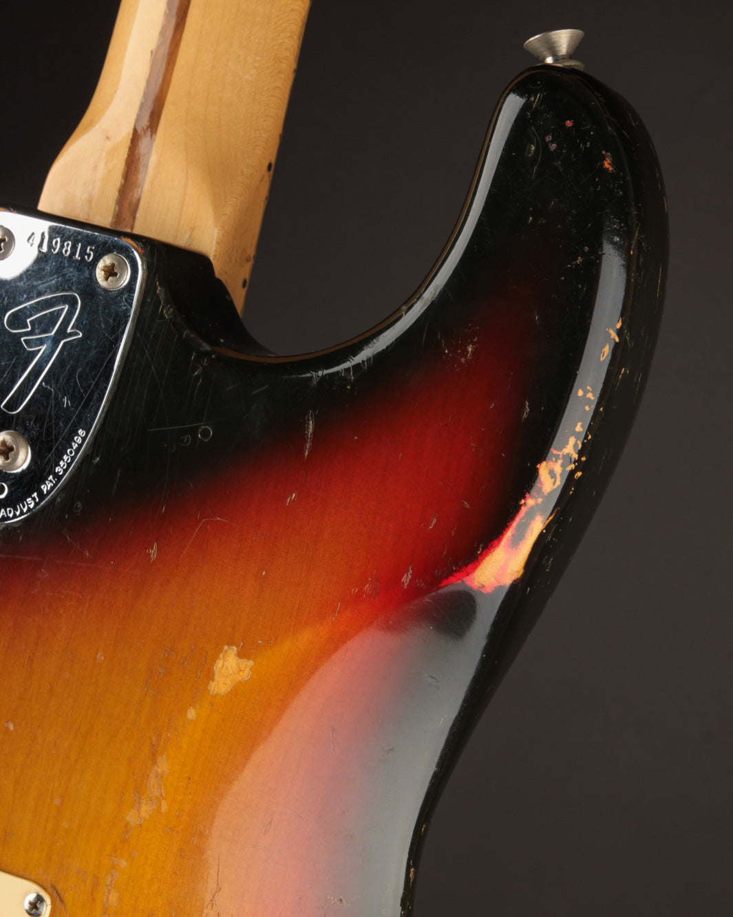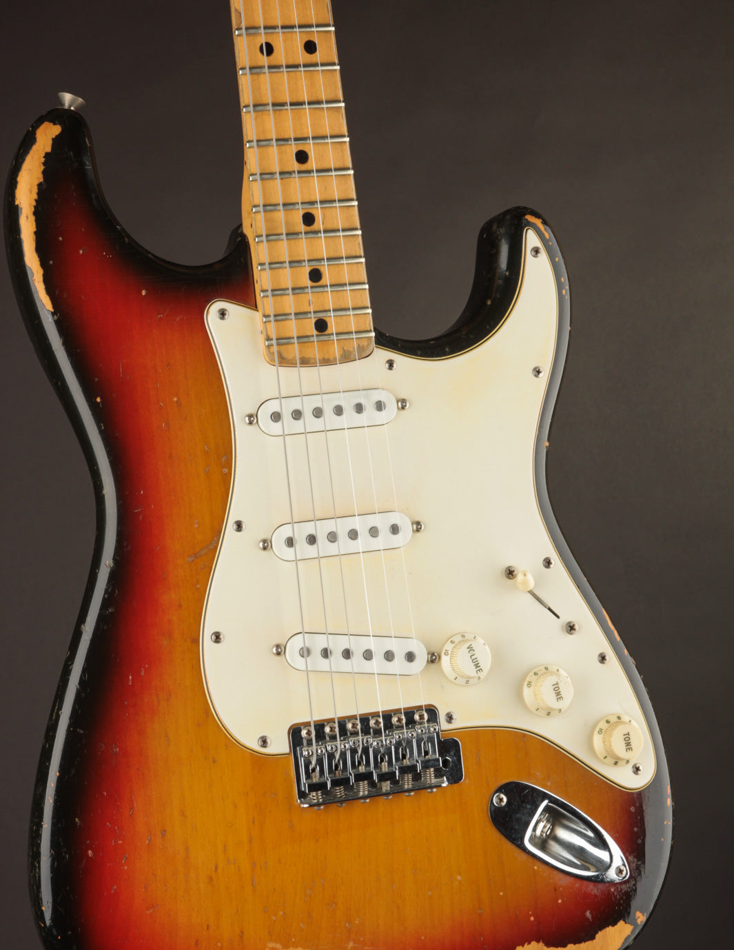The neck was refretted long ago with jumbo wire, and the original tuners replaced with Schallers. A great sounding set of Bare Knuckle grey bottom strat pickups are loaded in the guitar, while the original volume and tone pots remain, showing codes of the 10th week of '73. The switch has been upgraded to a 5-way, and the pickguard is a modern 3-ply replacement. The knobs are period correct, and the bridge and saddles appear original to the body.