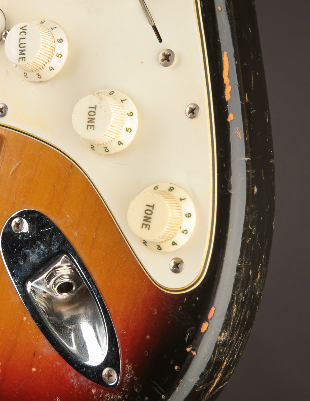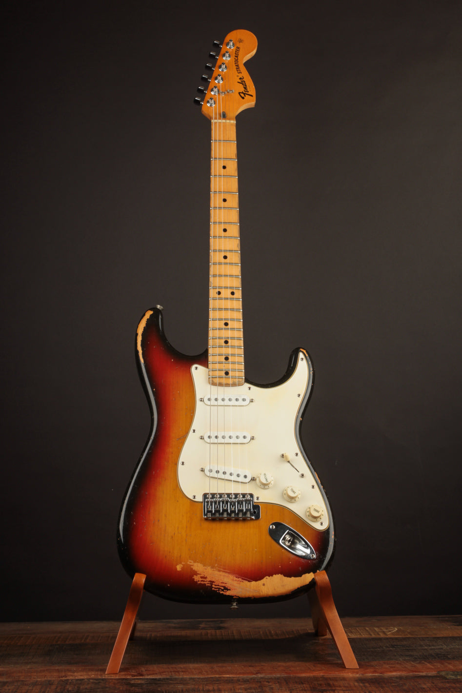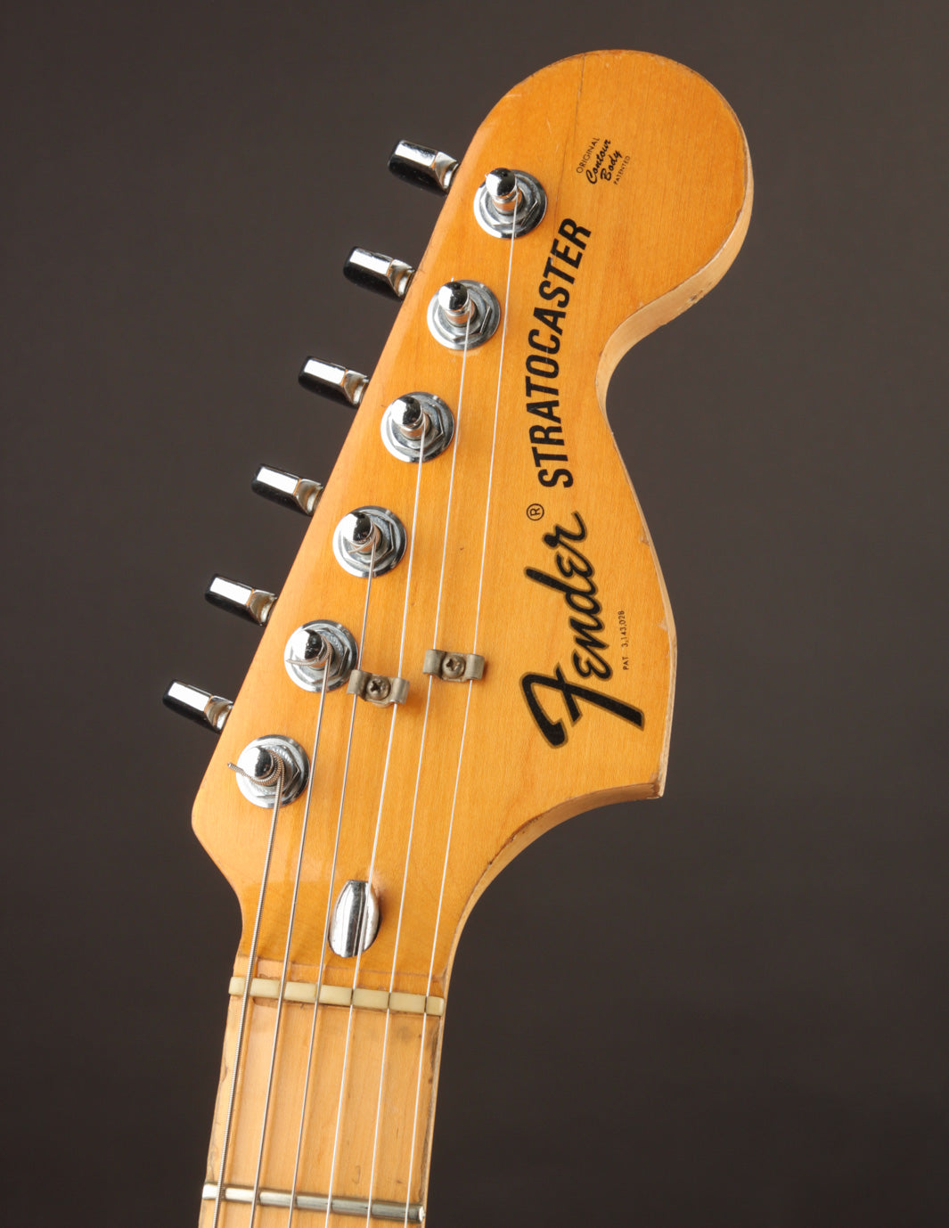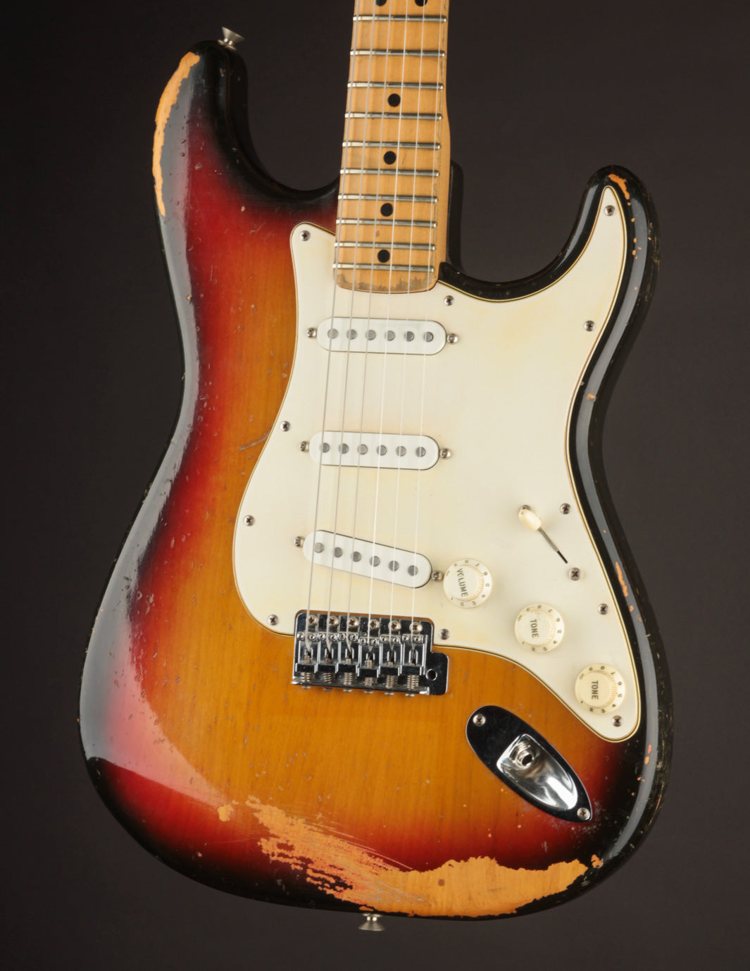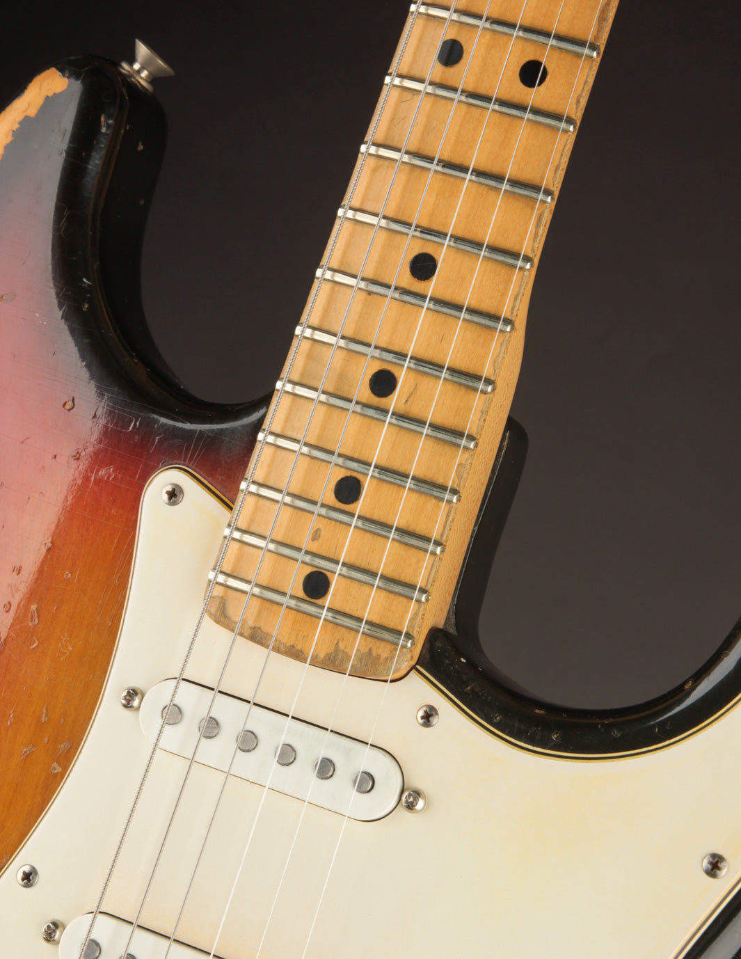 The neck was refretted long ago with jumbo wire, and the original tuners replaced with Schallers. A great sounding set of Bare Knuckle grey bottom strat pickups are loaded in the guitar, while the original volume and tone pots remain, showing codes of the 10th week of '73. The switch has been upgraded to a 5-way, and the pickguard is a modern 3-ply replacement. The knobs are period correct, and the bridge and saddles appear original to the body.