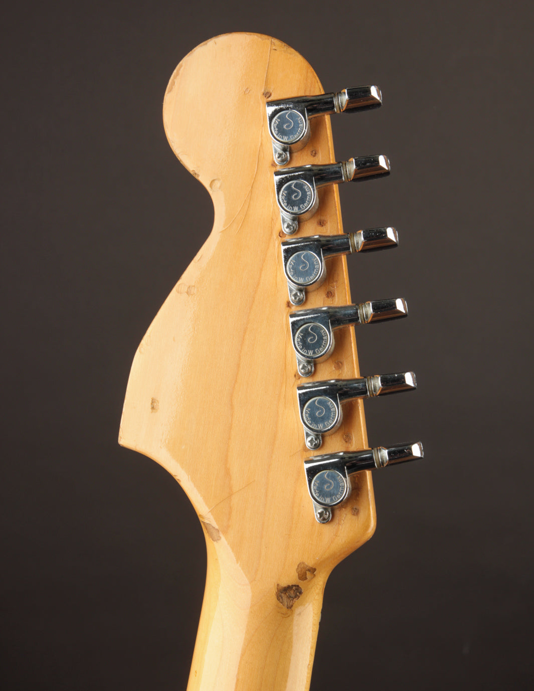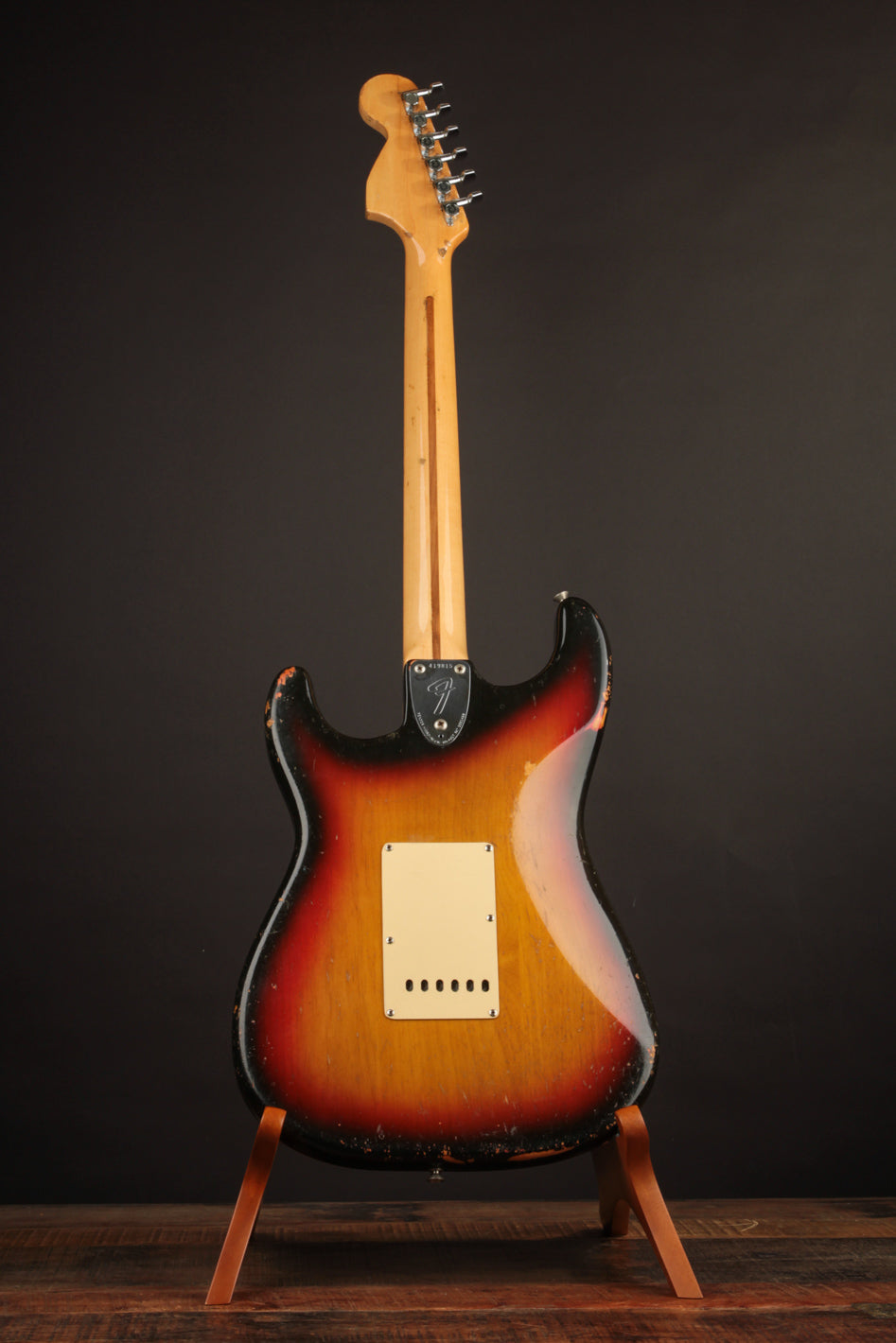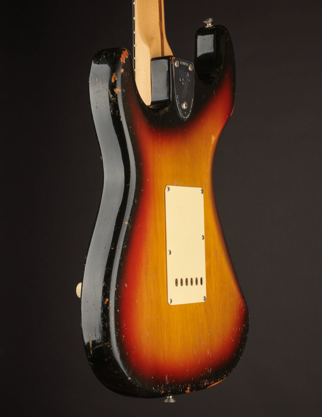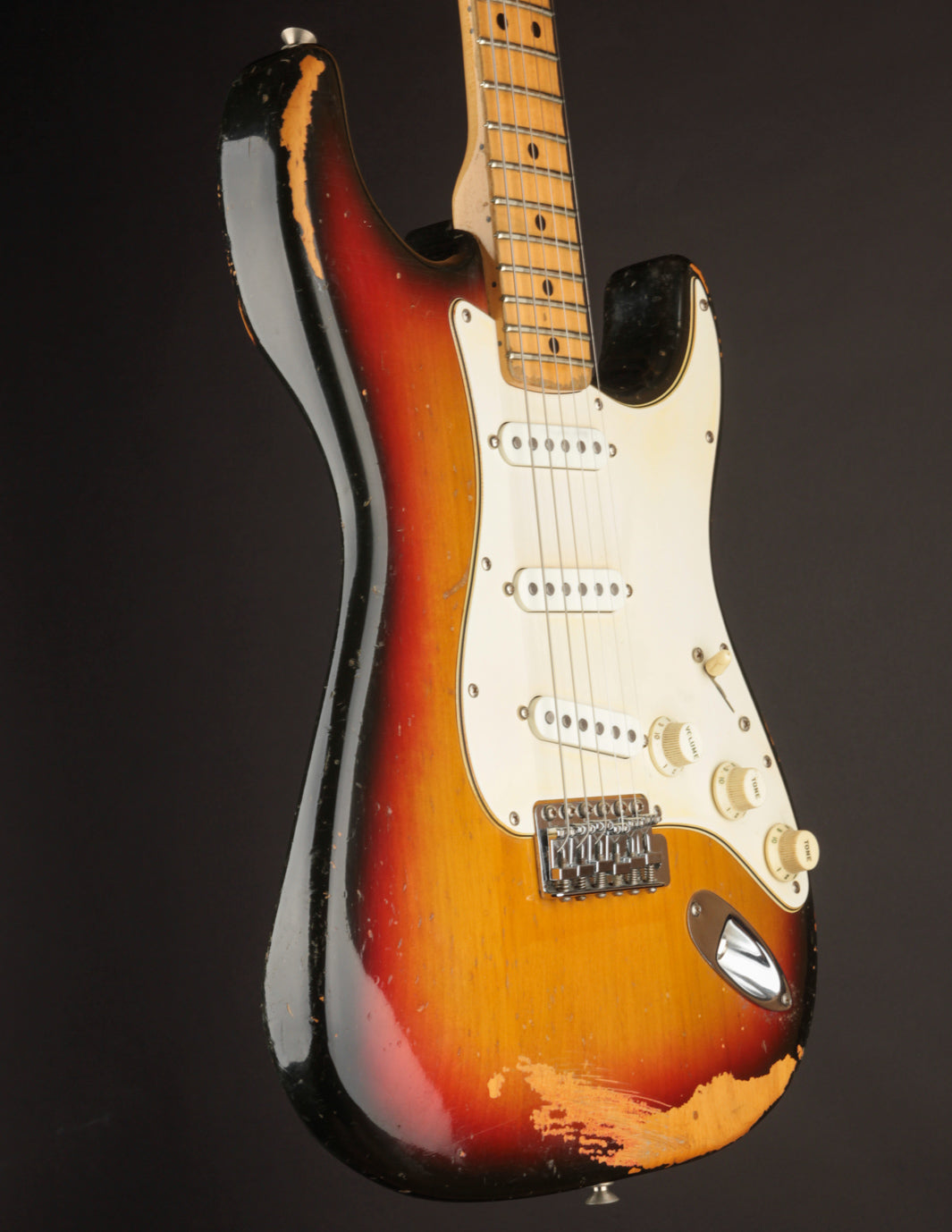 The neck was refretted long ago with jumbo wire, and the original tuners replaced with Schallers. A great sounding set of Bare Knuckle grey bottom strat pickups are loaded in the guitar, while the original volume and tone pots remain, showing codes of the 10th week of '73. The switch has been upgraded to a 5-way, and the pickguard is a modern 3-ply replacement. The knobs are period correct, and the bridge and saddles appear original to the body.