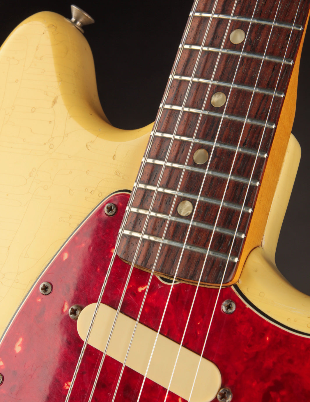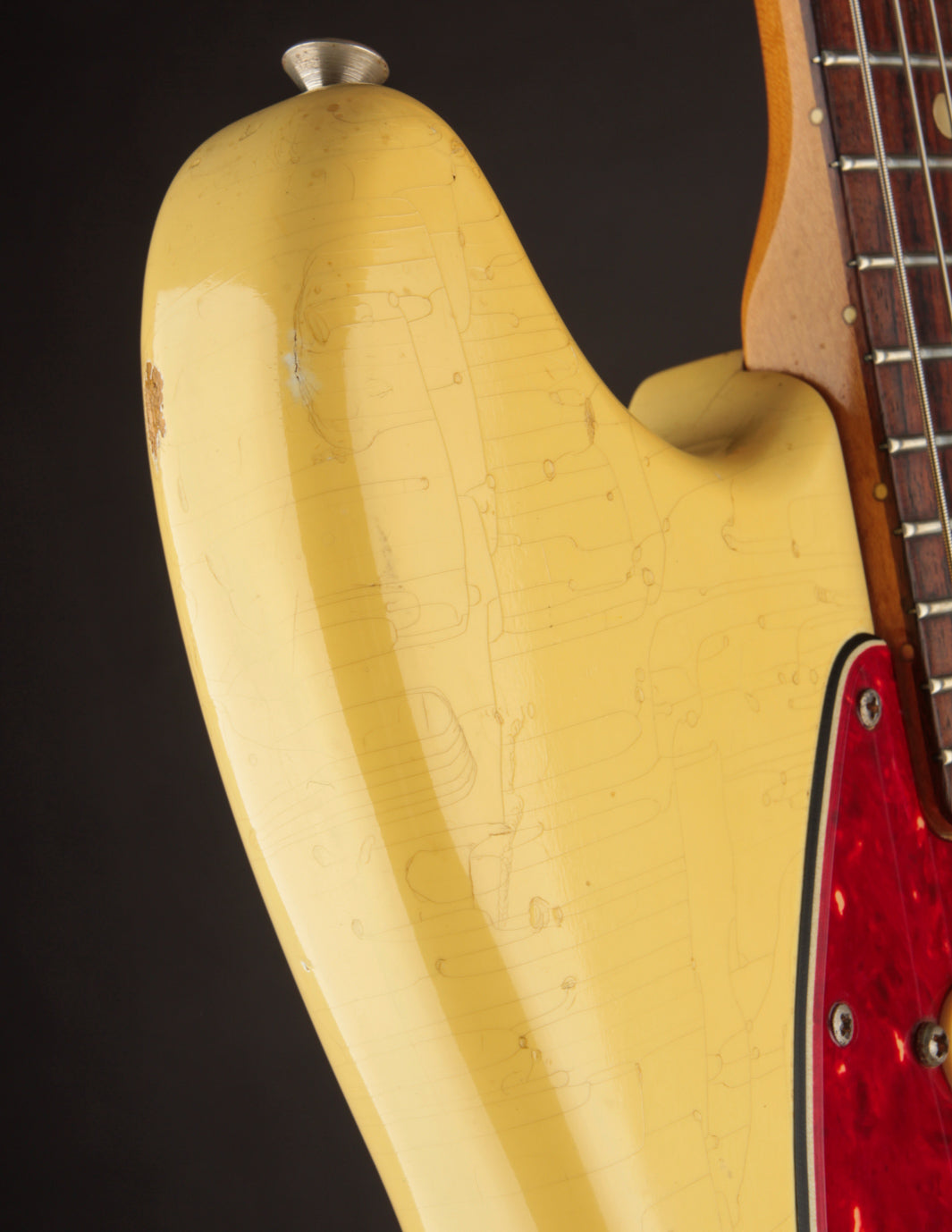 This one's got its original Olympic White finish that has some beautiful lacquer checking throughout, and nice vibrant red tortoiseshell pickguard that is crack free. The original pickup was sent out to Tom Brantley for a proper rewind and sounds great! We also added a reproduction pickup cover as the original one was not with the guitar.