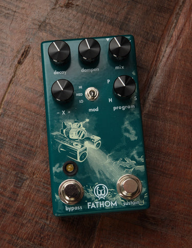 The Fathom is a feature-rich reverb with 4 different customized reverb algorithms to choose from. Easily go from tasteful, small room reverb to long, modulated trails dripping of ambient goodness. The toggle switch adds options for low, medium and high modulation. Use the dampen knob to fine tune the tone of the reverb's decay.