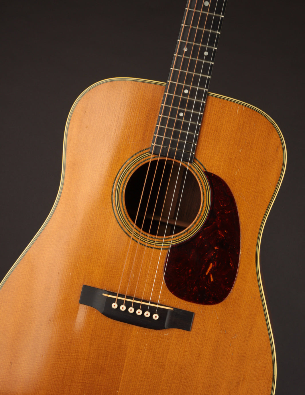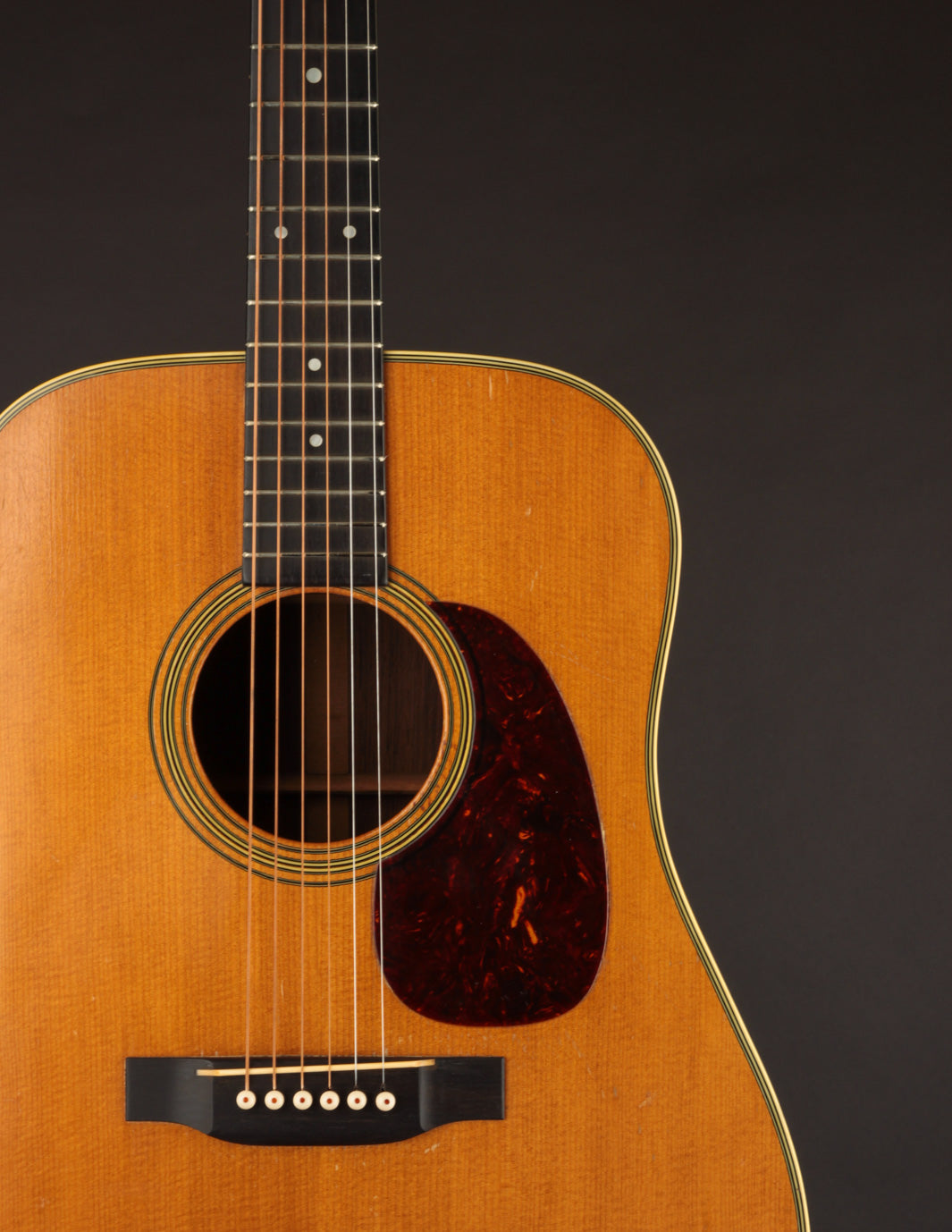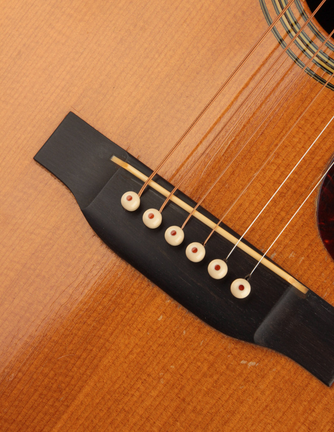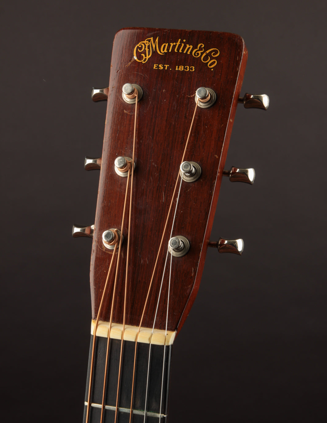 The bridge, as mentioned above, is not original; we had it expertly re-contoured, adjusted the saddle angle and, more importantly shifted the saddle forward to optimize intonation. Interesting thing about old Martins, not everything was perfect back then. The fact that this guitar was played for 70 years without anyone ever complaining about how out-of-tune it was up the neck is astounding (Snark tuners are the devil!). The saddle height is low, and, in conjunction with the guitar's mellow neck set, poses no structural concerns. New frets have also been installed, and the guitar plays beautifully up and down the neck. The action currently measures 3/32", bass side, and 2/32", treble side, under tension of medium gauge strings.