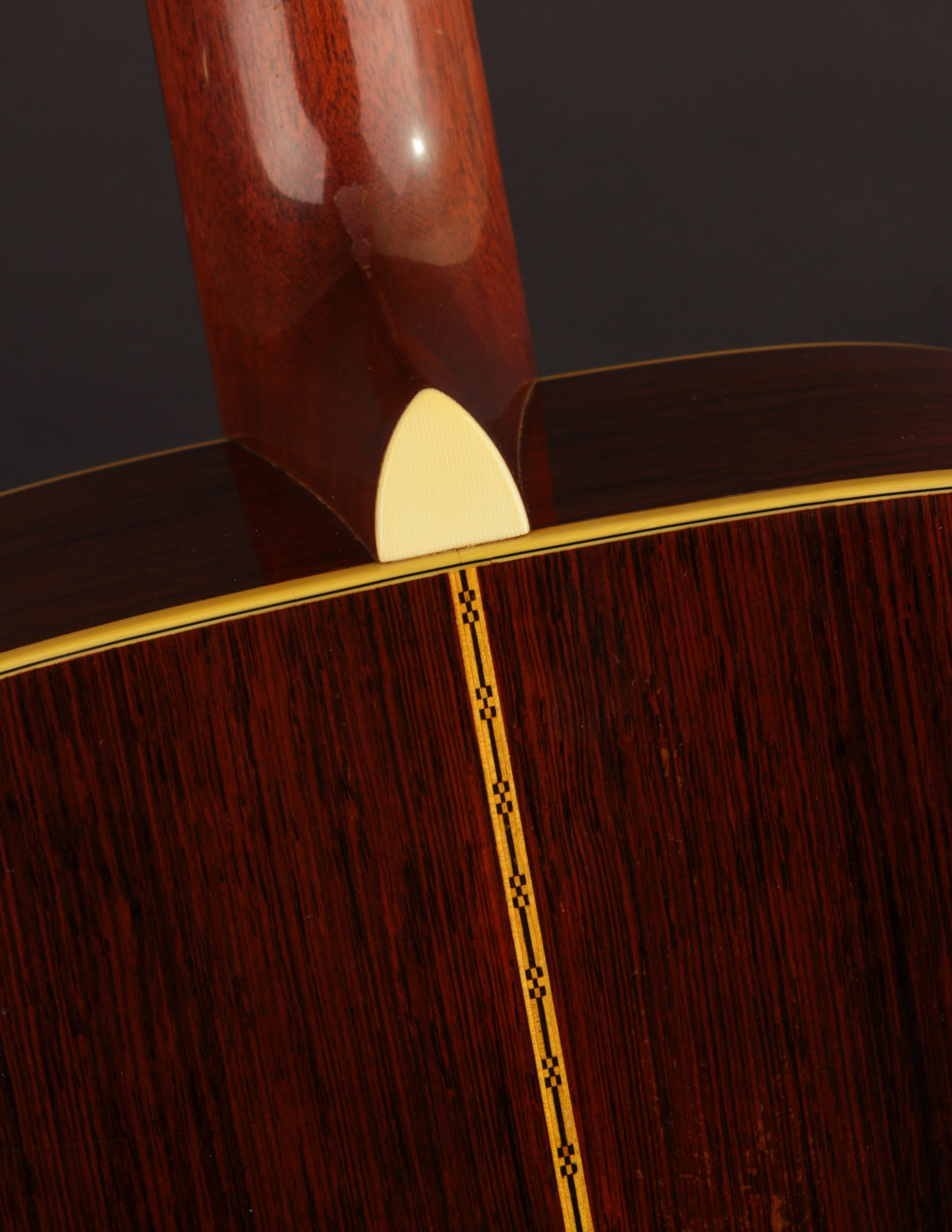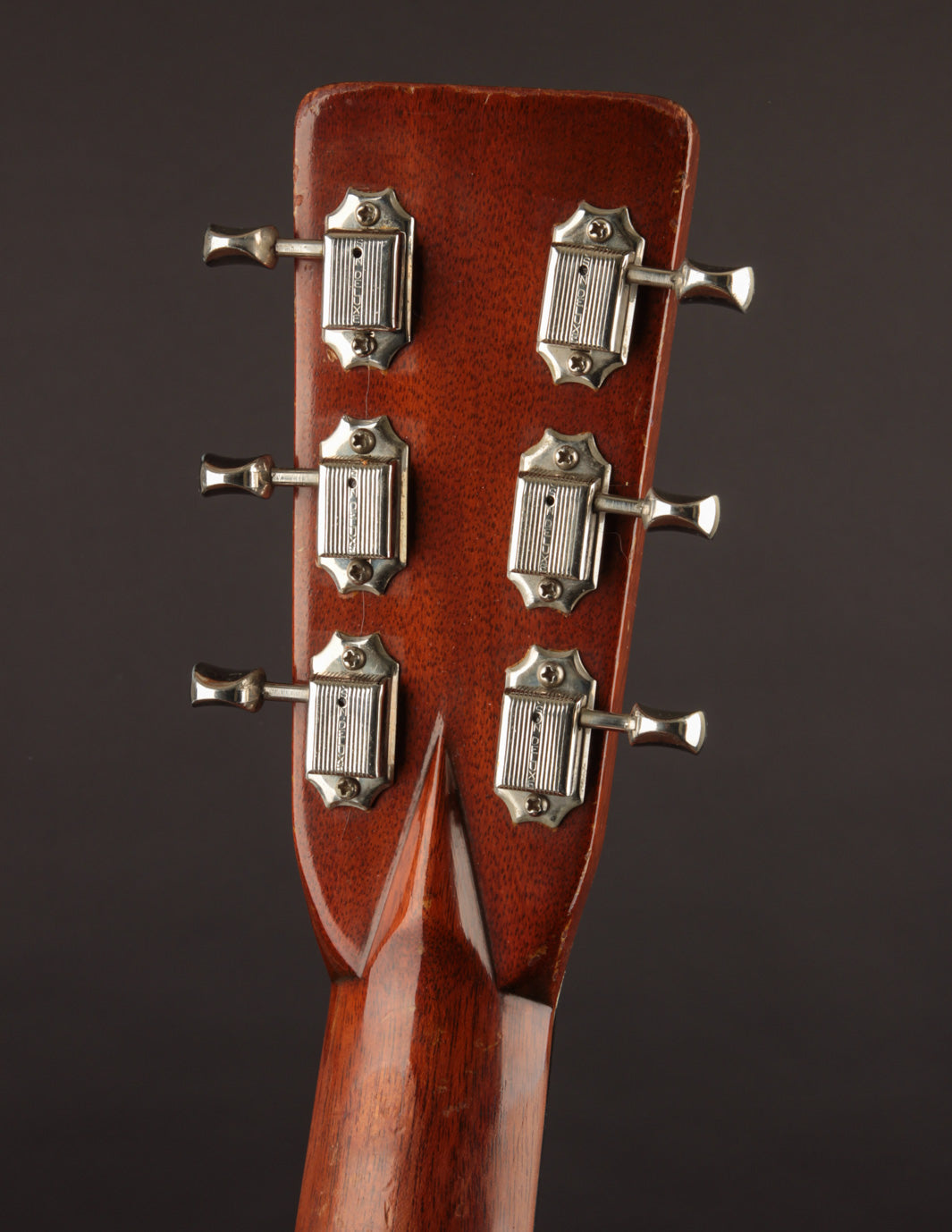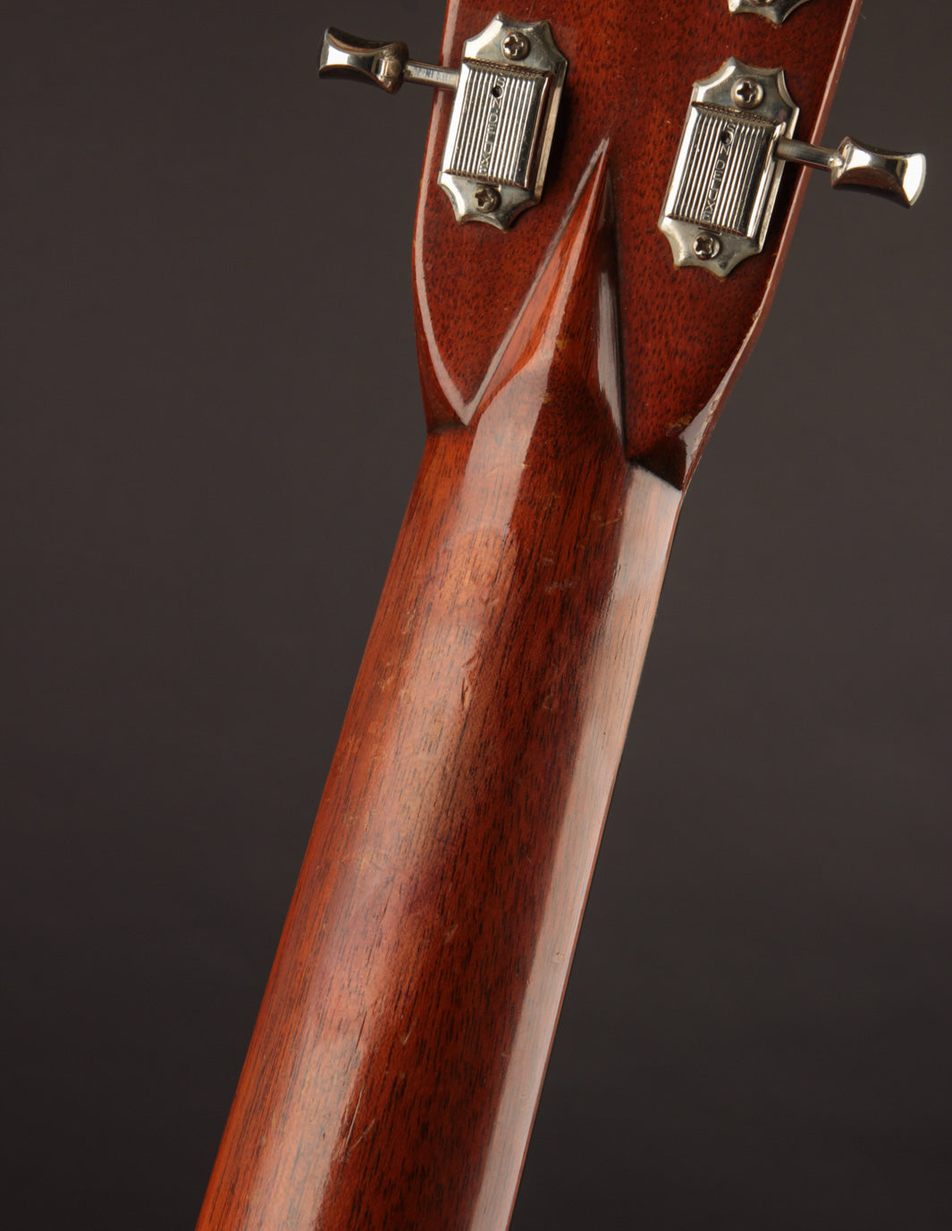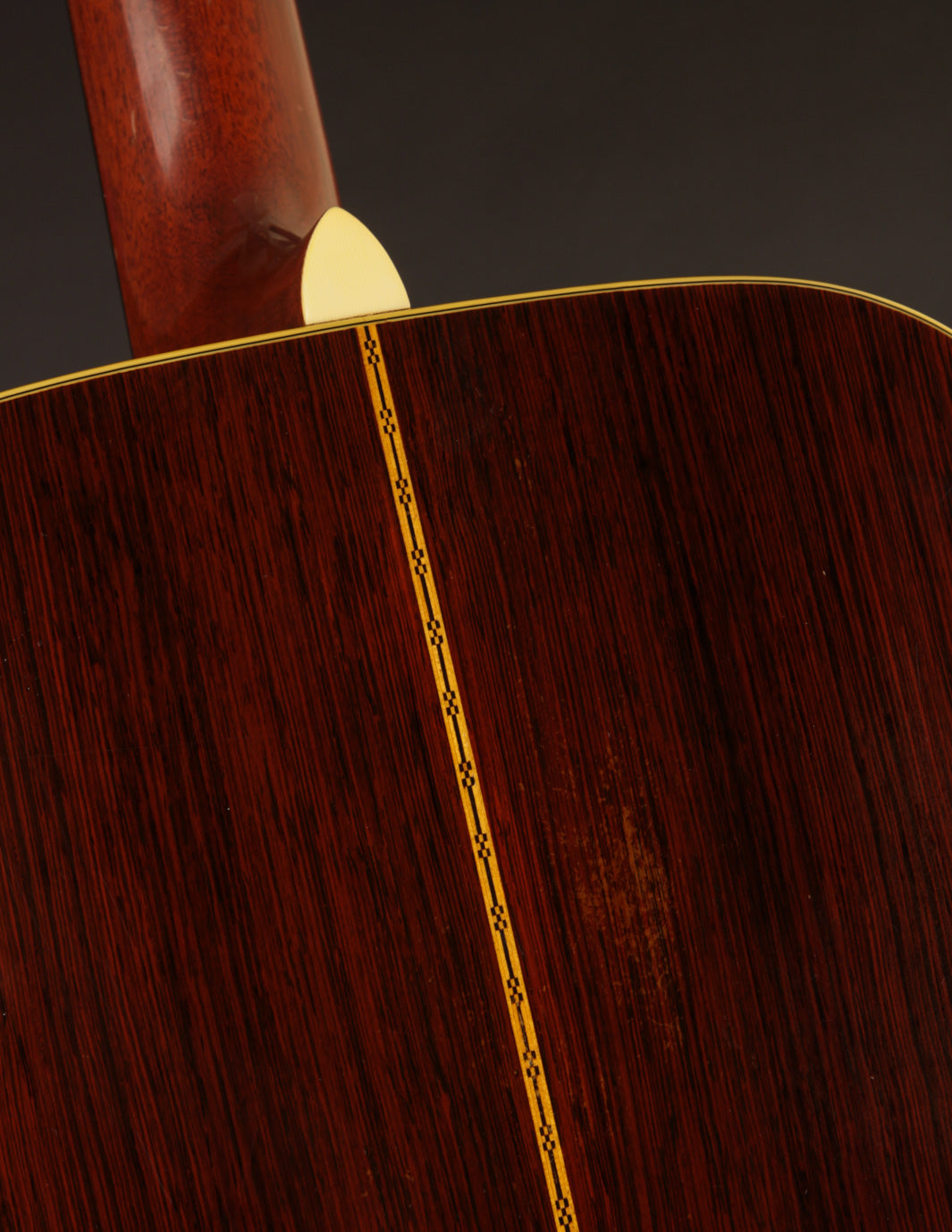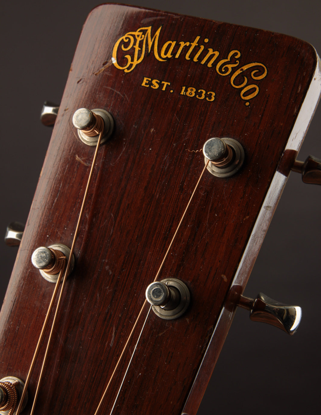 The bridge, as mentioned above, is not original; we had it expertly re-contoured, adjusted the saddle angle and, more importantly shifted the saddle forward to optimize intonation. Interesting thing about old Martins, not everything was perfect back then. The fact that this guitar was played for 70 years without anyone ever complaining about how out-of-tune it was up the neck is astounding (Snark tuners are the devil!). The saddle height is low, and, in conjunction with the guitar's mellow neck set, poses no structural concerns. New frets have also been installed, and the guitar plays beautifully up and down the neck. The action currently measures 3/32", bass side, and 2/32", treble side, under tension of medium gauge strings.