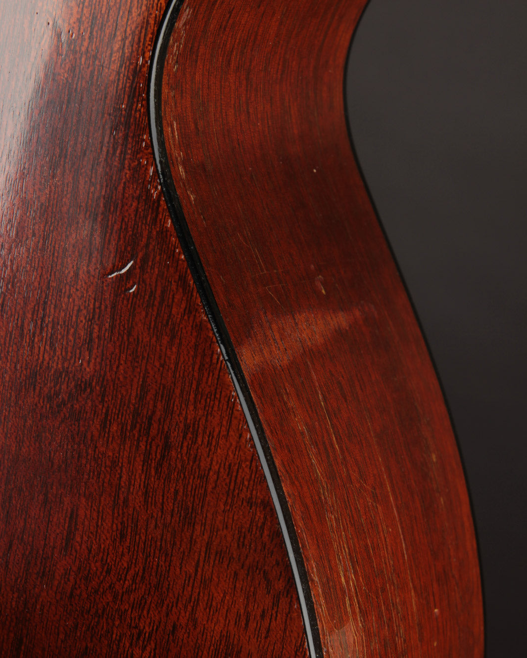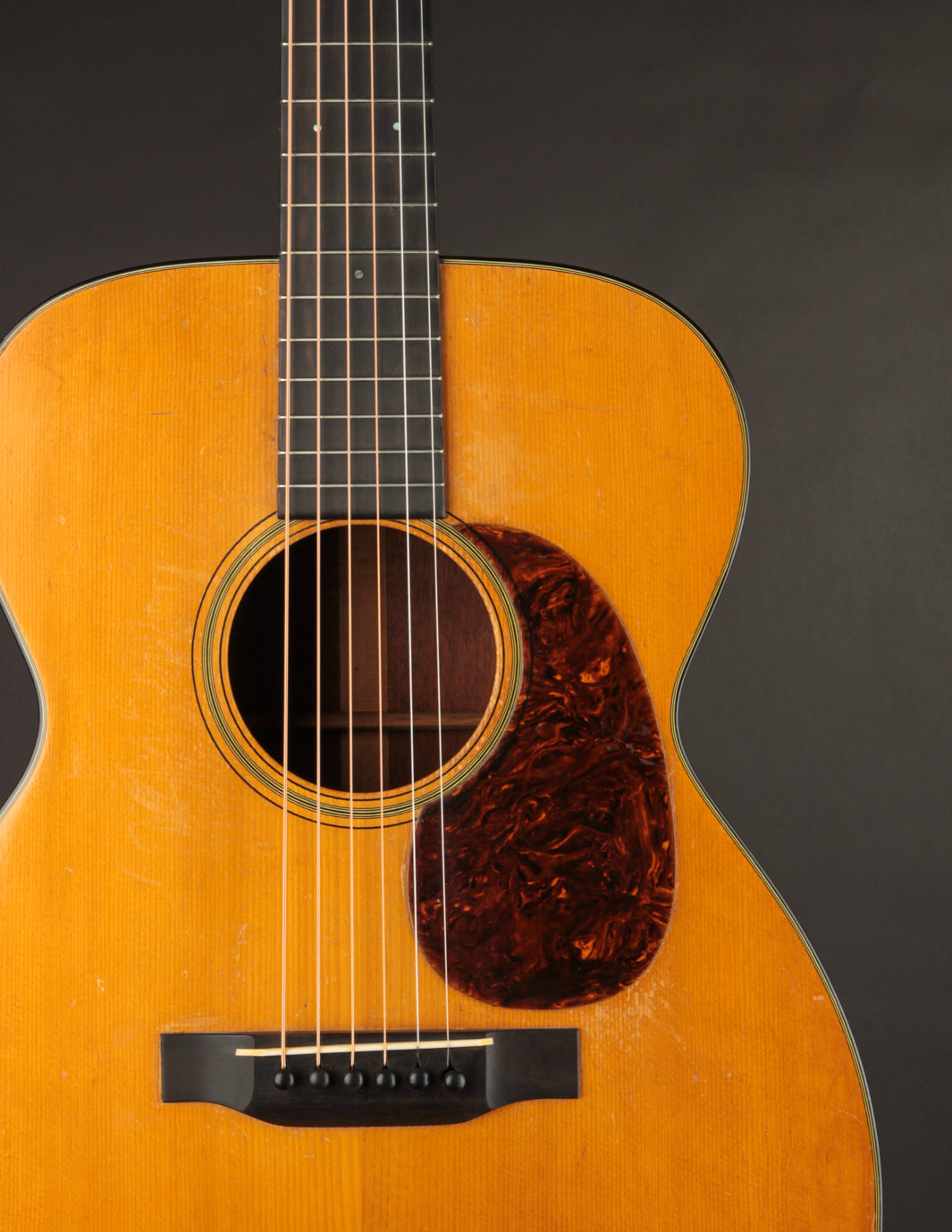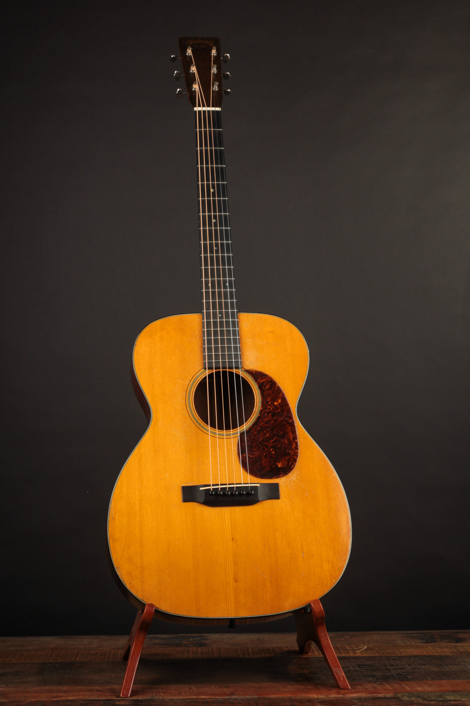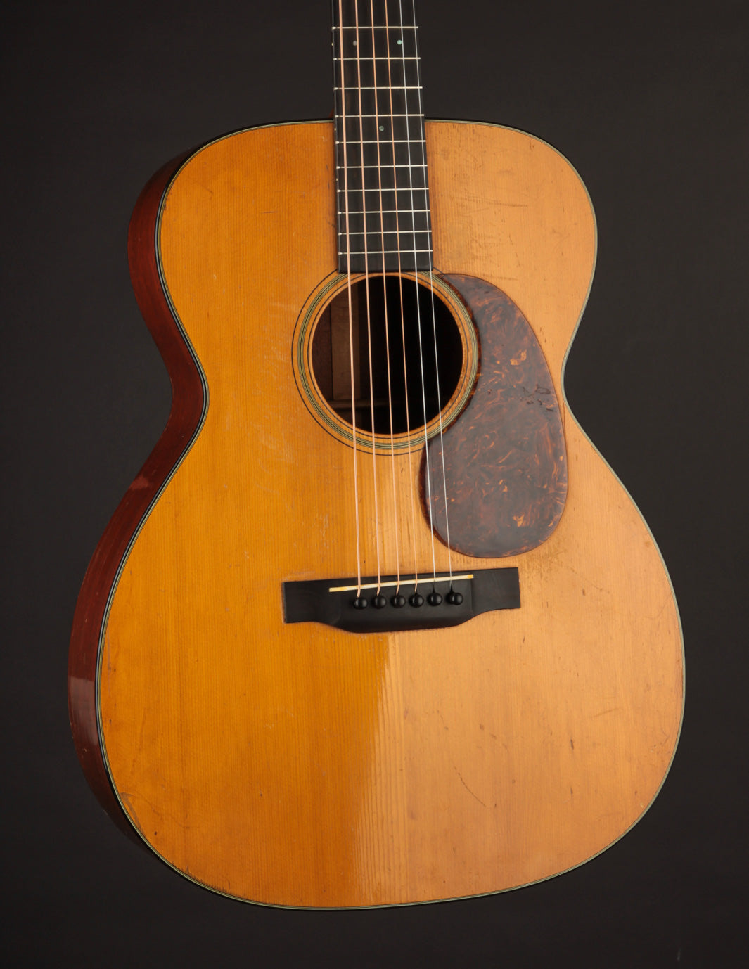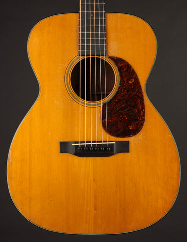 After you hear about ten seconds of the accompanying demo, we think you'll know why we love this guitar. The power, dryness, and clarity of a 1930's style-18 Martin is simply irresistible. This OM-18, serial 54584, is an excellent-sounding example of the model; which plays as easily as one of these can thanks to a refret and setup by TJ Thompson. The guitar has had a neck reset in the past, and its original bridge has been replaced. The back has been oversprayed as well, with recent antiquing of the overspray by TJ. The bridge plate and all internal components are original and healthy; and the guitar has no cracks. The takeaway here is sound & playability. We feel that the guitar's overall condition and setup make it attractive to collectors and players alike; but if you're in the camp mostly concerned with the coveted golden-era tone, this guitar gets our highest marks. Priced with Calton hardshell case. Expedited shipping is required.