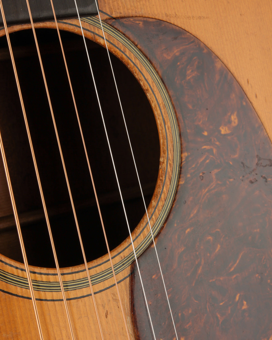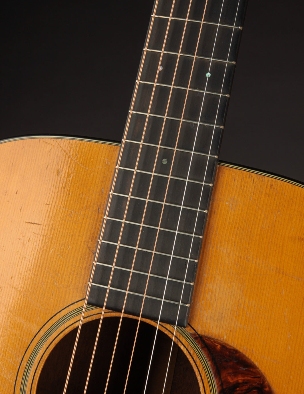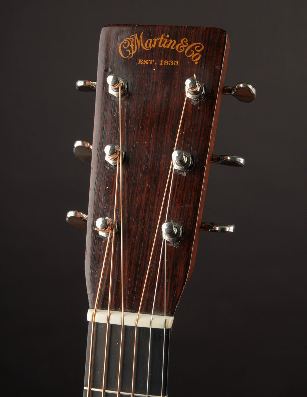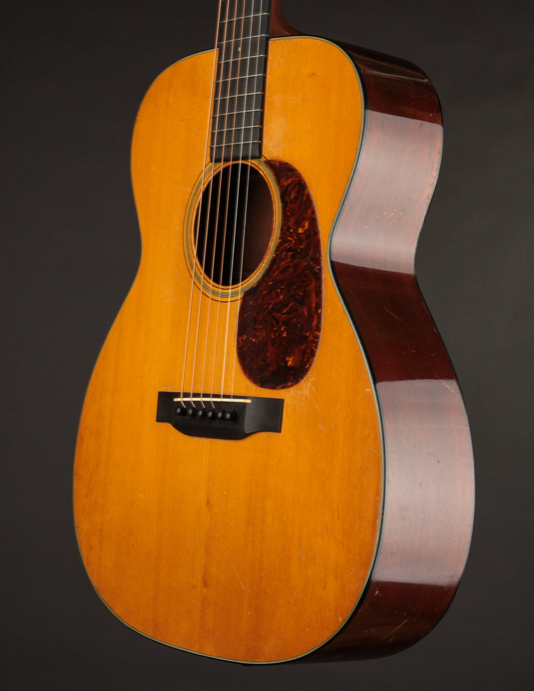 After you hear about ten seconds of the accompanying demo, we think you'll know why we love this guitar. The power, dryness, and clarity of a 1930's style-18 Martin is simply irresistible. This OM-18, serial 54584, is an excellent-sounding example of the model; which plays as easily as one of these can thanks to a refret and setup by TJ Thompson. The guitar has had a neck reset in the past, and its original bridge has been replaced. The back has been oversprayed as well, with recent antiquing of the overspray by TJ. The bridge plate and all internal components are original and healthy; and the guitar has no cracks. The takeaway here is sound & playability. We feel that the guitar's overall condition and setup make it attractive to collectors and players alike; but if you're in the camp mostly concerned with the coveted golden-era tone, this guitar gets our highest marks. Priced with Calton hardshell case. Expedited shipping is required.