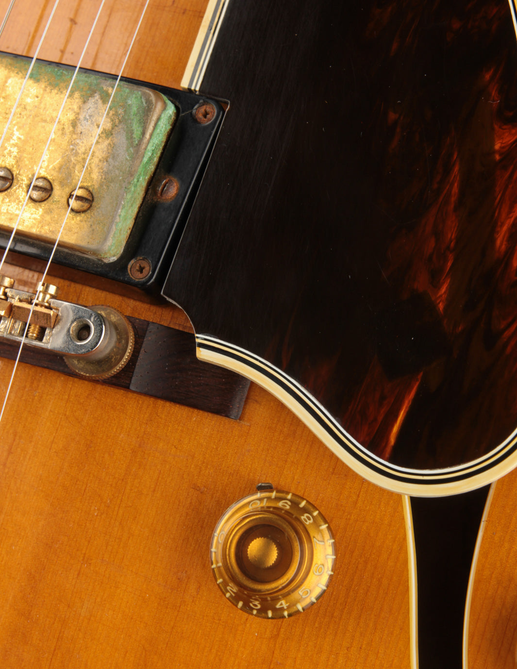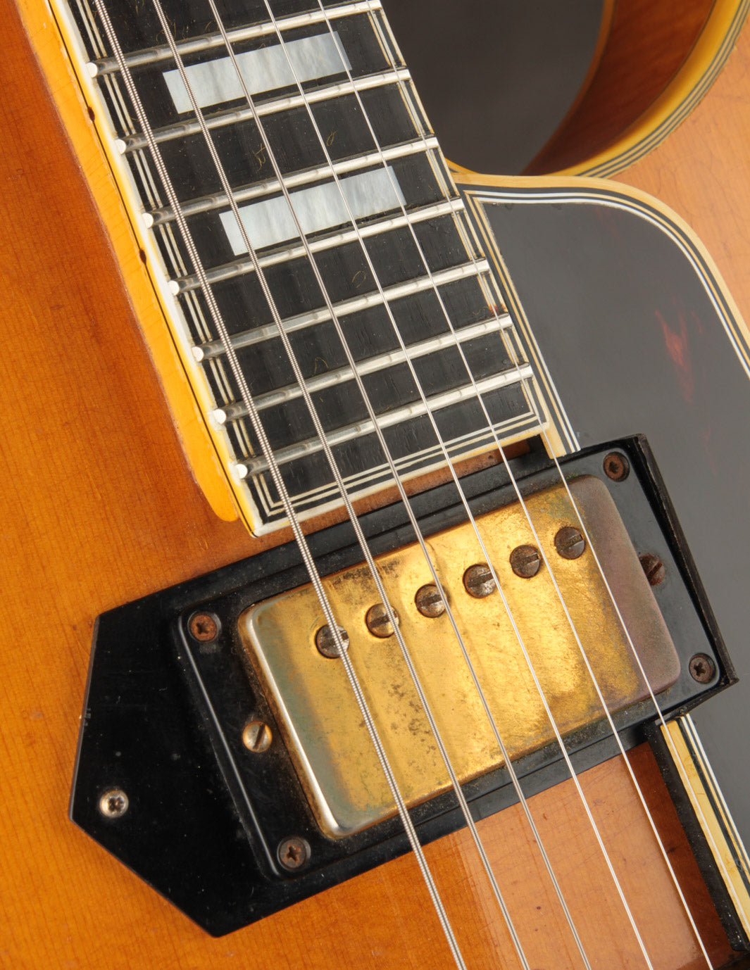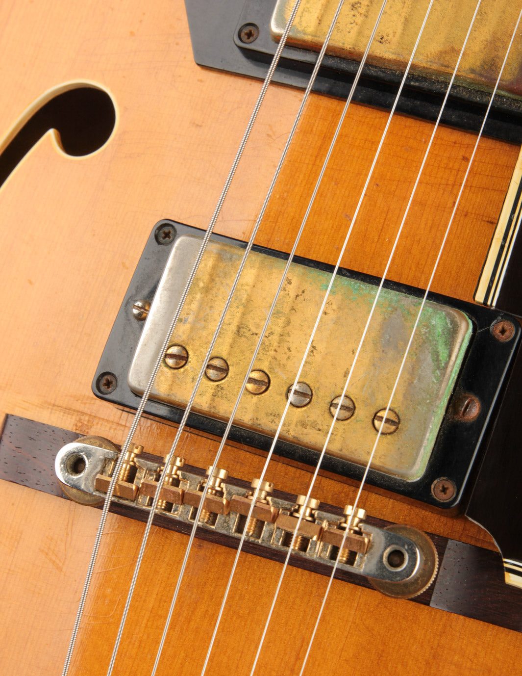 The pickguard might otherwise look fairly standard for a professional-grade electric archtop from Gibson, but this Byrdland's guard had a small custom detail that gave it that custom touch. A small cutaway on the inside bottom edge of the guard was done in what appears to be an effort to mimic the rounded edge and thumbwheel of the ABR-1 bridge. It's a minor detail but certainly puts a fine touch on this highly customized guitar. Unfortunately like many celluloid guards from this era, some off-gassing and degradation occurred. Evidence of this off-gassing can be seen on the PAF covers and on a few of the original frets closest to the guard.