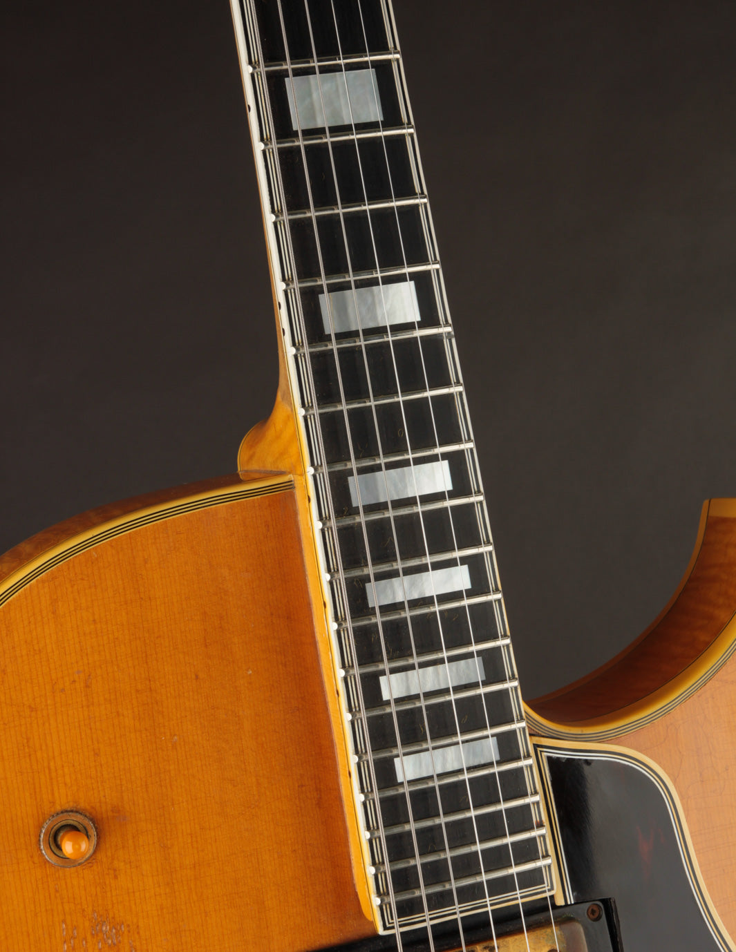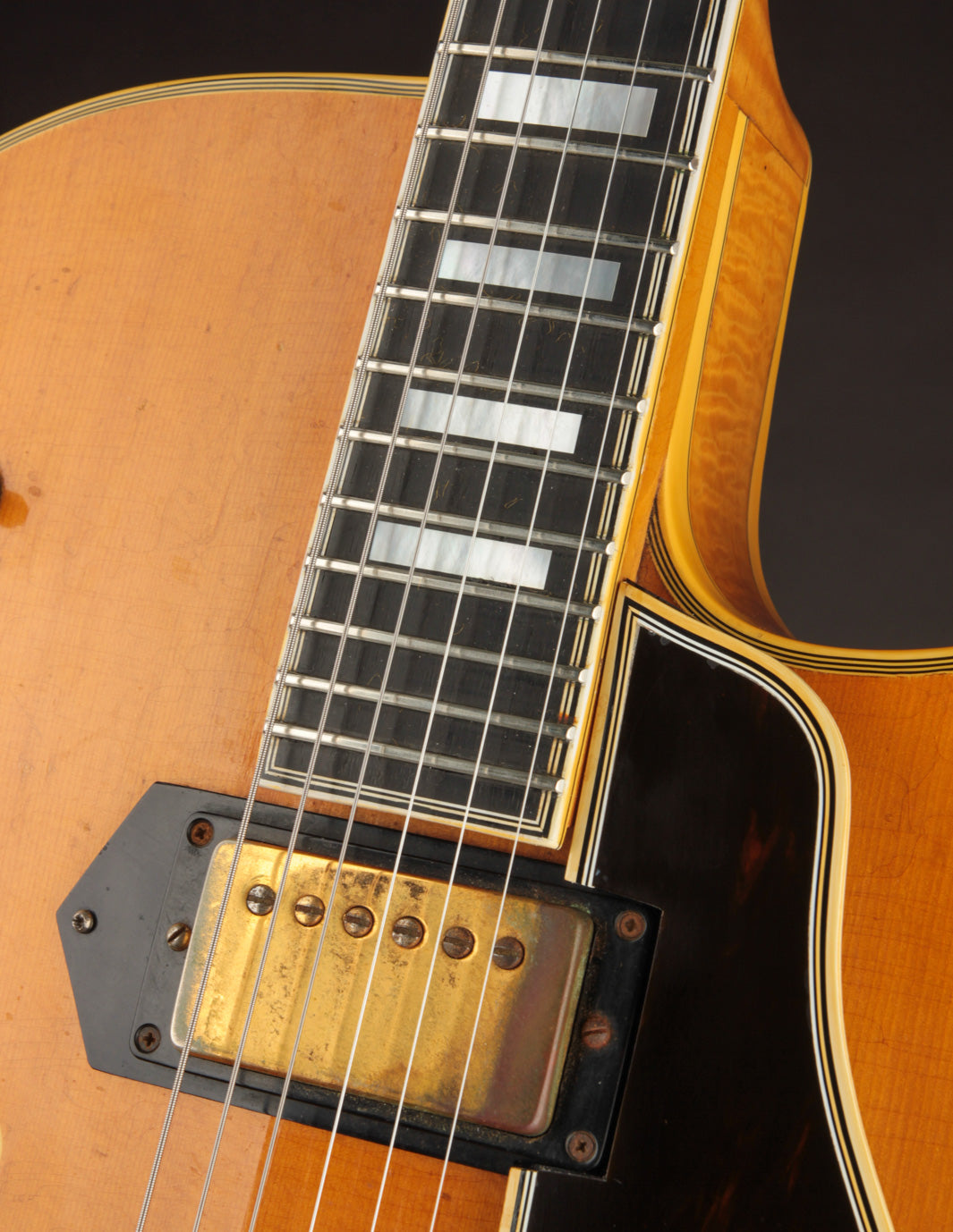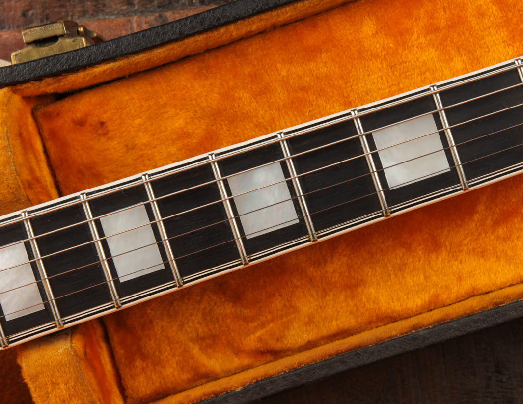 The pickguard might otherwise look fairly standard for a professional-grade electric archtop from Gibson, but this Byrdland's guard had a small custom detail that gave it that custom touch. A small cutaway on the inside bottom edge of the guard was done in what appears to be an effort to mimic the rounded edge and thumbwheel of the ABR-1 bridge. It's a minor detail but certainly puts a fine touch on this highly customized guitar. Unfortunately like many celluloid guards from this era, some off-gassing and degradation occurred. Evidence of this off-gassing can be seen on the PAF covers and on a few of the original frets closest to the guard.