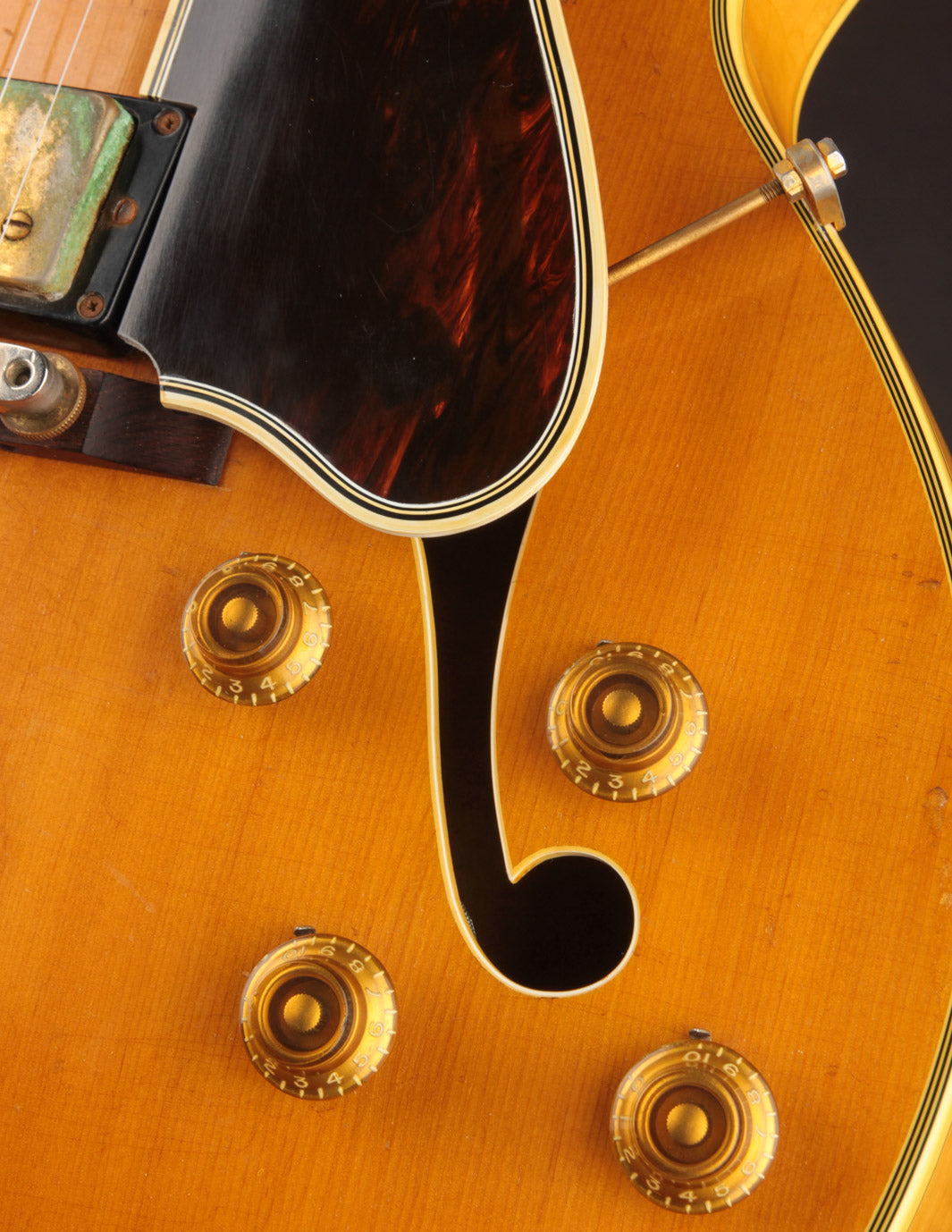Upon meticulous inspection we determined that this Byrdland left the factory with a gold-plated Bigsby B6 tailpiece installed. Beyond the mounting hole profile on the lower center rim of the guitar, there's light impressions of where the arm hinge base once sat, along with the scooped edge at the top of the base. Unable to source this extremely rare Bigsby tailpiece, we successfully installed an original Byrdland tailpiece in its place. It looks perfect on the guitar! The bridge is an original Gibson no-wire gold plated ABR-1 with original Rosewood base and a replacement set of Area59 milled brass saddles from Crazyparts. The knobs are the original amber bonnet variety and the toggle switch tip is original.