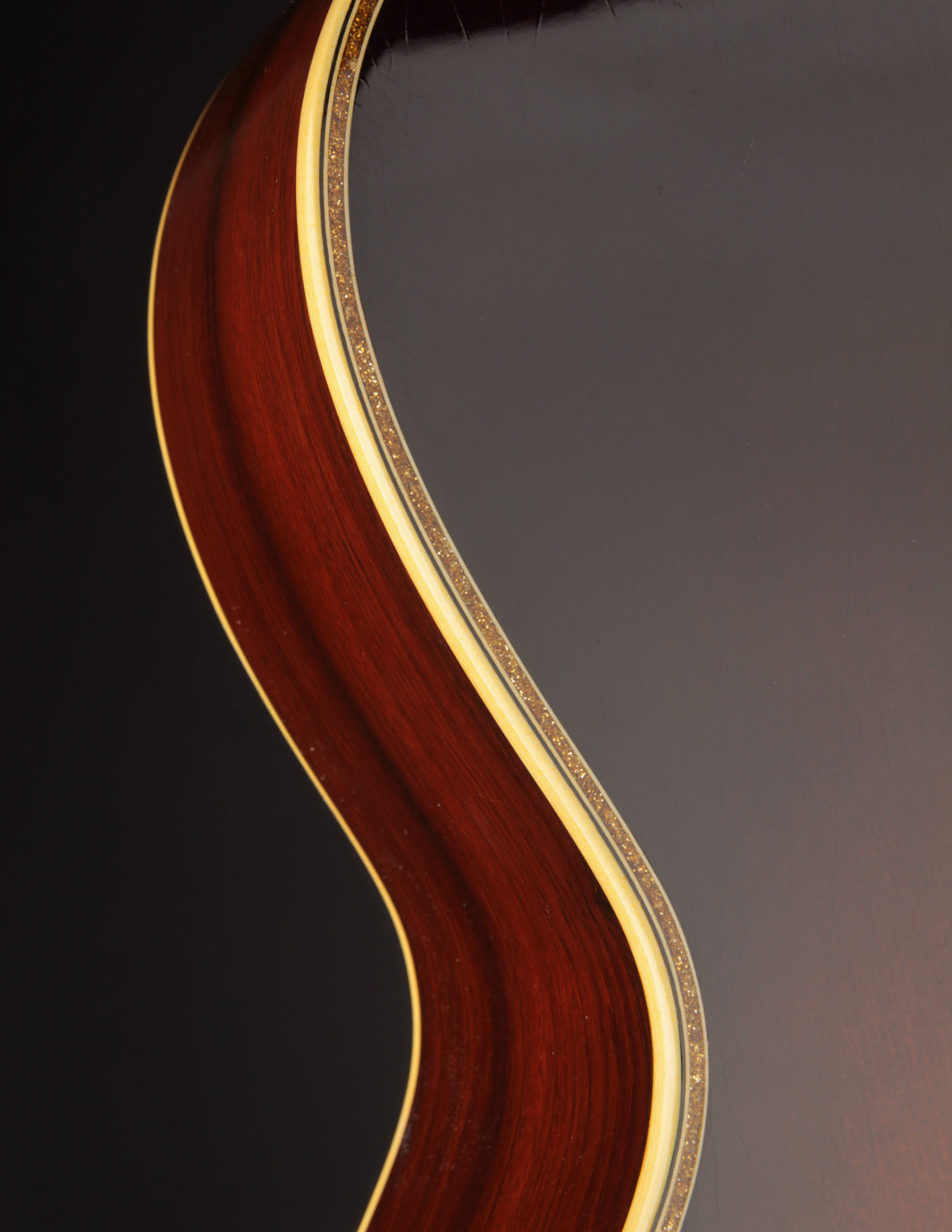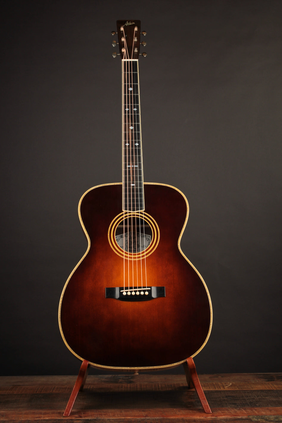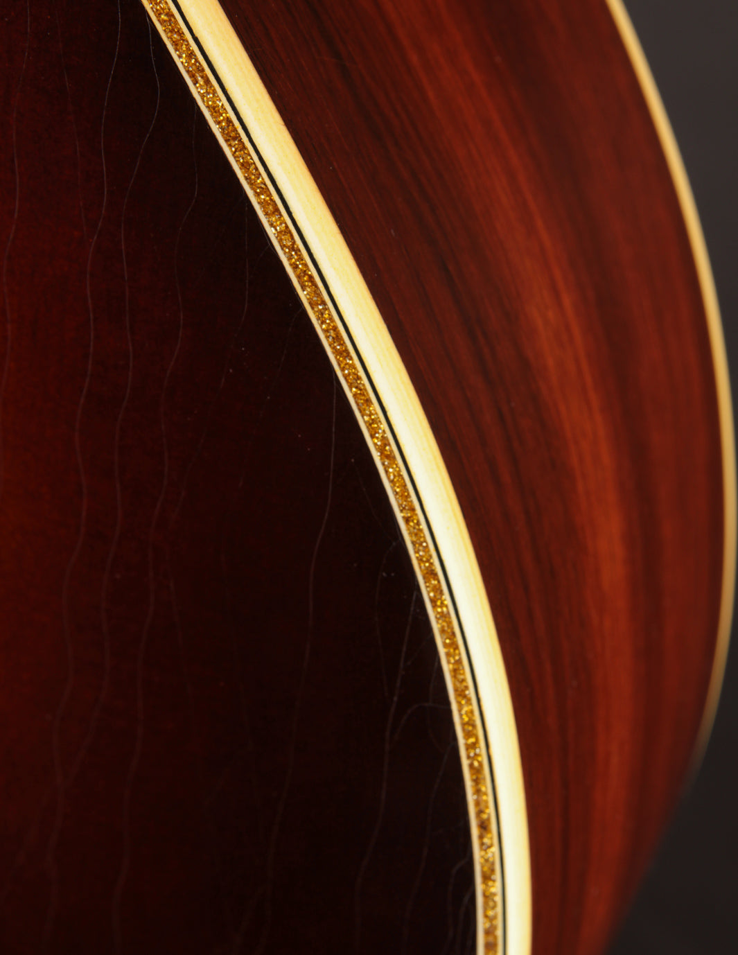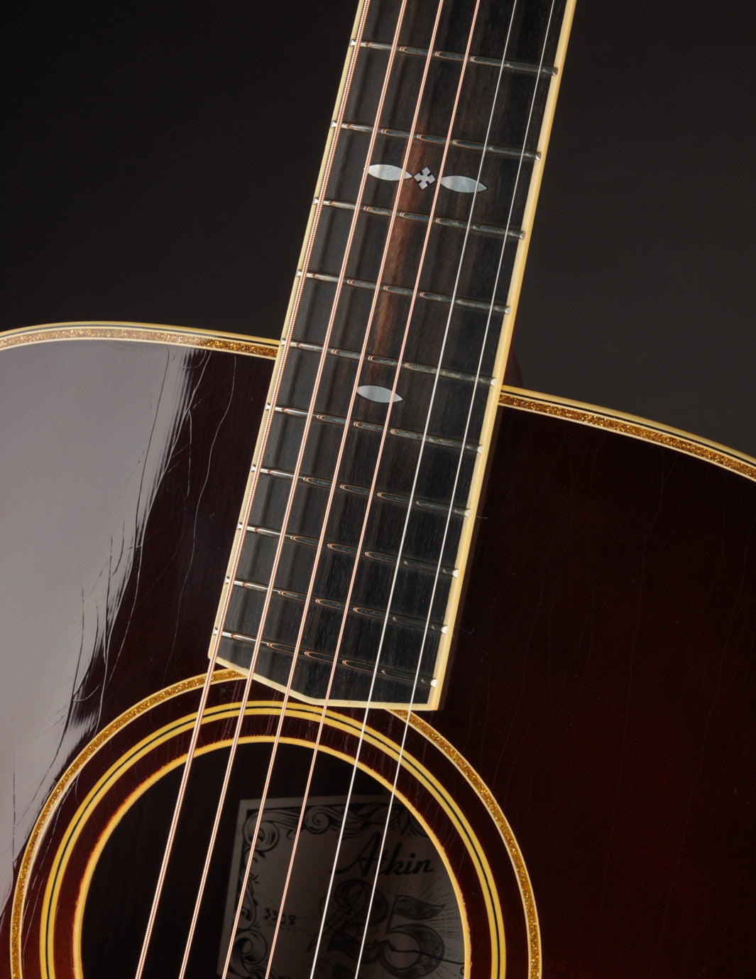 Atkin Guitars is never content to rest on their laurels. This lovely 000 Custom is a perfect case in point. Not content to just make a great-sounding rosewood 000, they reached back into their vintage 30's Gibson bag-of-tricks to pull out this exquisite dark burst and funky gold sparkle trim, essentially spinning wonderful into sublime!
