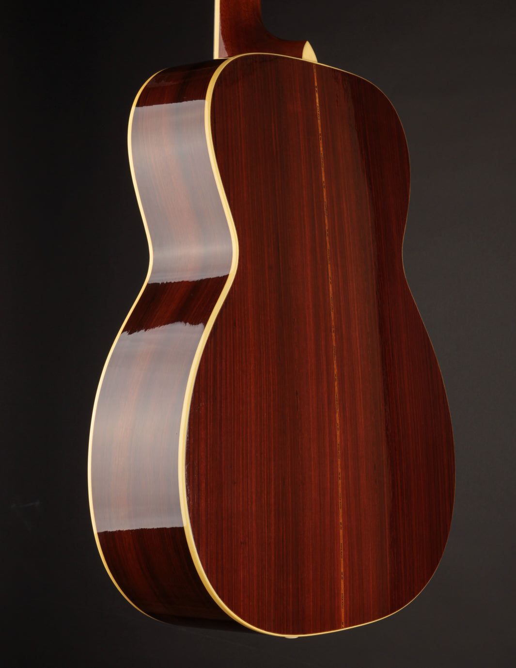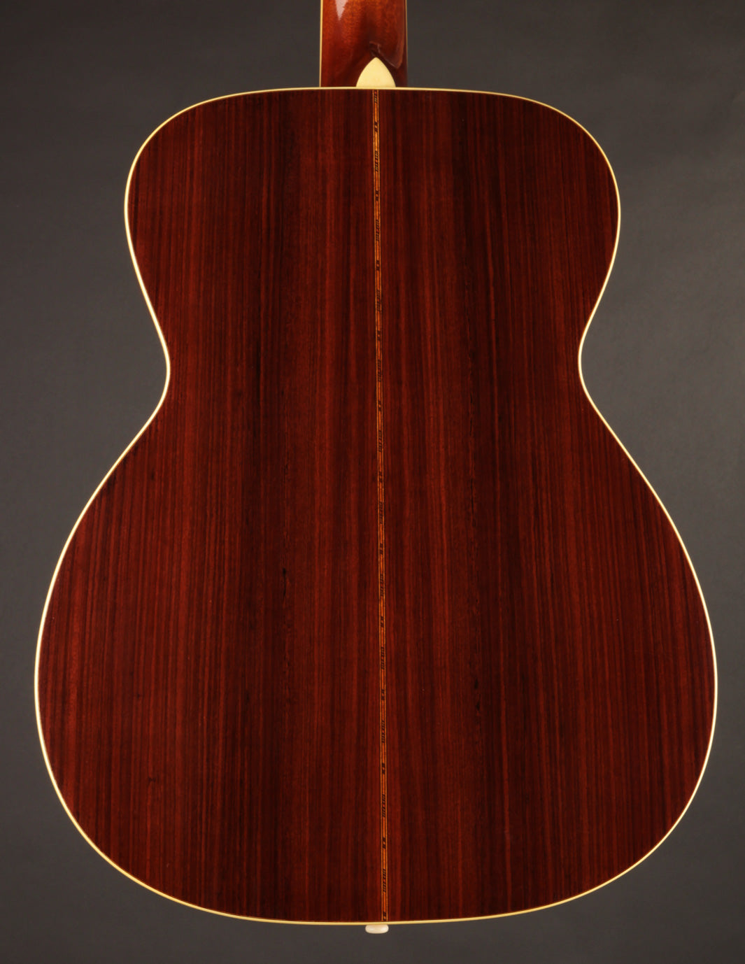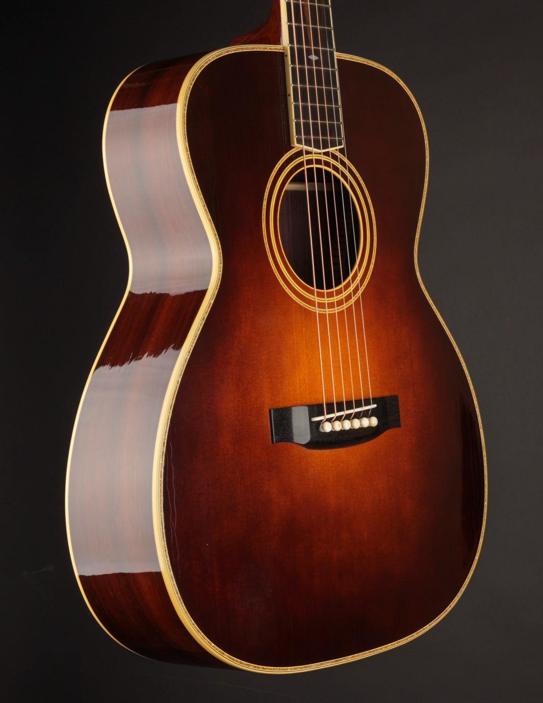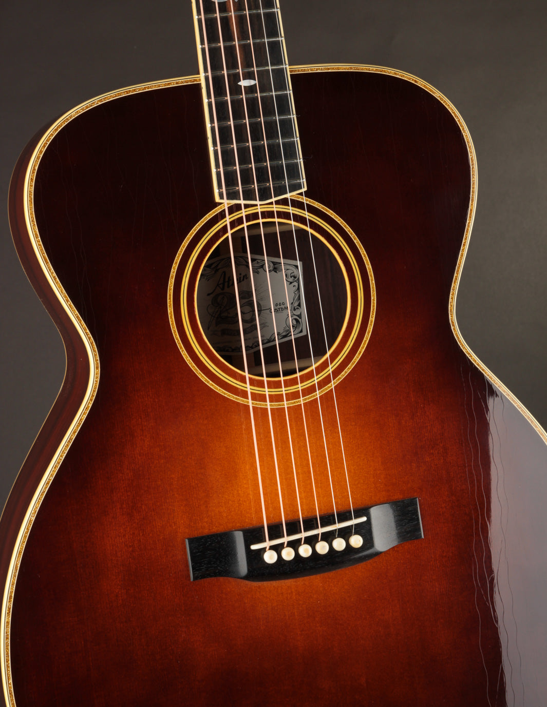 Atkin Guitars is never content to rest on their laurels. This lovely 000 Custom is a perfect case in point. Not content to just make a great-sounding rosewood 000, they reached back into their vintage 30's Gibson bag-of-tricks to pull out this exquisite dark burst and funky gold sparkle trim, essentially spinning wonderful into sublime!