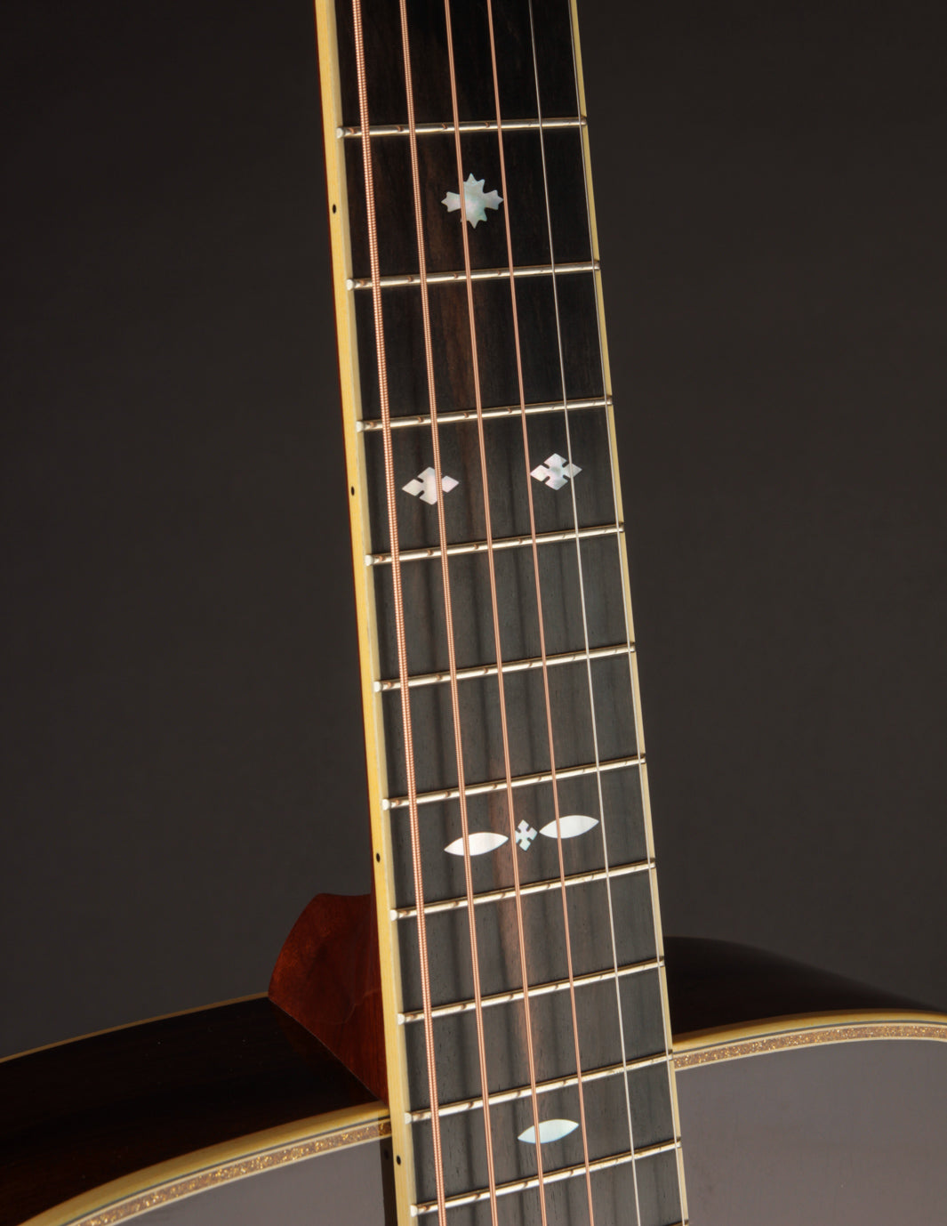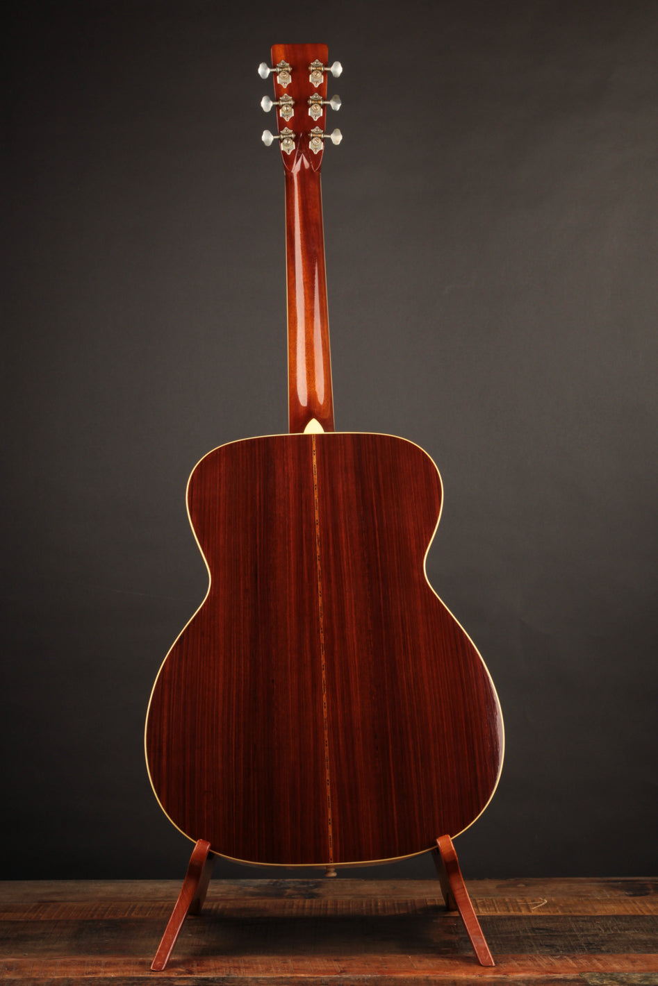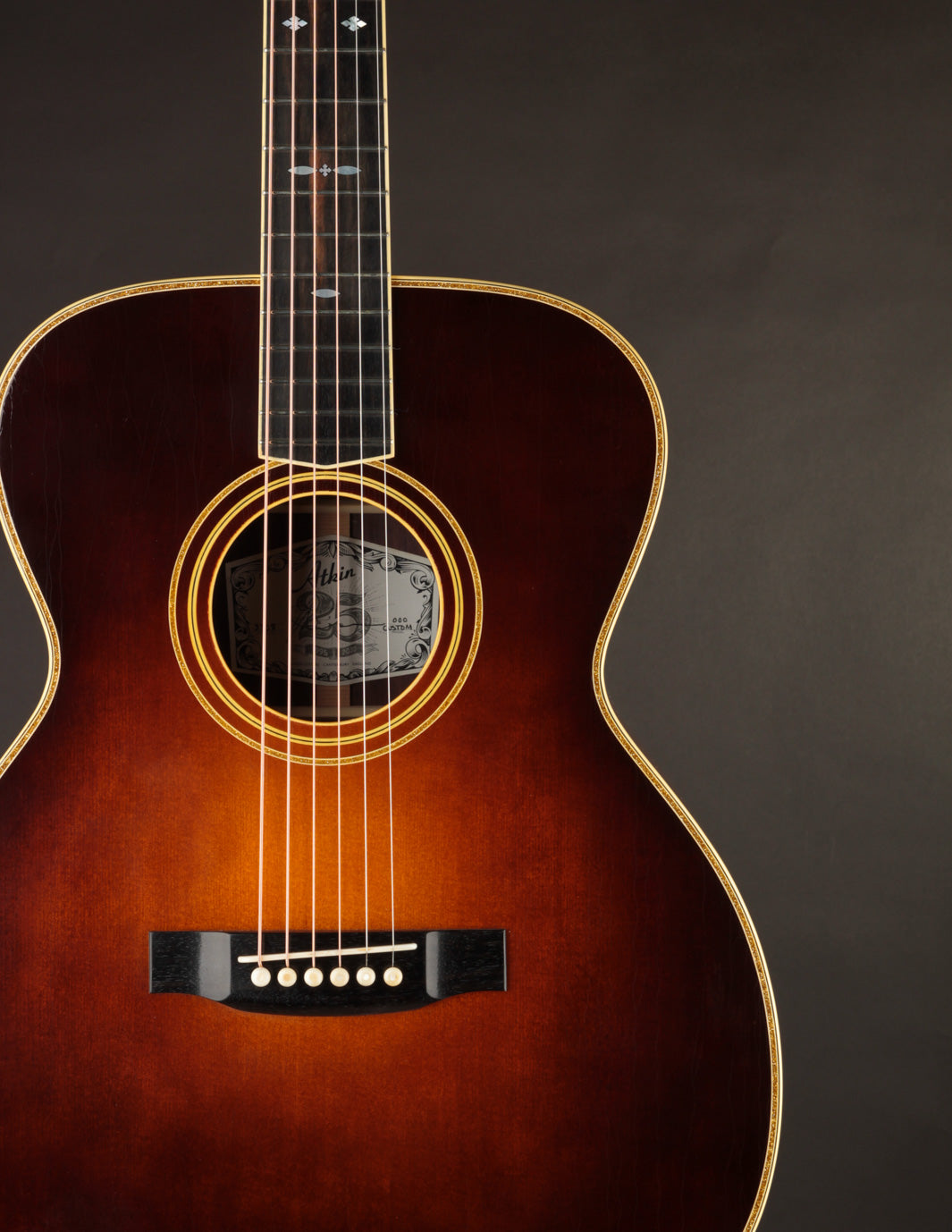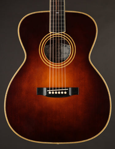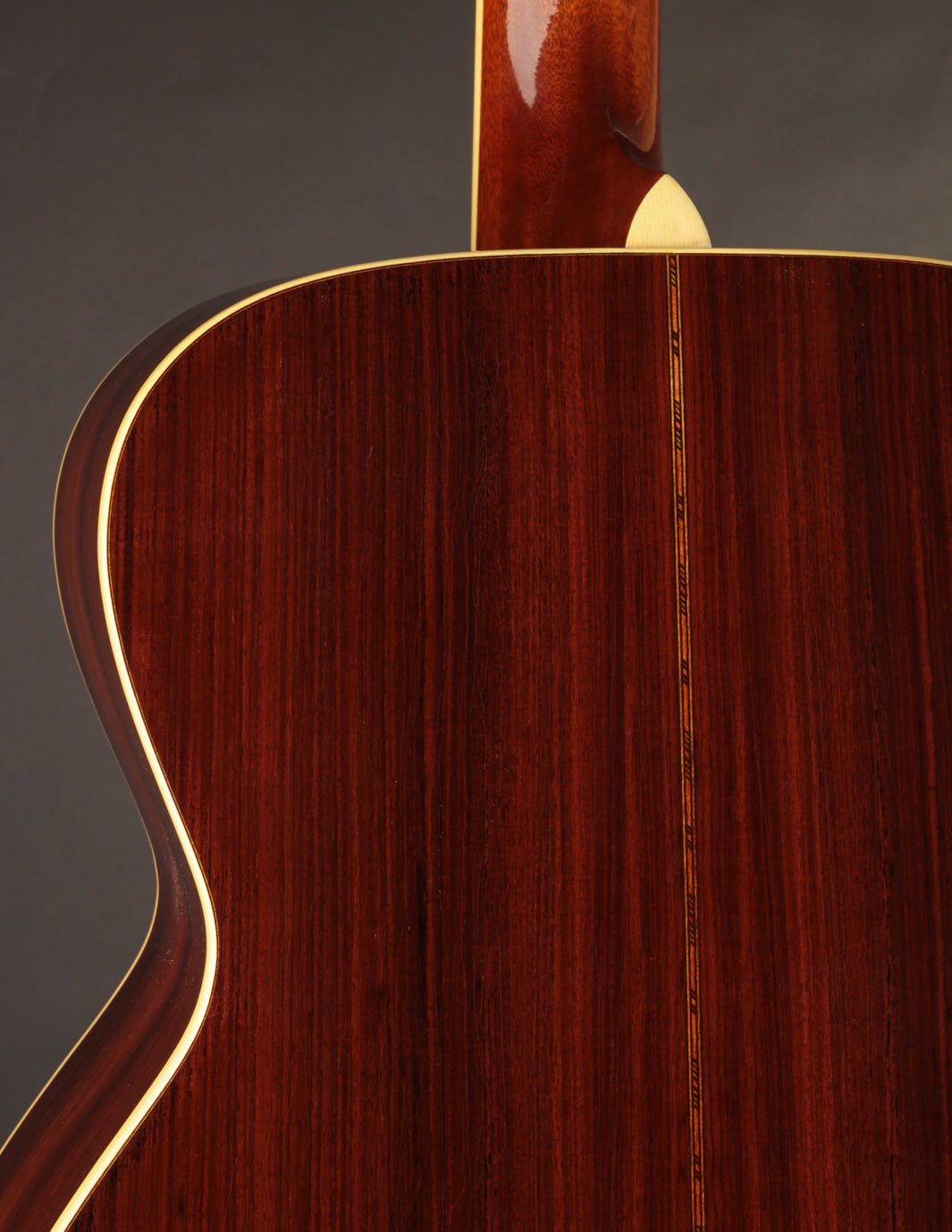 Atkin Guitars is never content to rest on their laurels. This lovely 000 Custom is a perfect case in point. Not content to just make a great-sounding rosewood 000, they reached back into their vintage 30's Gibson bag-of-tricks to pull out this exquisite dark burst and funky gold sparkle trim, essentially spinning wonderful into sublime!
