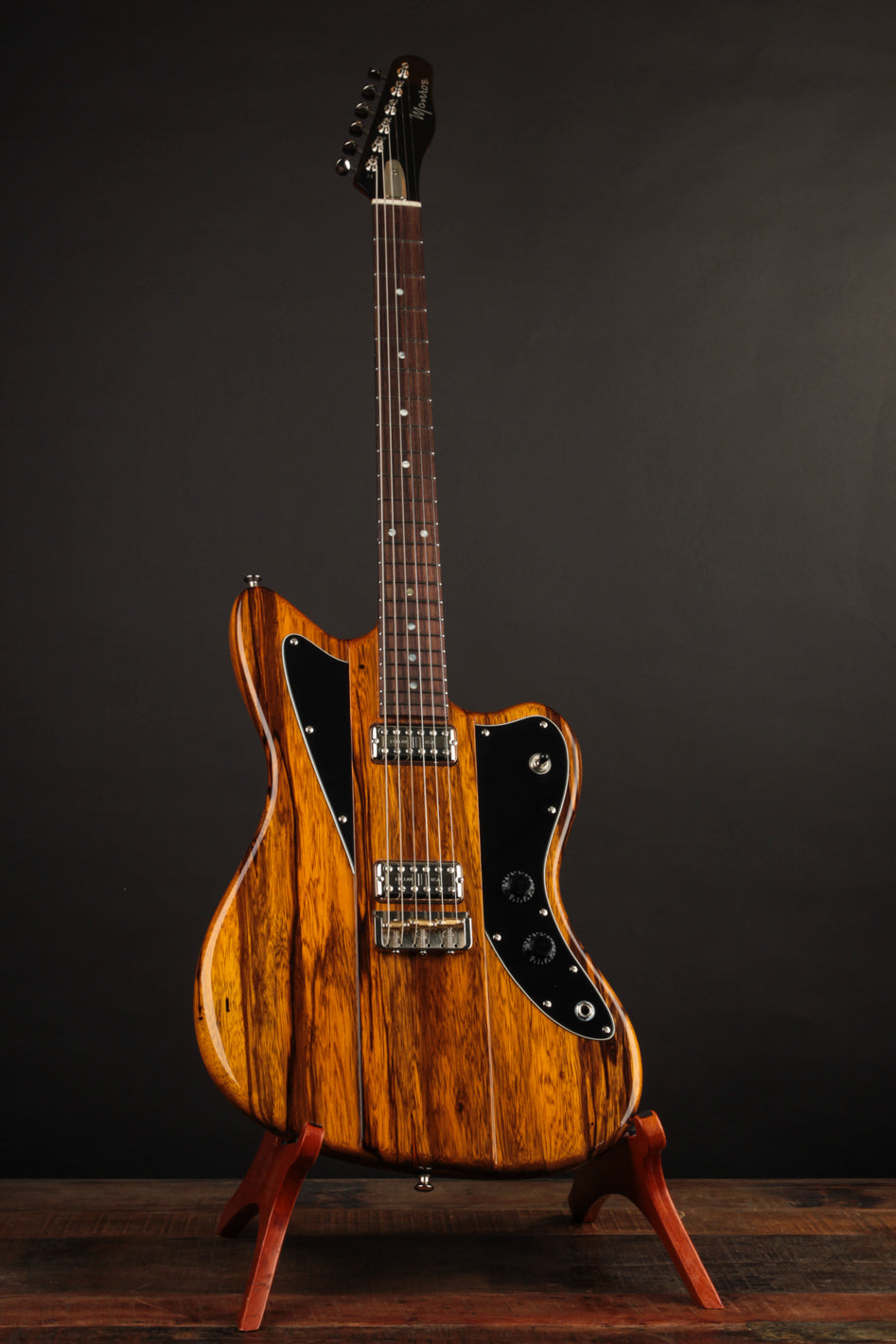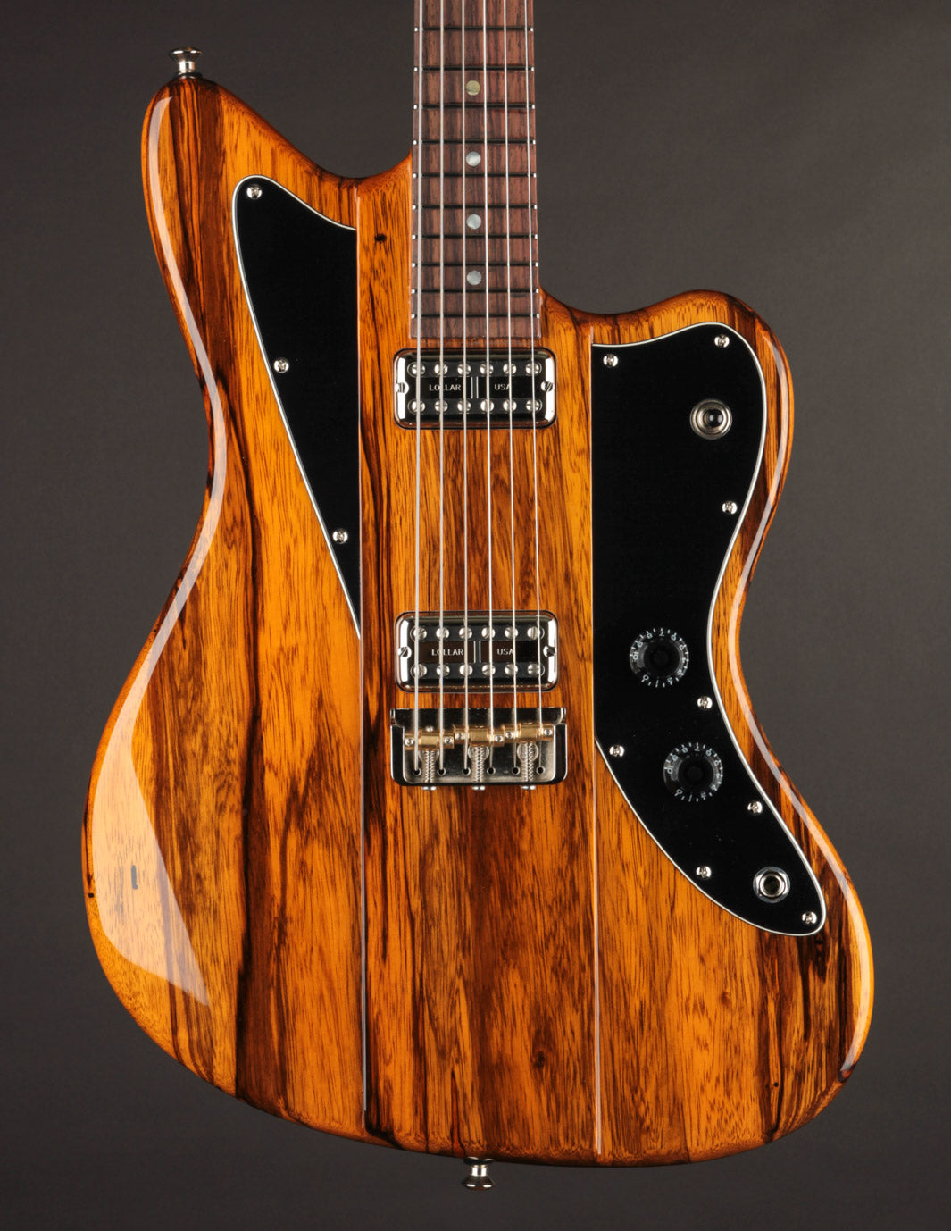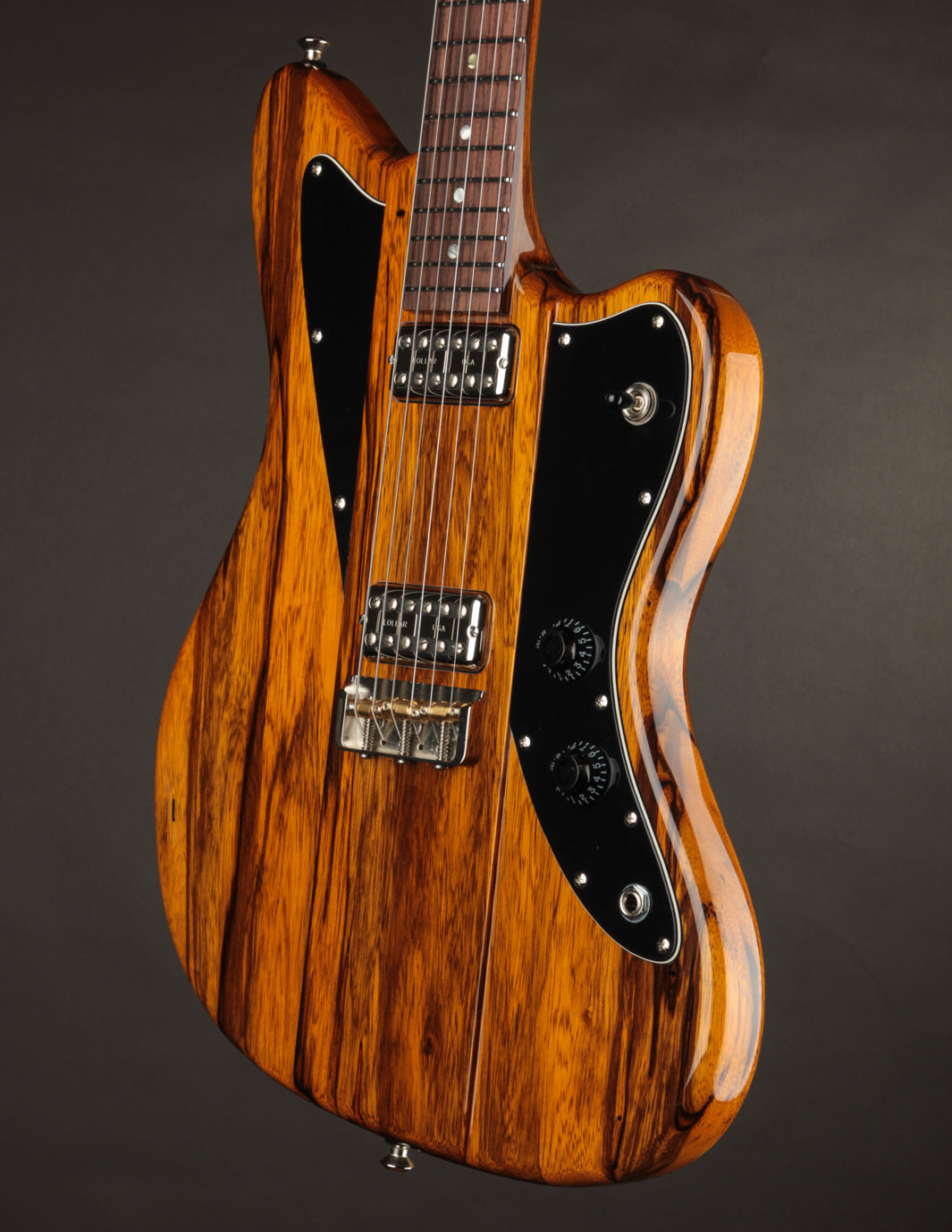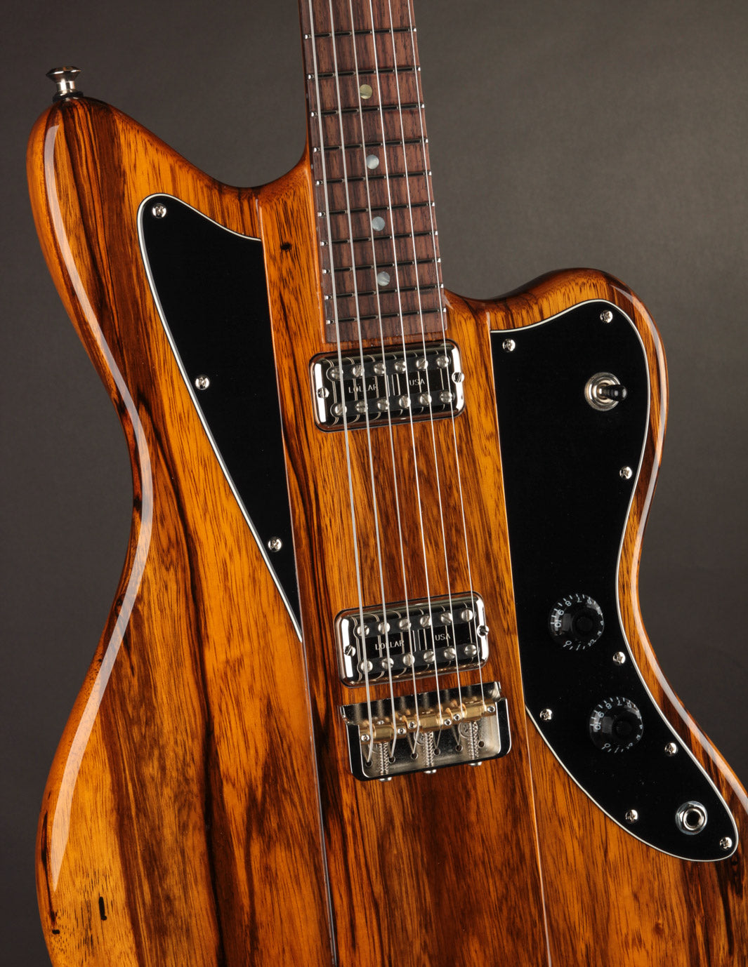 This Monroe features a truly stunning black limba body and neck, with neck through construction that makes upper fret access ridiculously easy, a rosewood fingerboard, chopped Tele bridge w/brass saddles, 6-on-a-side headstock, and a pair of Lollar Lollartron pickups.