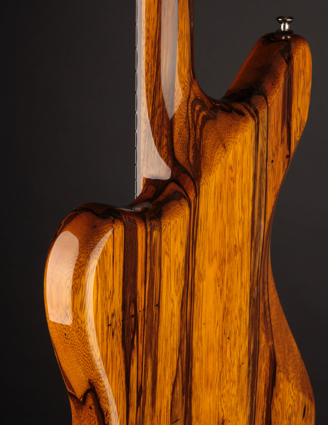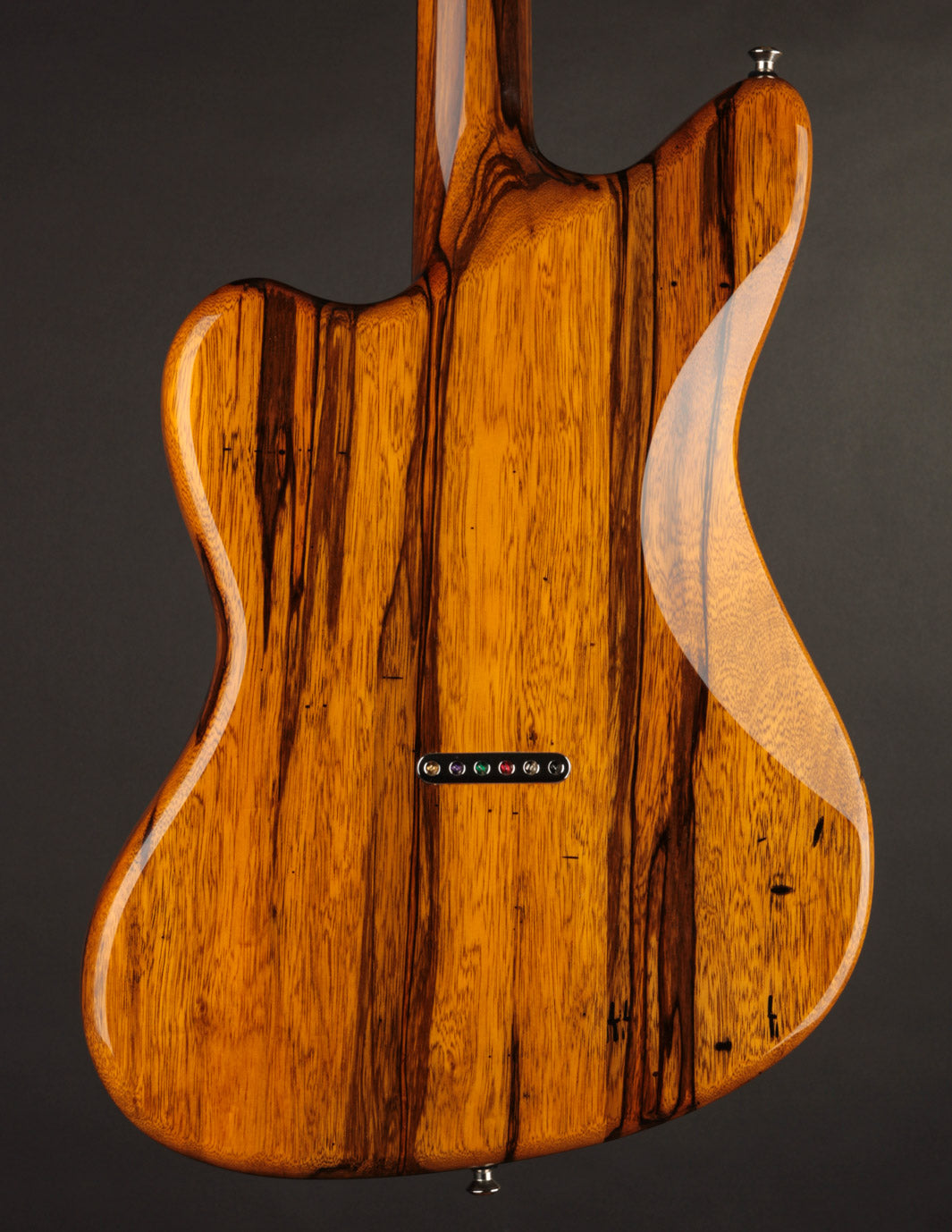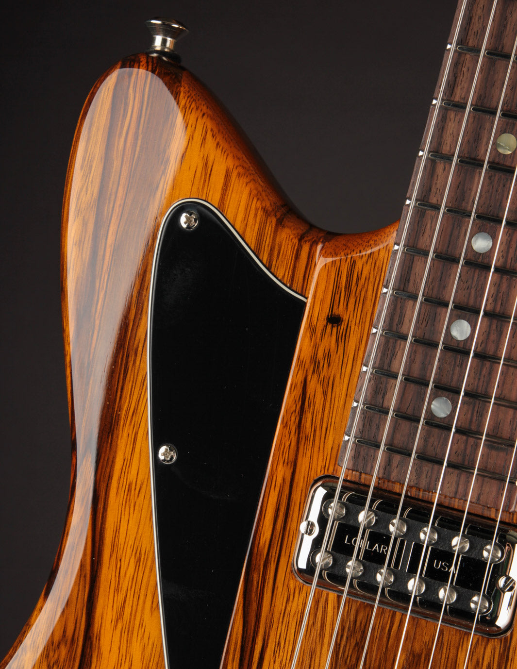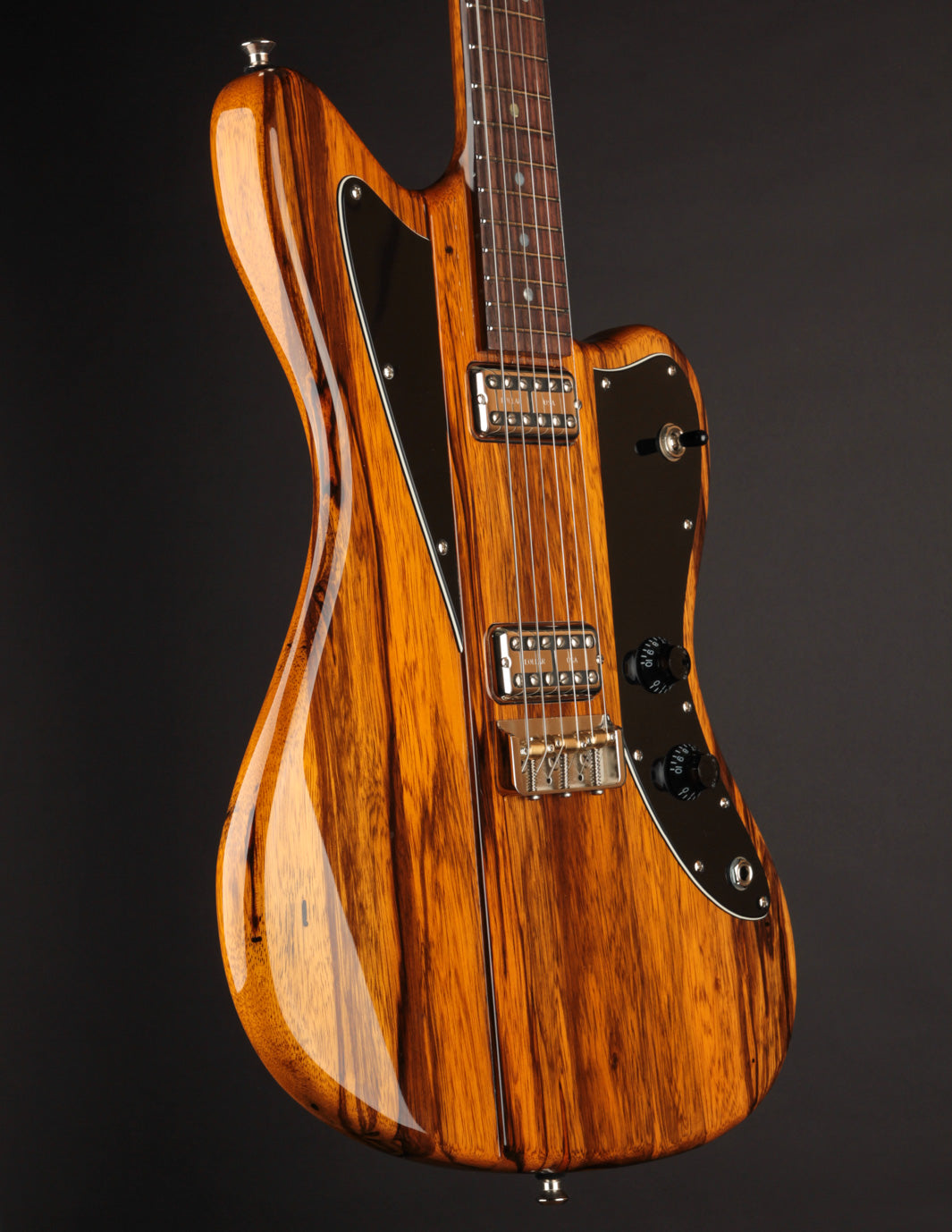 This Monroe features a truly stunning black limba body and neck, with neck through construction that makes upper fret access ridiculously easy, a rosewood fingerboard, chopped Tele bridge w/brass saddles, 6-on-a-side headstock, and a pair of Lollar Lollartron pickups.