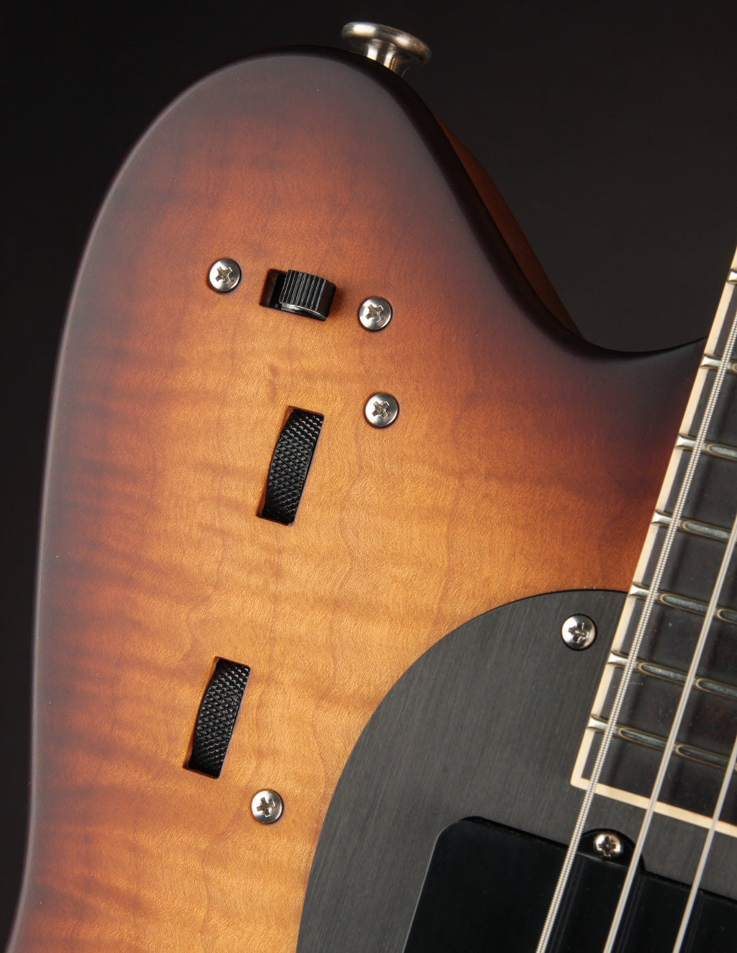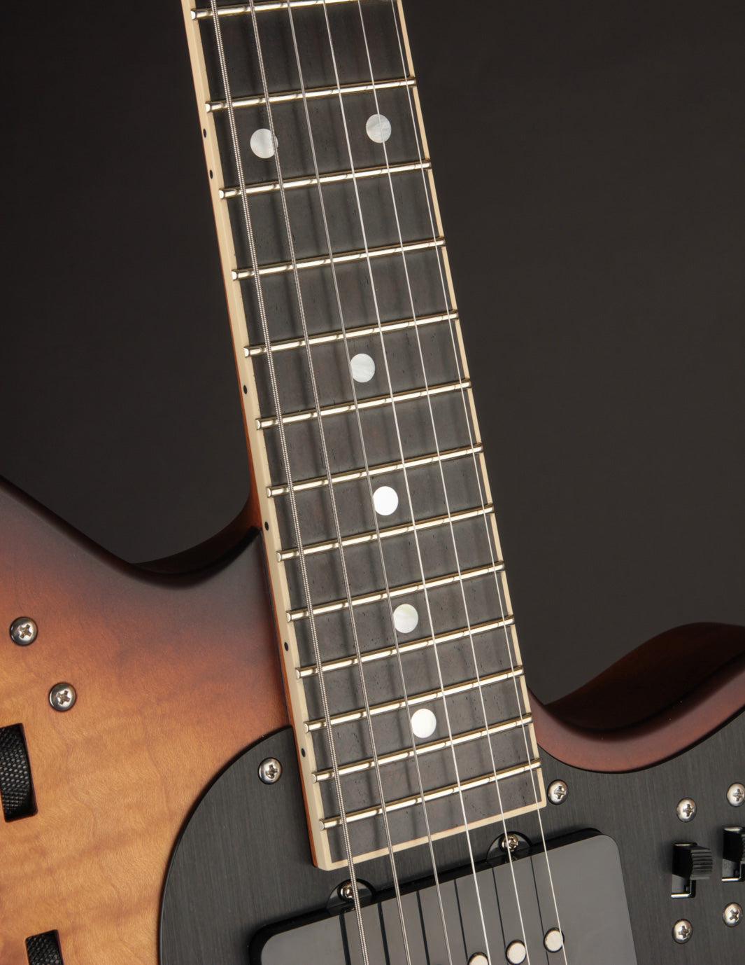 Opposite of the LesLee circuit you'll find the 5-way pickup selector switch and a trio of slider switches. The upper slider switches the LesLee circuit between Mono/Stereo mode, the middle slider toggles the bridge pickup and the behind-the-bridge pickup, and the lower slider splits the TwoTone humbucker for single-coil function. Below the switch array, you've got a Master Volume and a Master Tone. The tone control is a push/pull that activates the body piezo. For those swimming in experimental waters, you'll find these options wildly inspiring. Kicking the piezo in with an overdrive or fuzz and a louder amp yields some incredible harmonic feedback and resonant activity, while the JAG pickup allows for some great sympathetic tonal action behind the bridge.