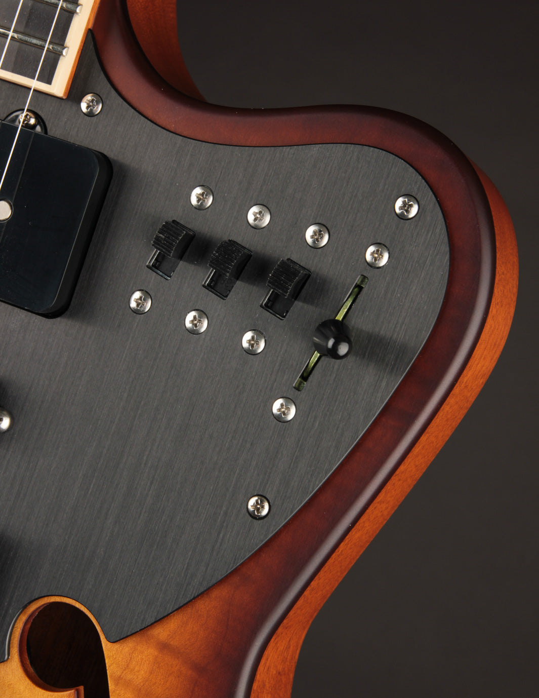 With the flip of a couple of slider switches, you can combine some of the most unique and inspiring tonal variations we've ever encountered in an electric guitar. The Pickup LesLee circuit on its own is worth the price of admission - lush, 3-dimensional Hammond B3 like warble unlike any effects pedal out there. The two thumbwheels control LesLee Speed and Middle pickup volume, respectively. Once you get the LesLee going, it's tough to turn off!