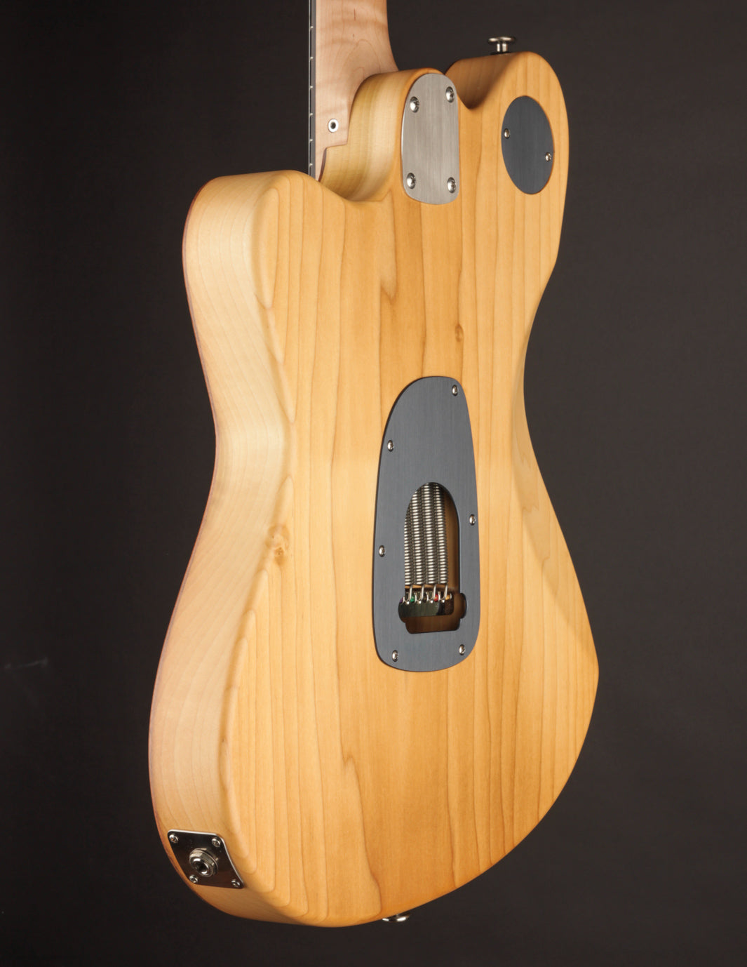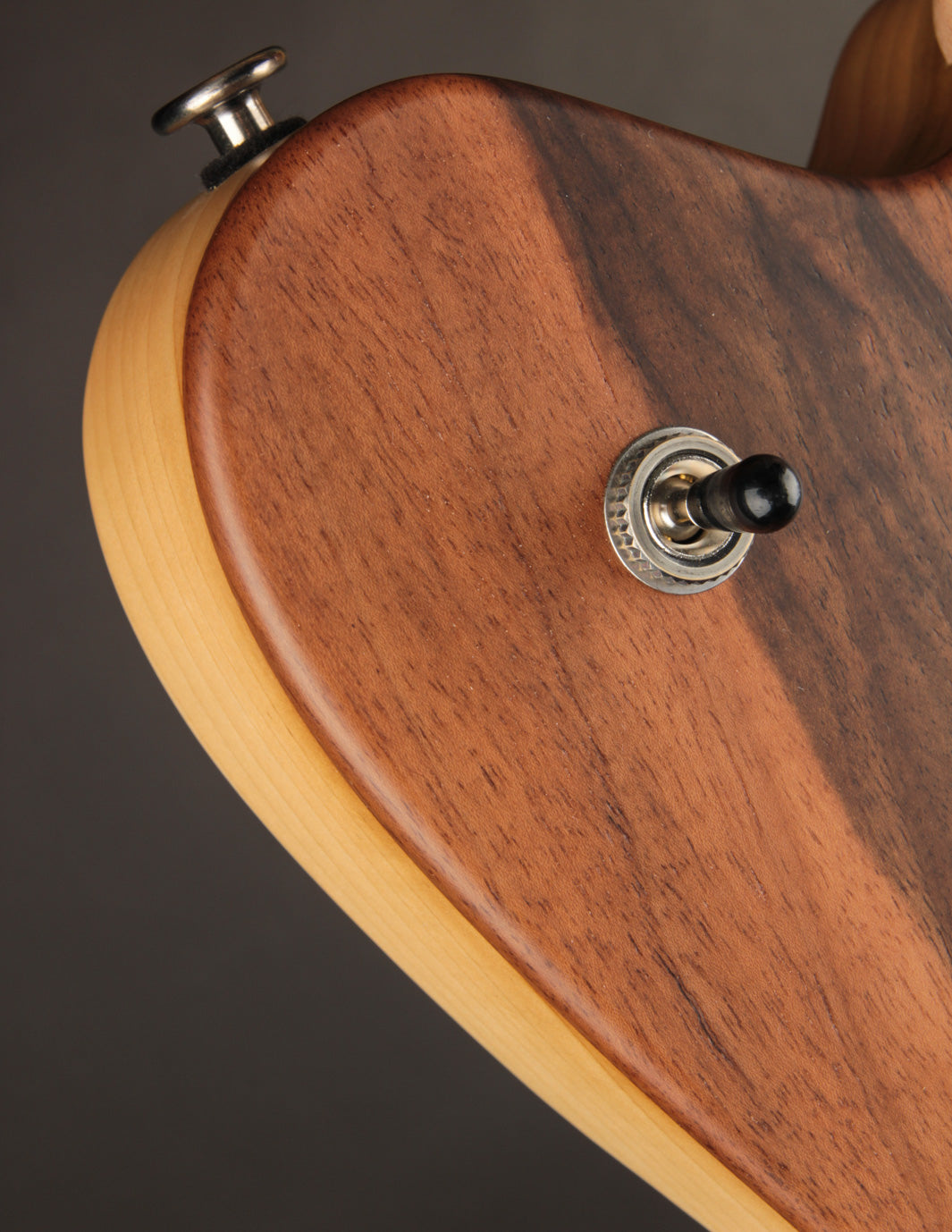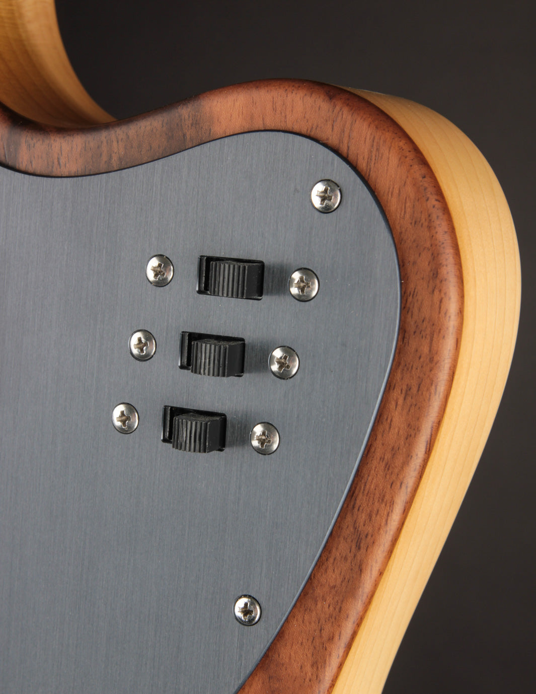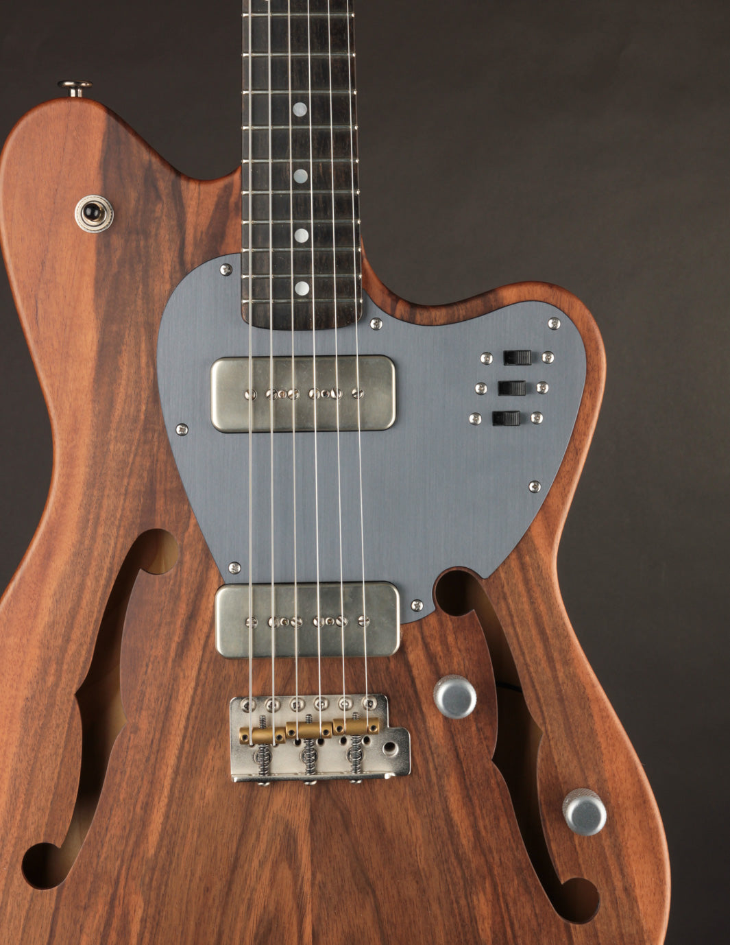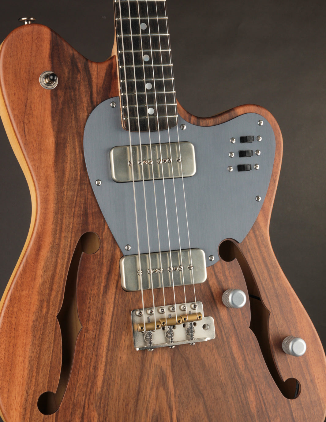 A pair of handwound P90 pickups in raw nickel covers provide great balance and warmth in the neck position with more sizzle and attack in the bridge pickup. They do a fantastic job of translating the acoustic properties of the guitar into an equally dynamic and woody response that covers an impressive range of tones. A trio of slider switches on the treble side cutaway offer up some tonal tweaks that add some versatility and some of more exploratory features that are a signature of Deimel's builds.
