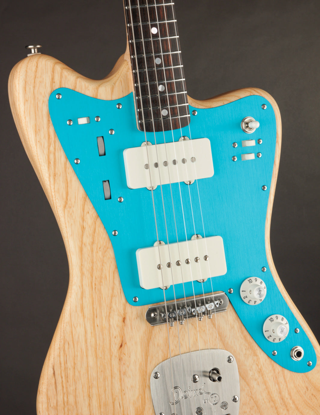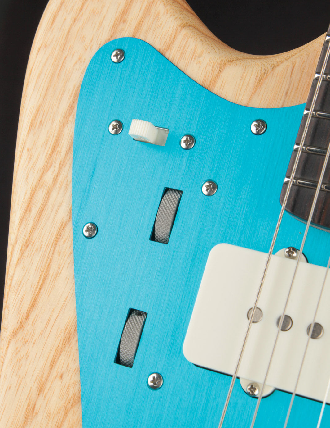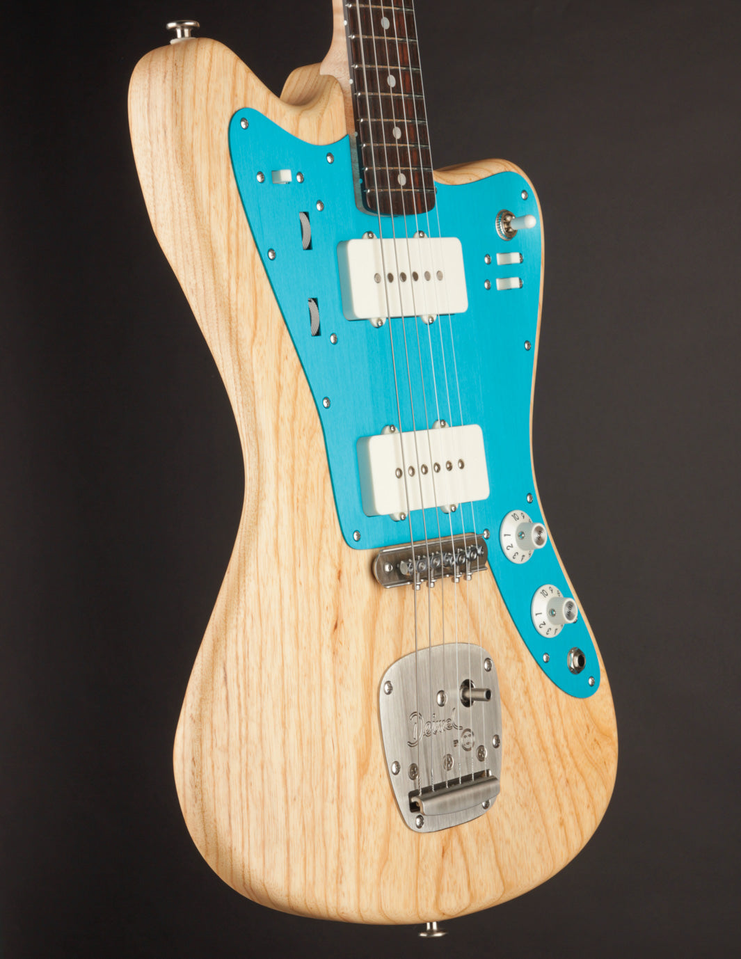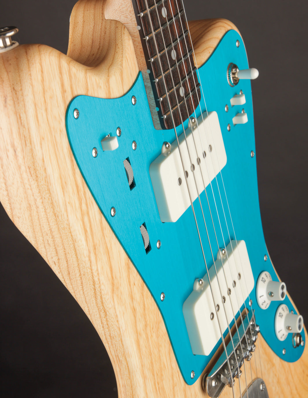 If you've handled the likes of a Huber, Ronin, or Koll, the playability will feel right at home. These guitars are incredibly well dialed-in, with expert fretwork and neck shaping along with a truly remarkable level of fit and finish. The beautiful natural-finished one piece Swamp Ash body has some deep and dramatic grain - kind of seismographic in a way. It sets the table for a bright a vivid Turquoise anodized aluminum guard that pops when combined with the white plastics. Top shelf hardware (Mastery, Gotoh) and high quality electronics (CTS, Bourns) also help maintain that high level of playing experience and function. No stone is left unturned with these guitars.