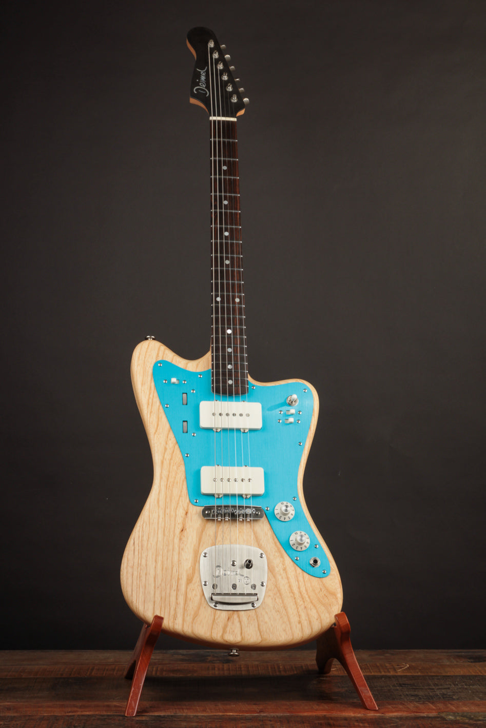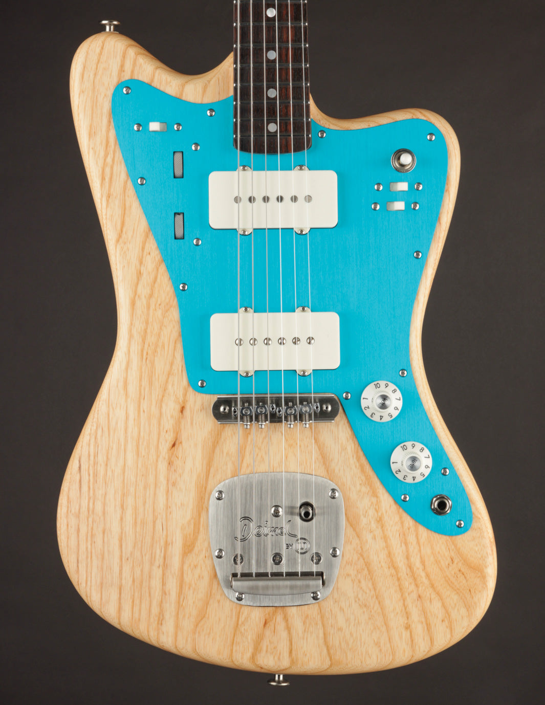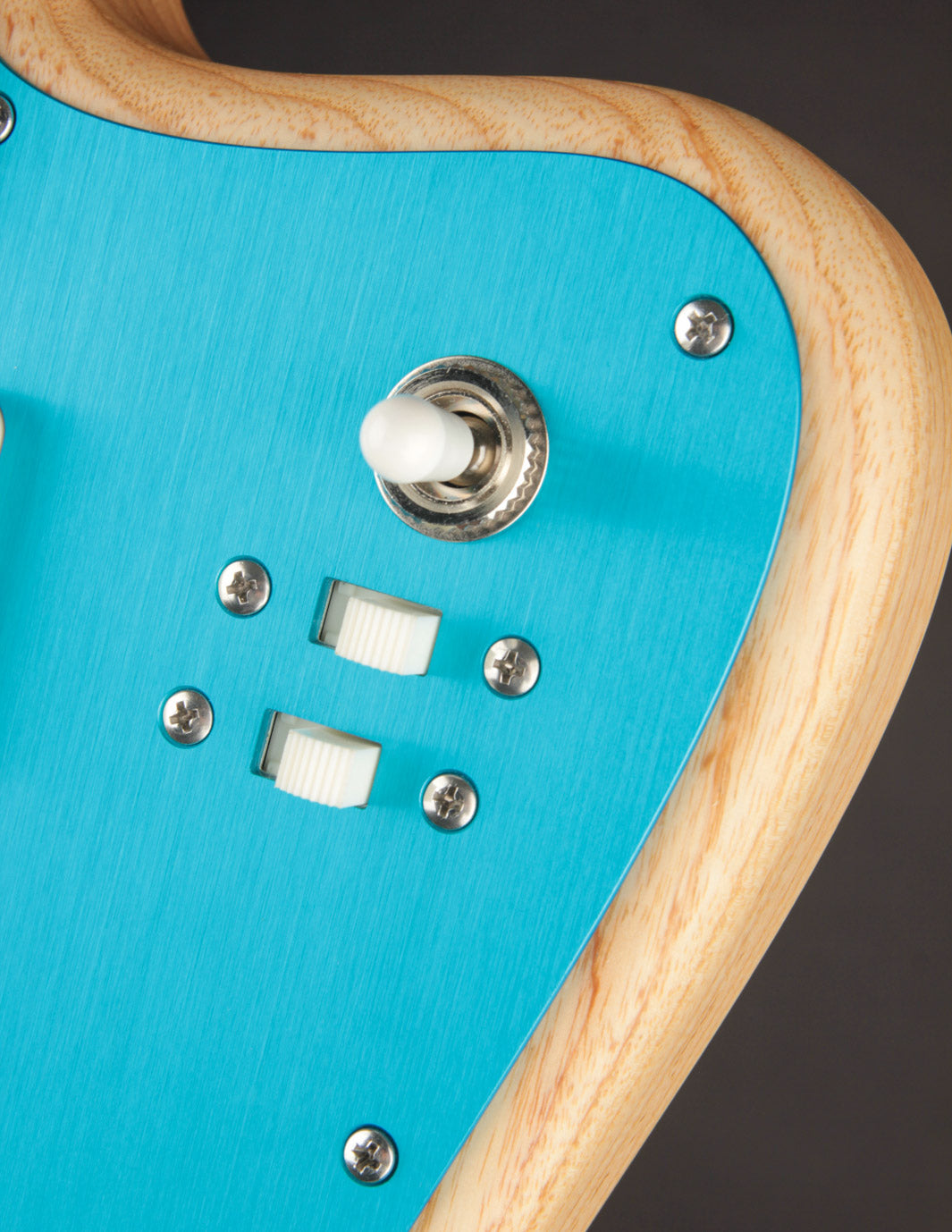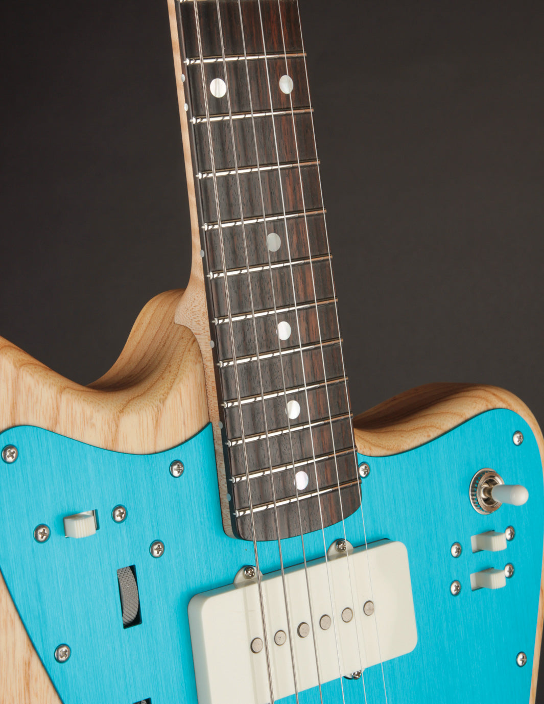 If you've handled the likes of a Huber, Ronin, or Koll, the playability will feel right at home. These guitars are incredibly well dialed-in, with expert fretwork and neck shaping along with a truly remarkable level of fit and finish. The beautiful natural-finished one piece Swamp Ash body has some deep and dramatic grain - kind of seismographic in a way. It sets the table for a bright a vivid Turquoise anodized aluminum guard that pops when combined with the white plastics. Top shelf hardware (Mastery, Gotoh) and high quality electronics (CTS, Bourns) also help maintain that high level of playing experience and function. No stone is left unturned with these guitars.