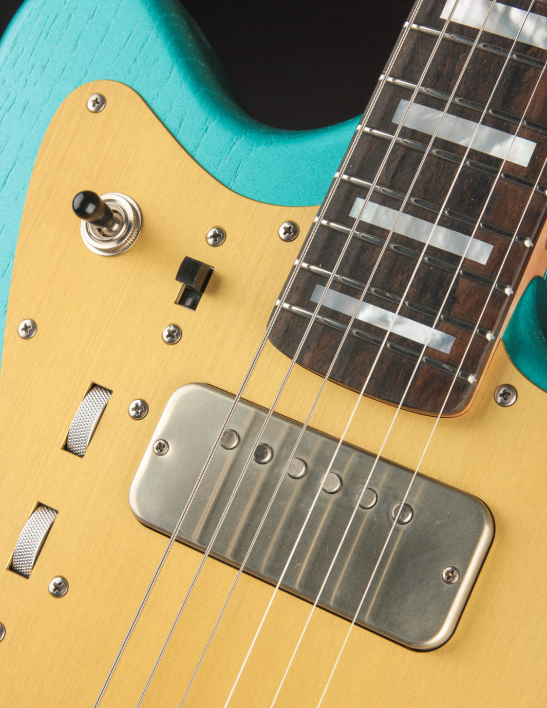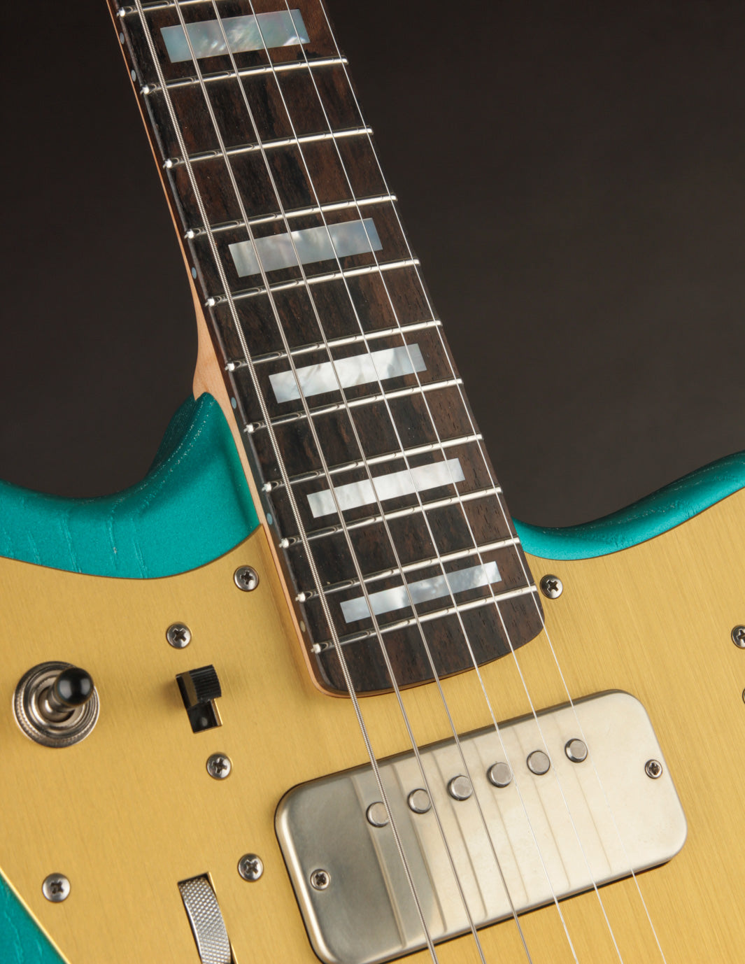 To the opposite side, three additional sliders engage the body and headstock piezos, respectively, along with a Kill/Alive switch that's wired directly to the push button below it. Layering the piezos with drive or fuzz yields richly textured harmonic feedback and resonant bloom. The push-button kill switch rounds out the control set—your shortcut to staccato mayhem à la Tom Morello. Volume and Tone controls on the lower bout (the Tone control is a push/pull to activate Mono/Stereo function for the LesLee) are accompanied by a Blendpot for both pickups. When the piezos are activated, the Volume pot blends between magnetic and piezo sound when turning down the volume from 10 to approx. 7-8.