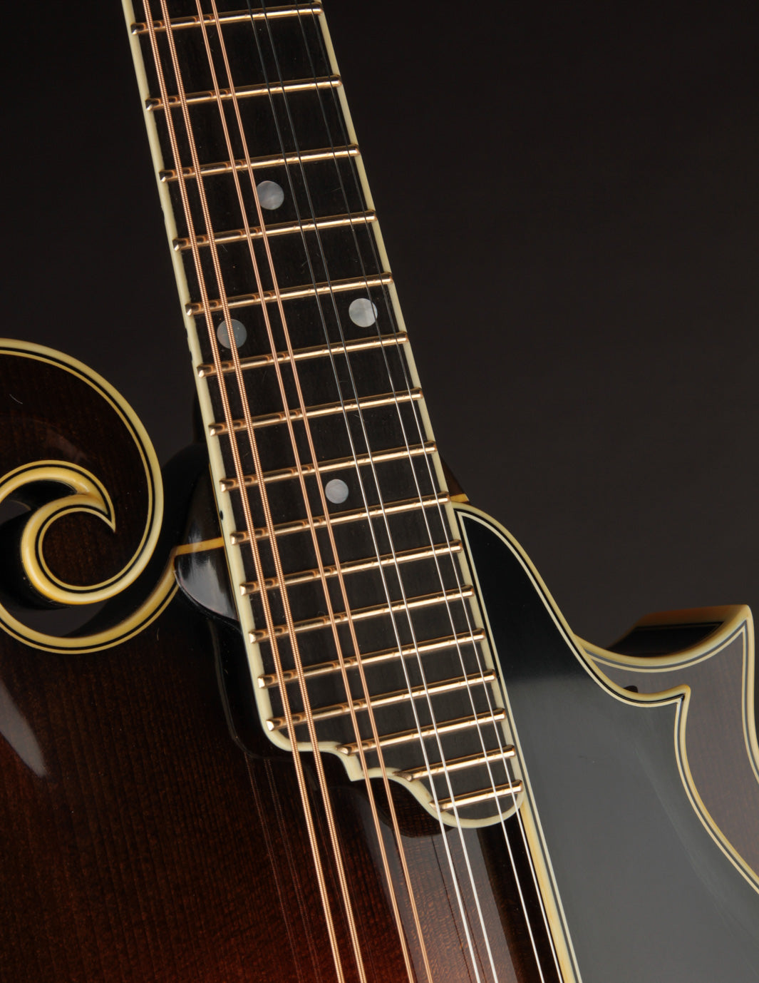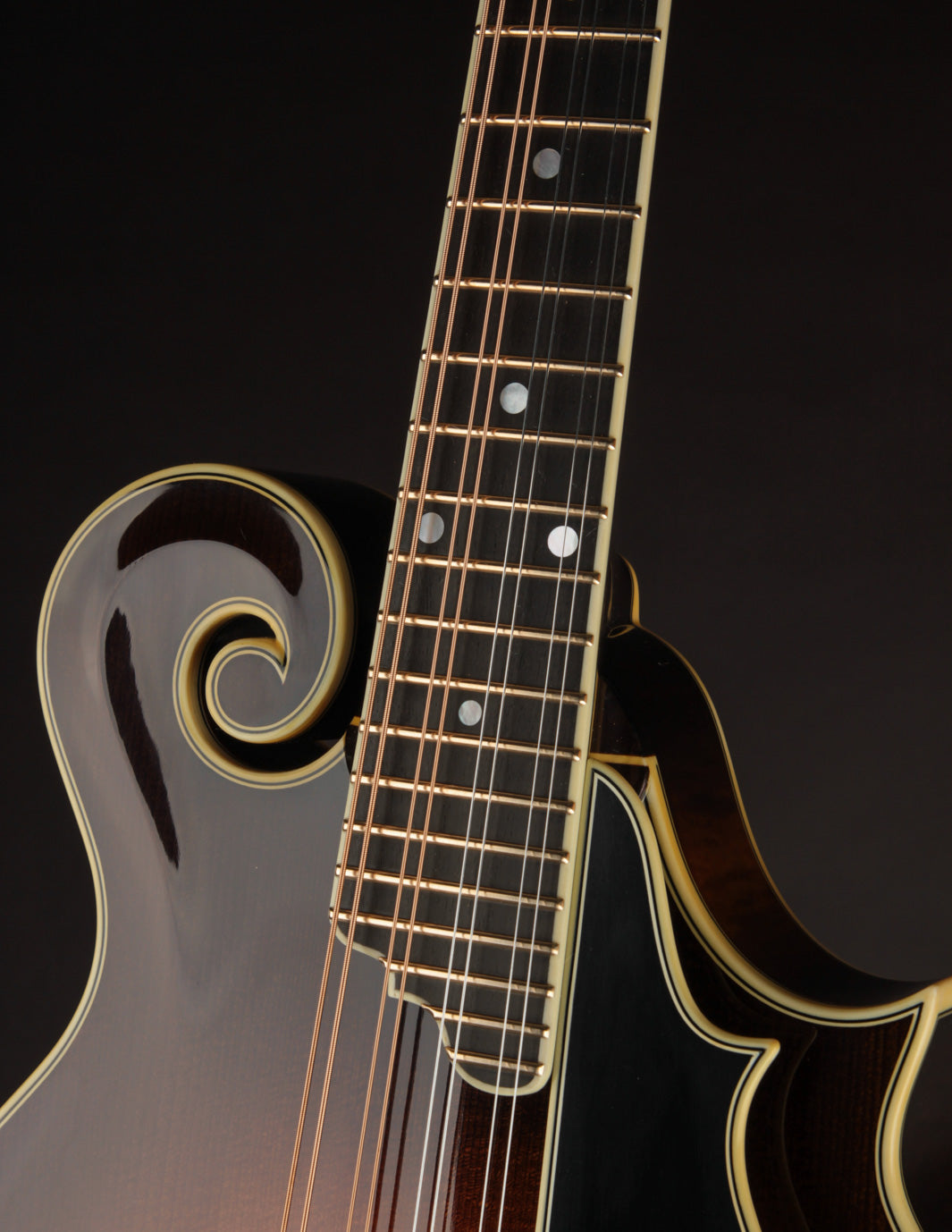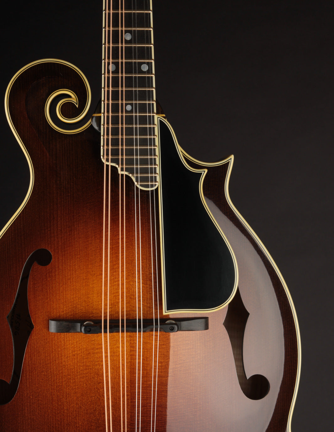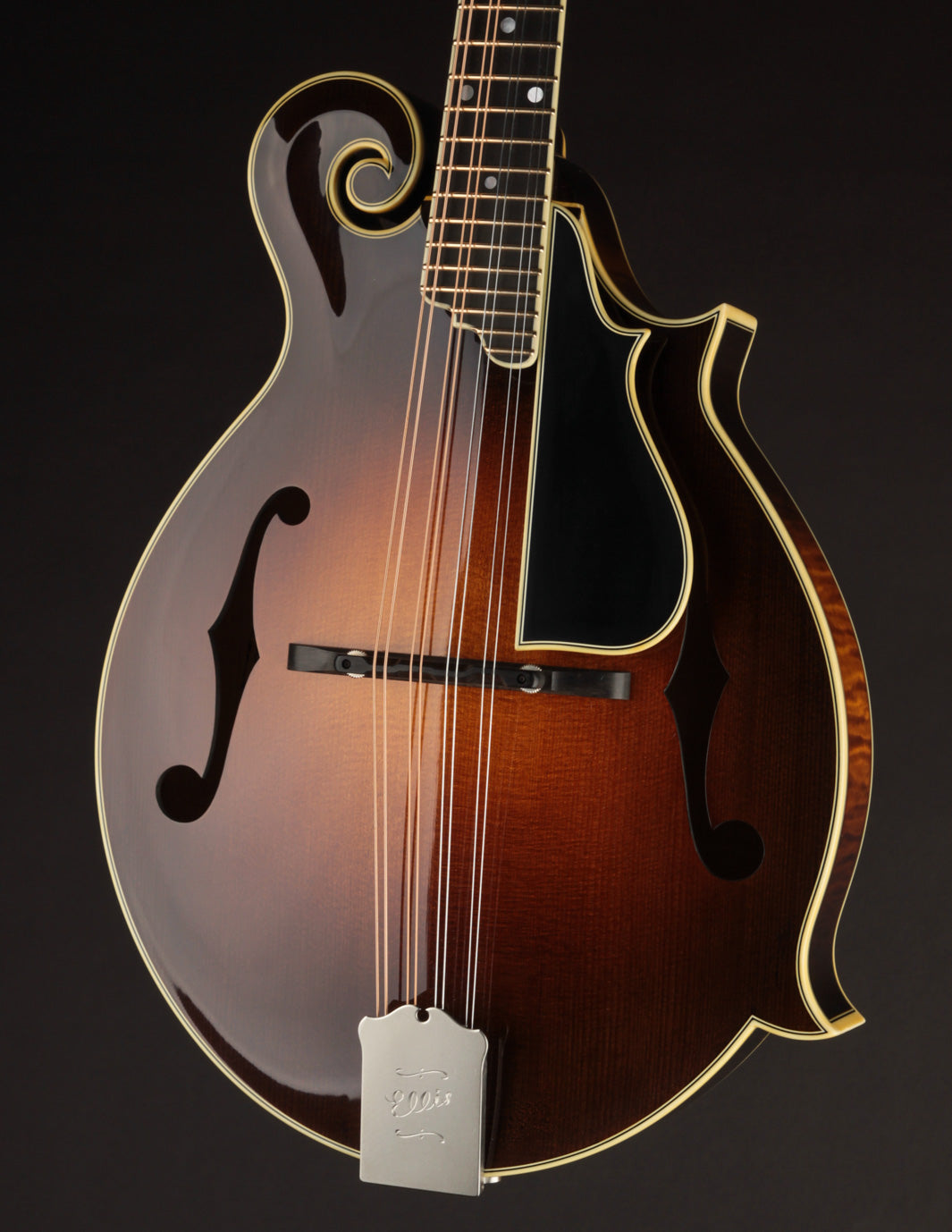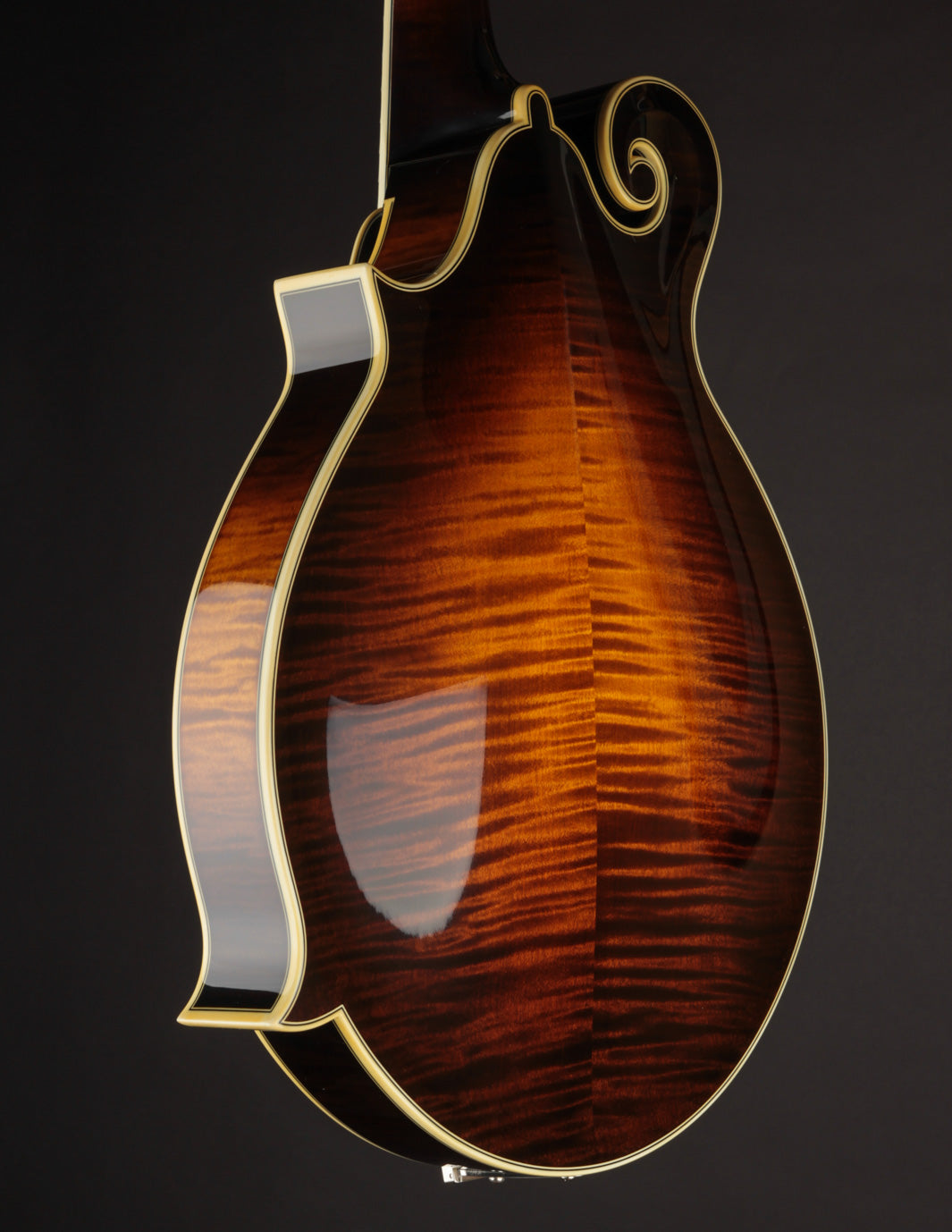 For this particular Ellis F5, we diverted a little bit from our typical path. Although we've been known to gush over beautiful quilted wood and gorgeous inlay, with this mandolin the only directive was, "Pick the wood that's going to make the best sounding bluegrass mandolin available." And is this instrument ever a testament to Tom's ability to voice a mandolin! The hand-picked Sugar Maple back and torrefied Red Spruce top combine to produce the kind of sound we haven't heard from our other Ellis instruments. While they're always beautiful and rich-sounding, this one has an openness and degree of power that make it the perfect choice for a bluegrass player interested in a world-class mandolin. An absolute knockout. Priced with a Calton case made specially for Ellis.