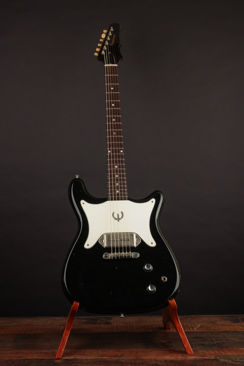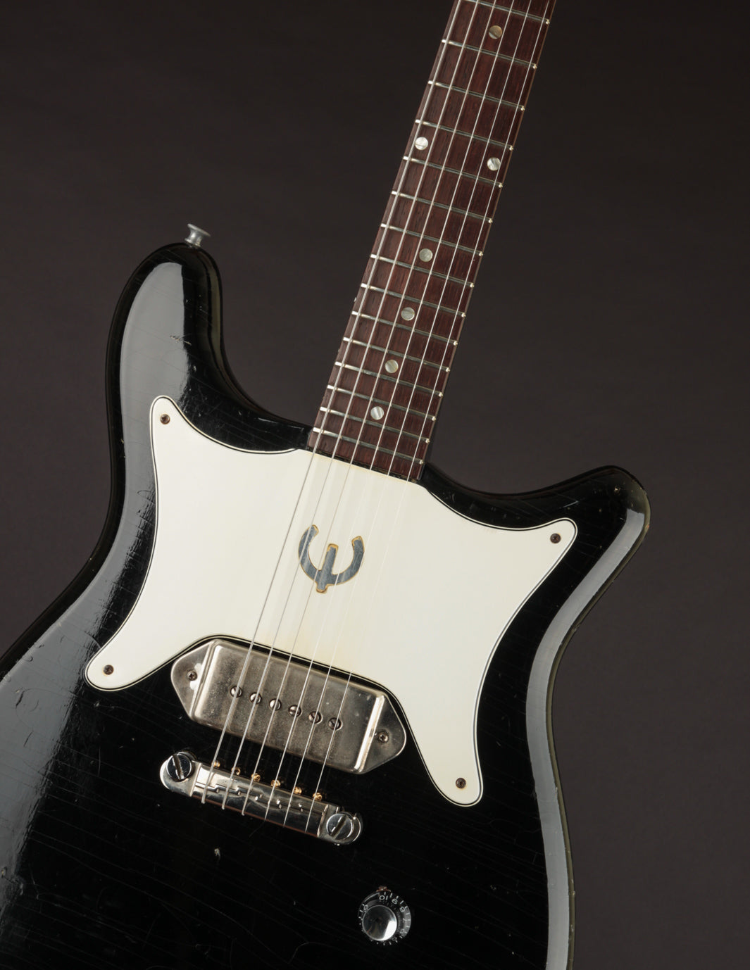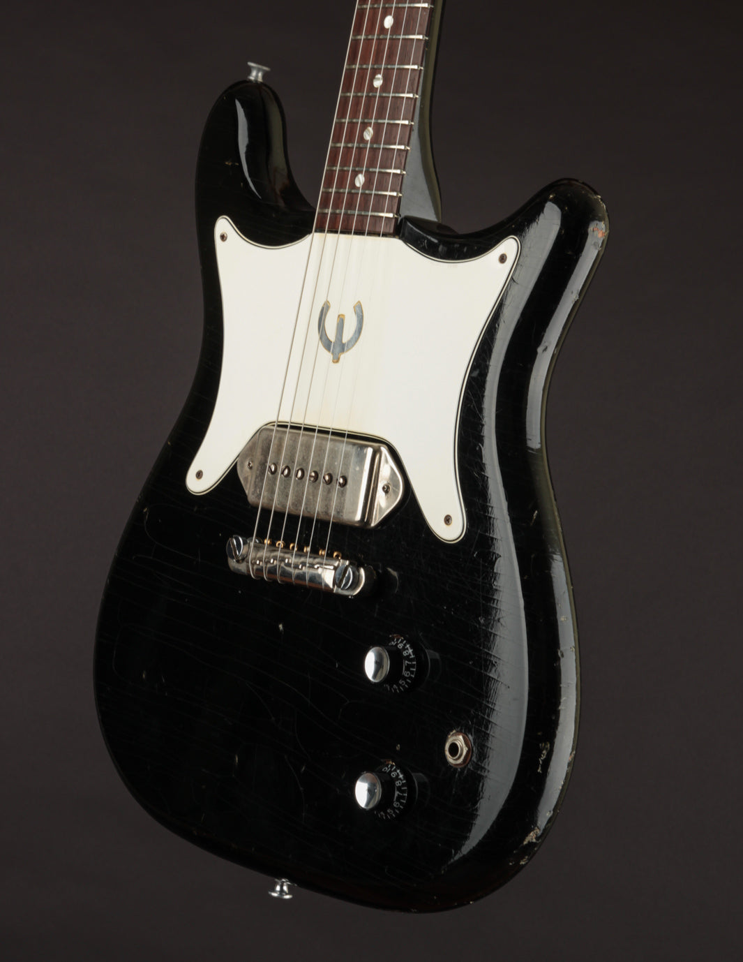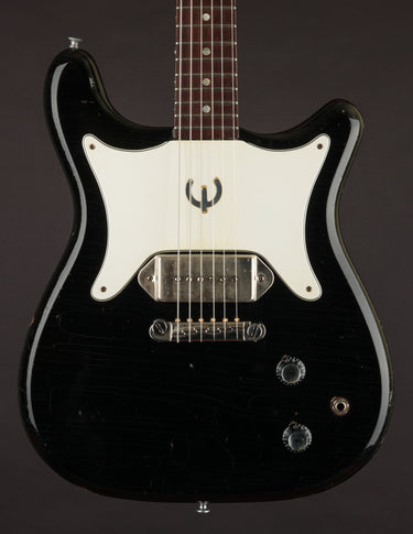 This 1964 Epiphone Coronet represent's Gibson's answer to the SG Junior under the rebranded sister company. The slim contoured 1 3/8" thick Mahogany body, Mahogany neck, and single P90 pickup follows the same pattern as the SG Junior, but the body and headstock shapes redefine the Junior-style aesthetic as to not cannibalize Gibson's popular versions. For those in the know, a 60s Epiphone is a considerable value - you're essentially getting the same guitar built in the same factory with the same woods, electronics, and finish work, all with a different name on the headstock.