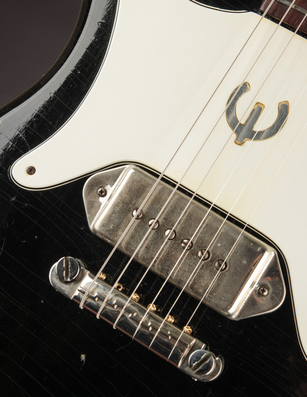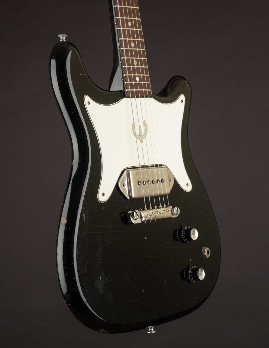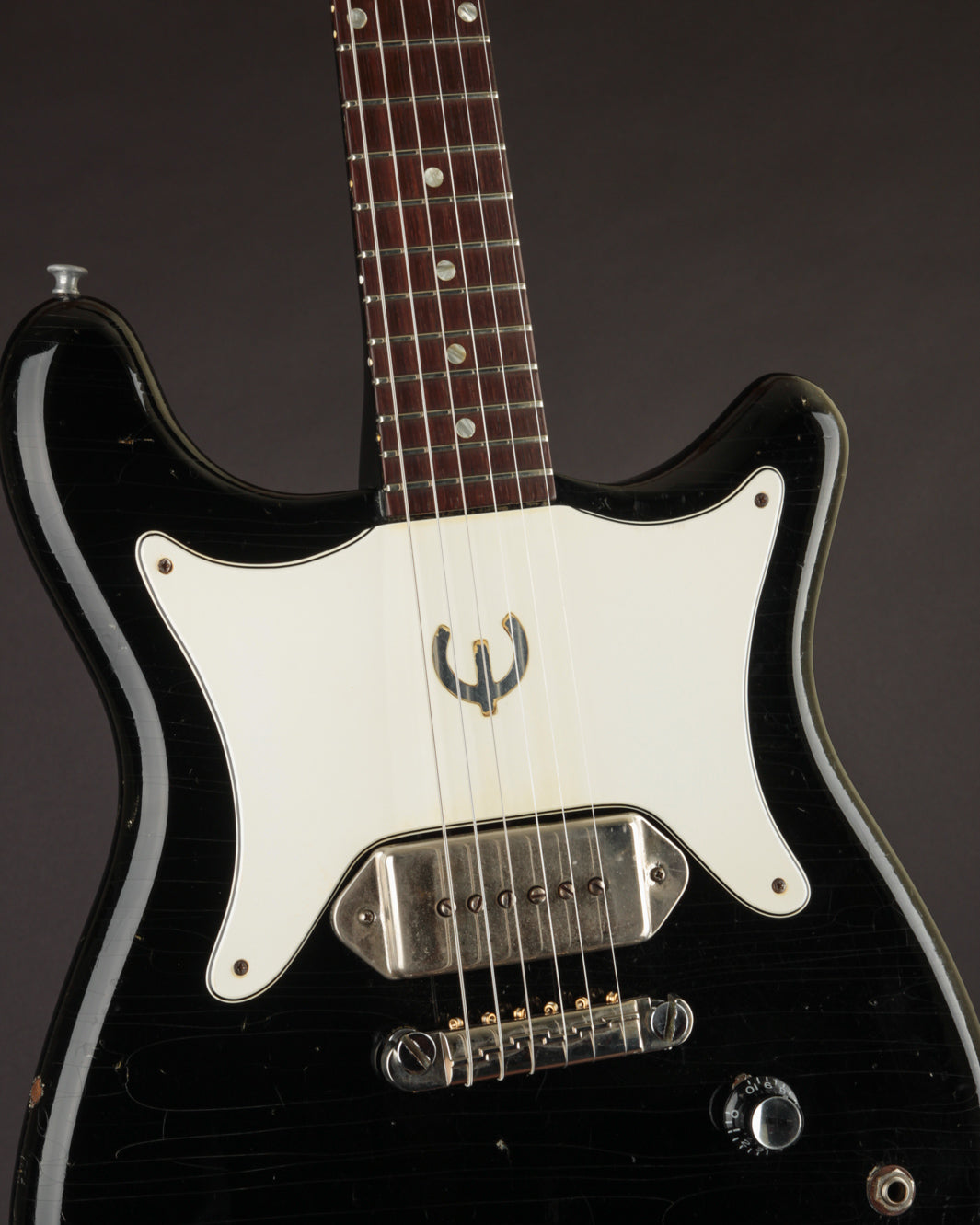 This 1964 Epiphone Coronet represent's Gibson's answer to the SG Junior under the rebranded sister company. The slim contoured 1 3/8" thick Mahogany body, Mahogany neck, and single P90 pickup follows the same pattern as the SG Junior, but the body and headstock shapes redefine the Junior-style aesthetic as to not cannibalize Gibson's popular versions. For those in the know, a 60s Epiphone is a considerable value - you're essentially getting the same guitar built in the same factory with the same woods, electronics, and finish work, all with a different name on the headstock.