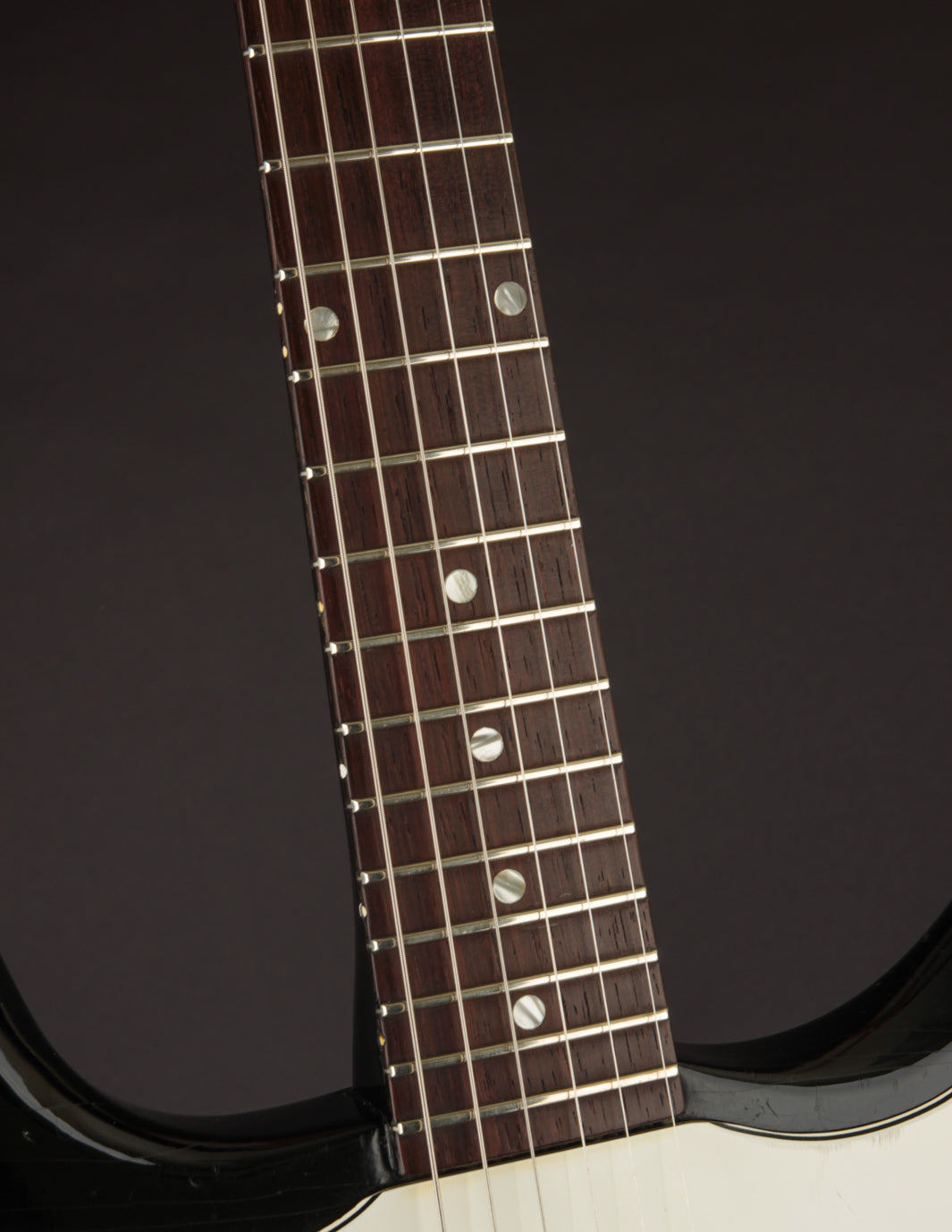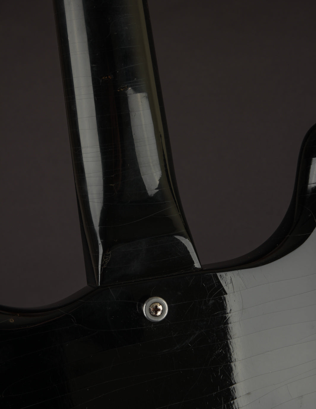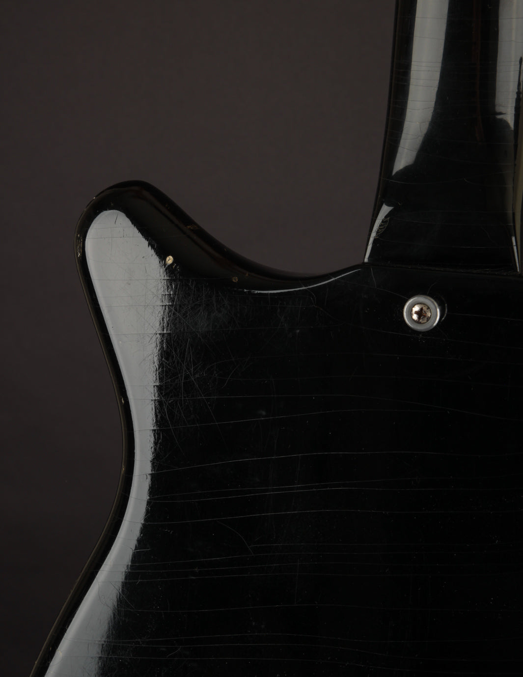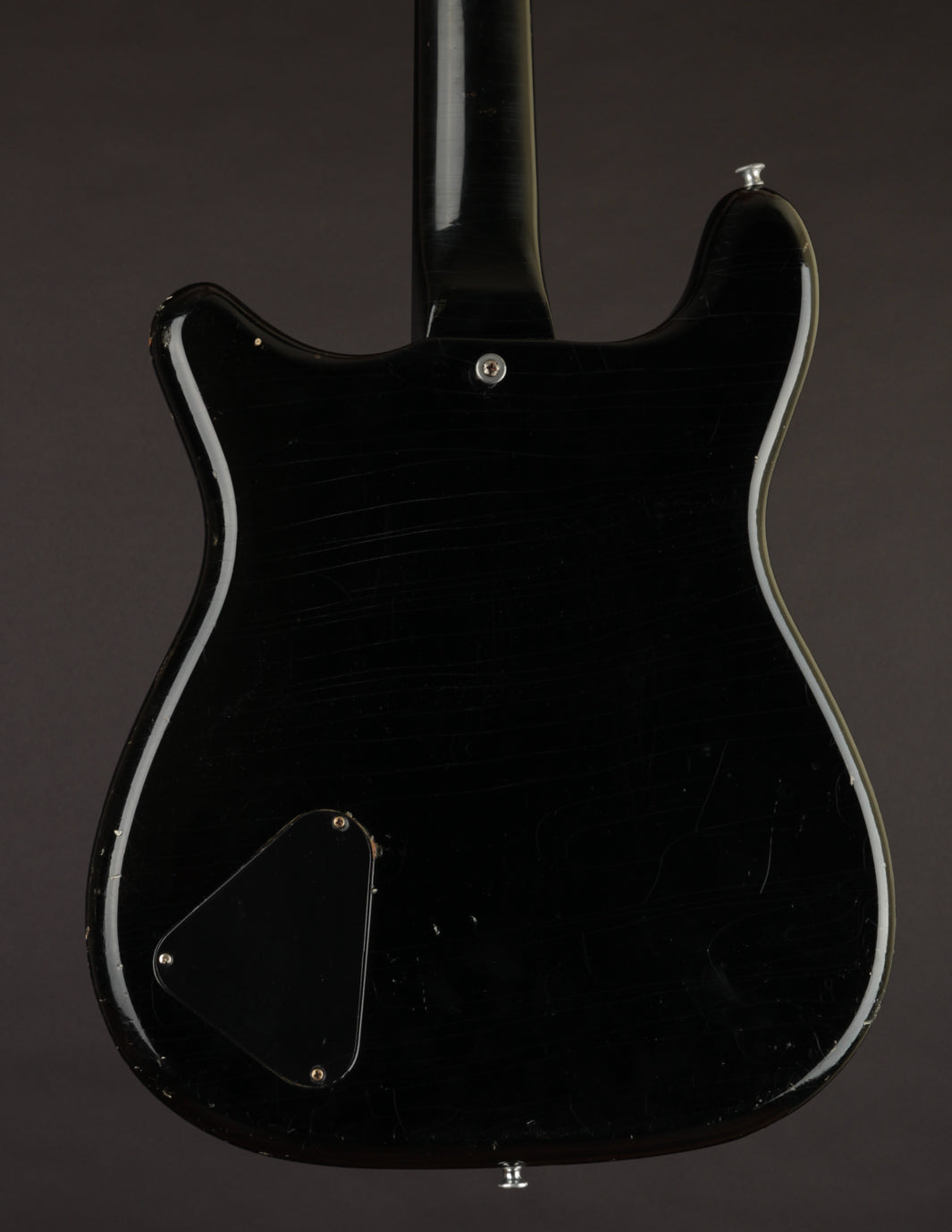 The guitar has been previously refinished in Black over the original Silver Fox finish (which can be seen mostly on the back of the neck and on edges of the body cavities). The work was very well done and looks quite authentic. Priced with aftermarket hardshell case.