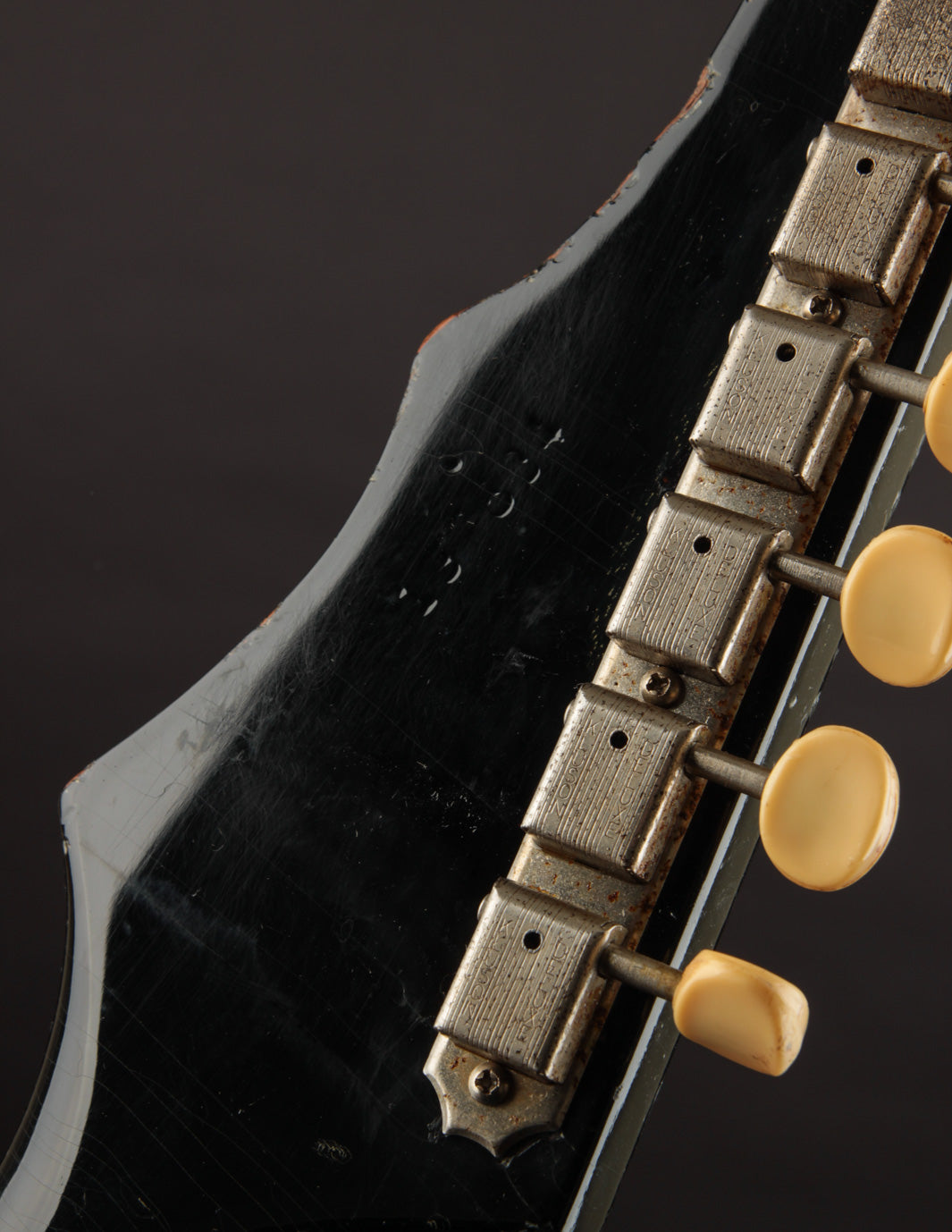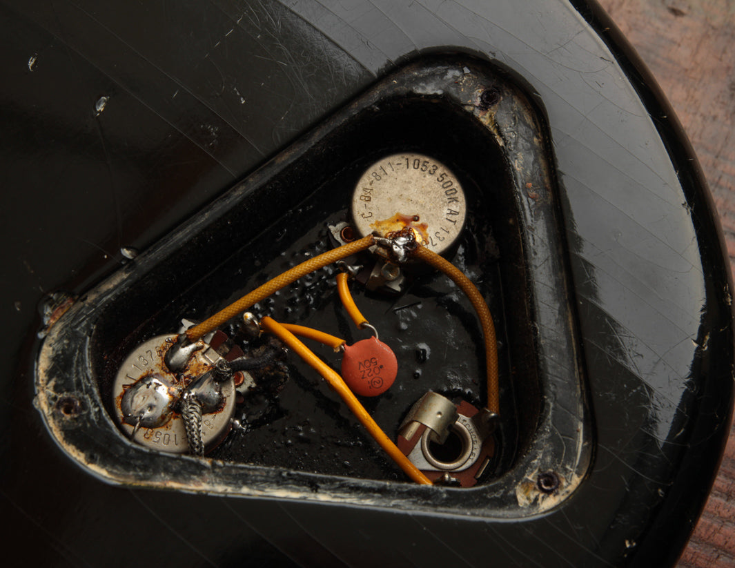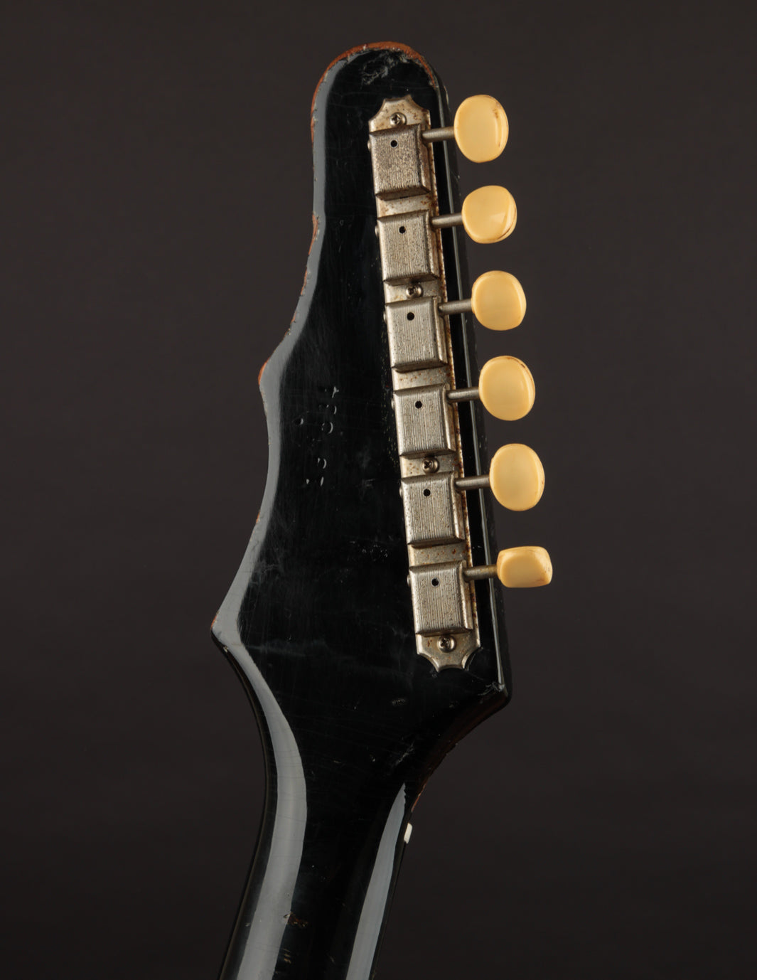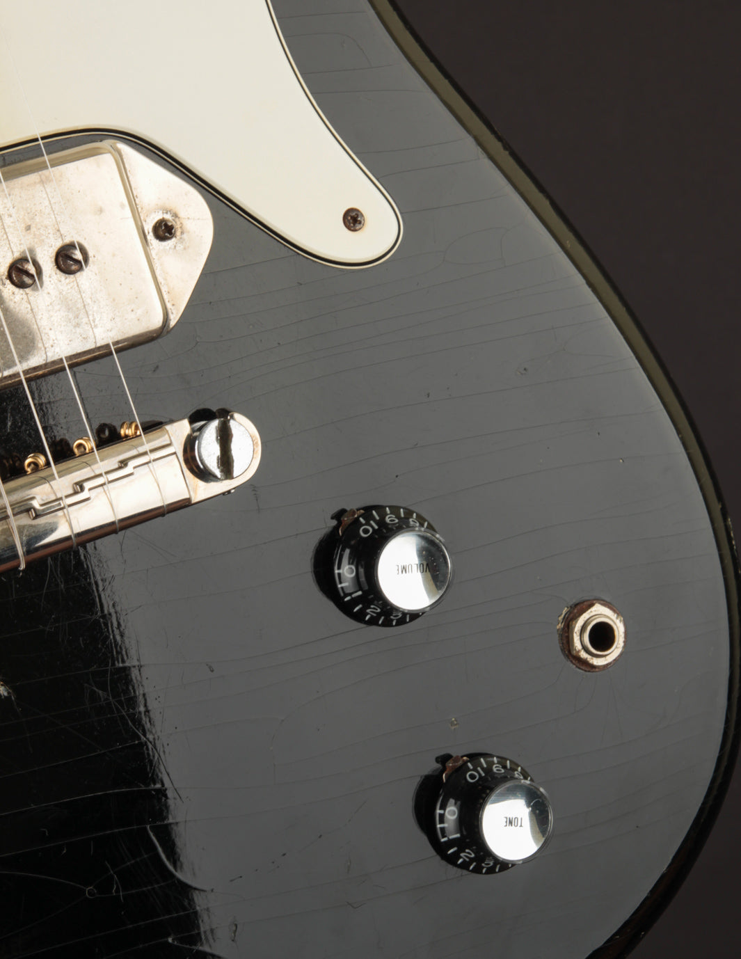 The guitar has been previously refinished in Black over the original Silver Fox finish (which can be seen mostly on the back of the neck and on edges of the body cavities). The work was very well done and looks quite authentic. Priced with aftermarket hardshell case.