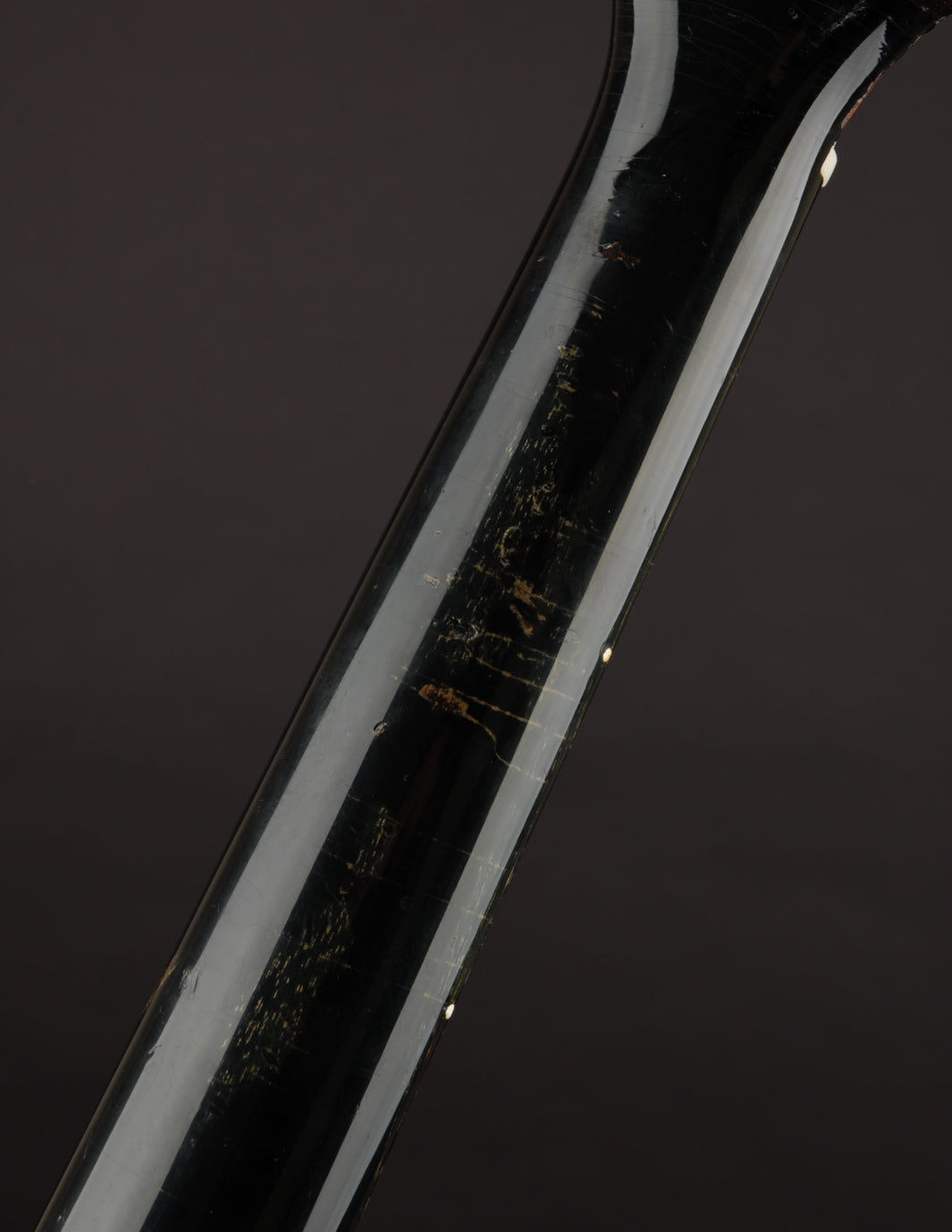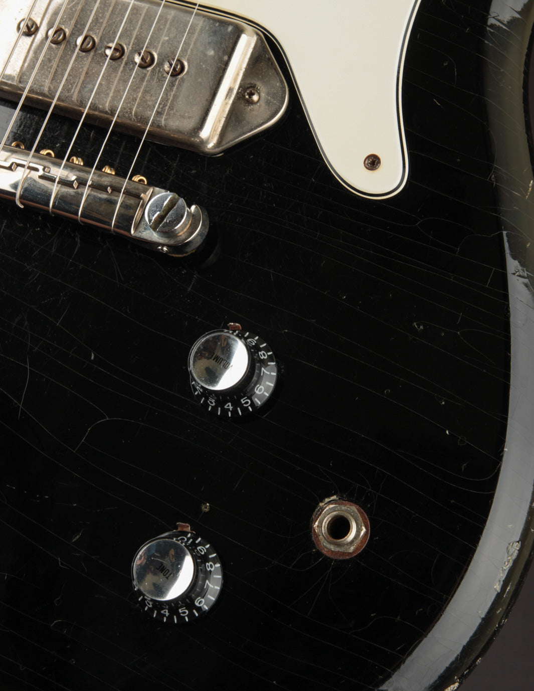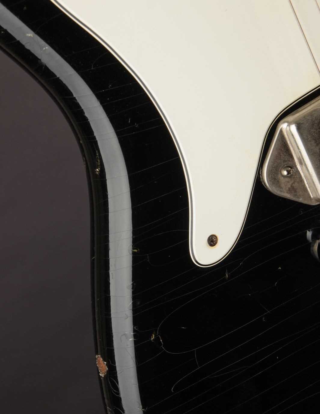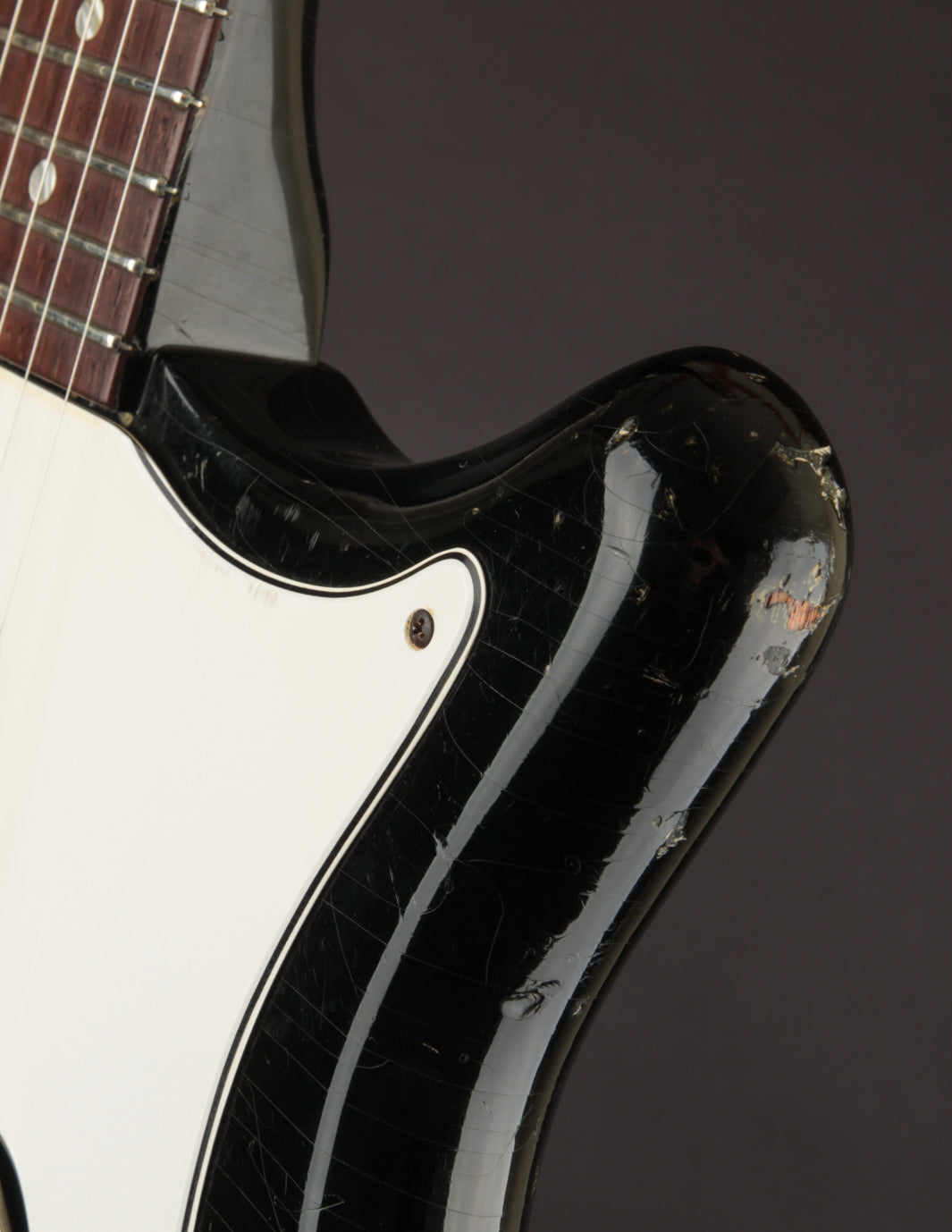 The guitar has been previously refinished in Black over the original Silver Fox finish (which can be seen mostly on the back of the neck and on edges of the body cavities). The work was very well done and looks quite authentic. Priced with aftermarket hardshell case.