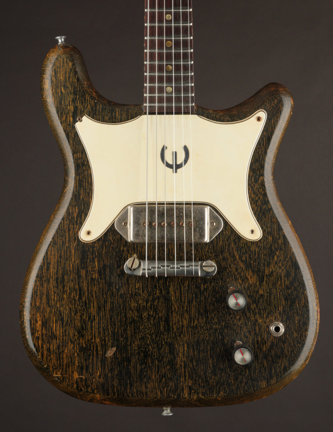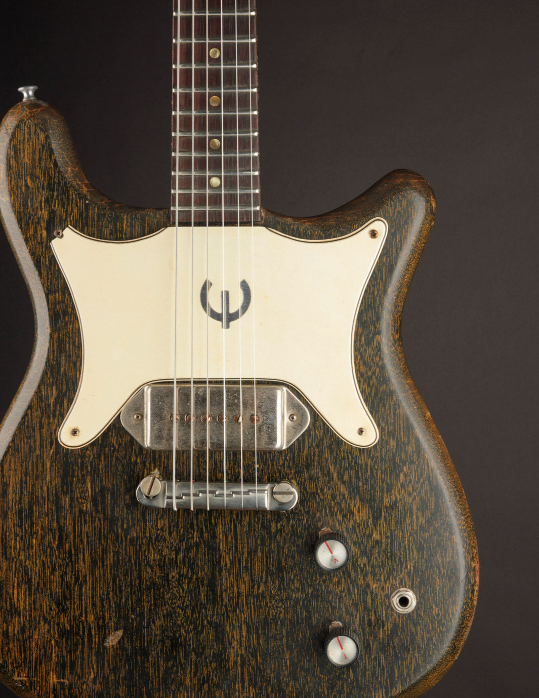 Silver Fox. Where do we ever begin?! This amazing variation of the famous TV finish was found exclusively on Gibson-made Epiphone solidbody electrics beginning in the early/mid 60s. It's since become one of the most popular finishes in the vintage guitar world, and often featured on many boutique electrics and even brought back by Gibson's Custom Shop. We're HUGE fans of original Silver Fox Epiphones!