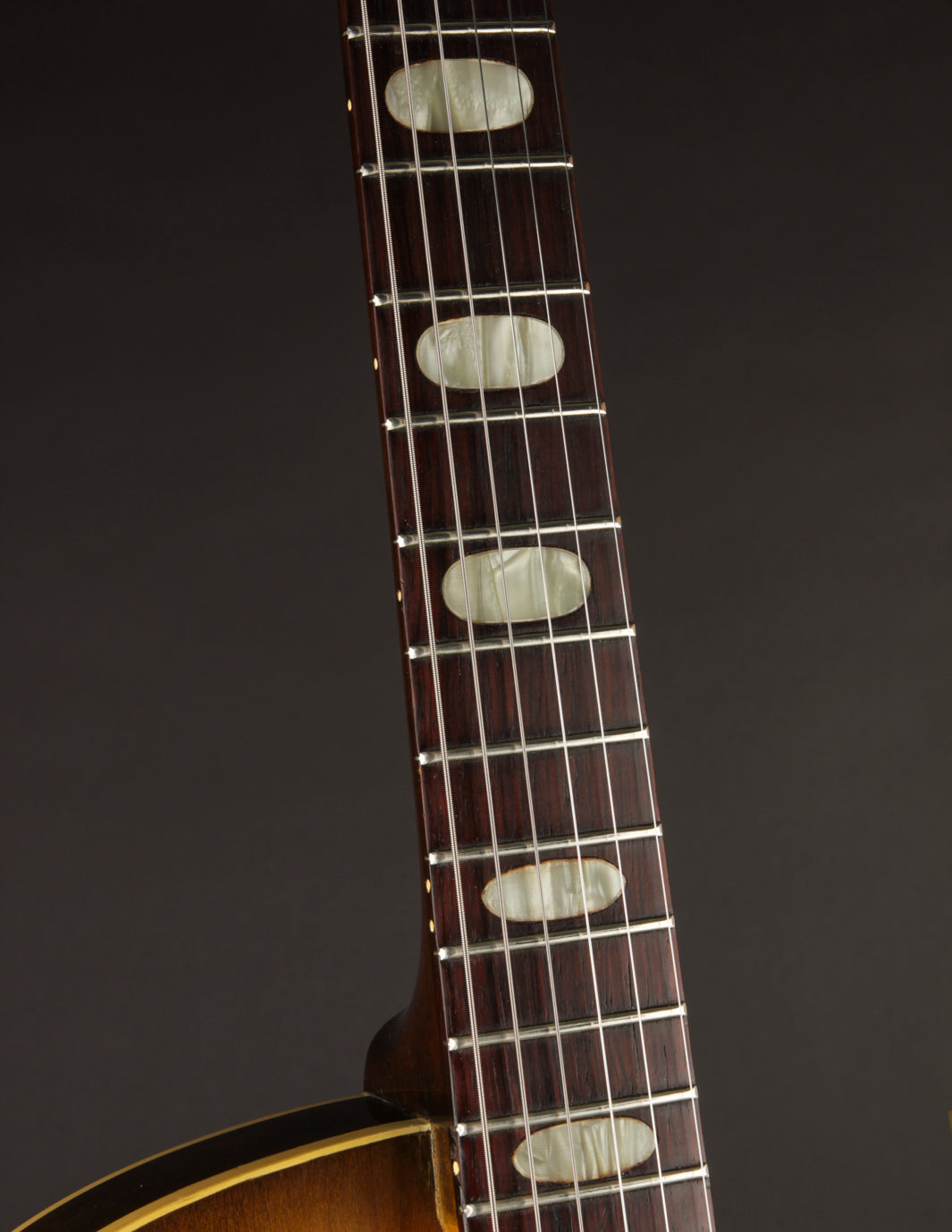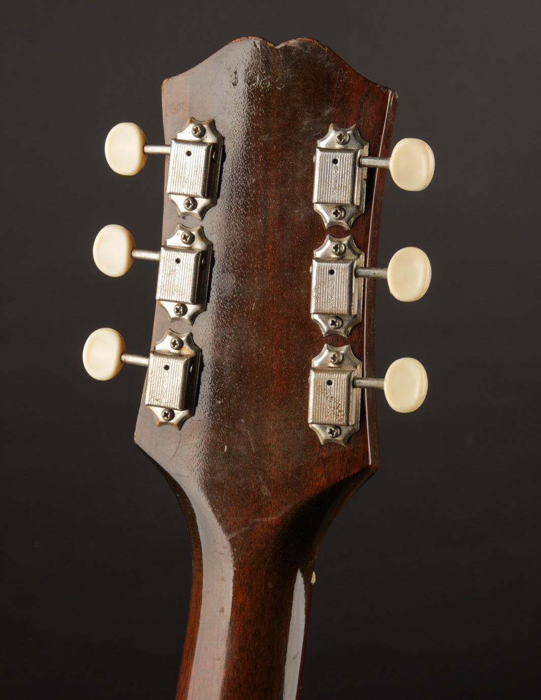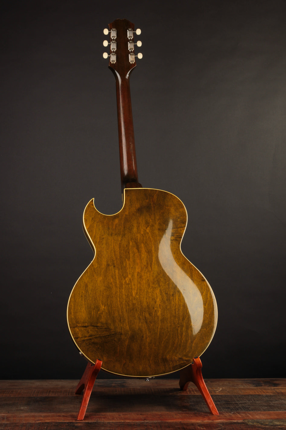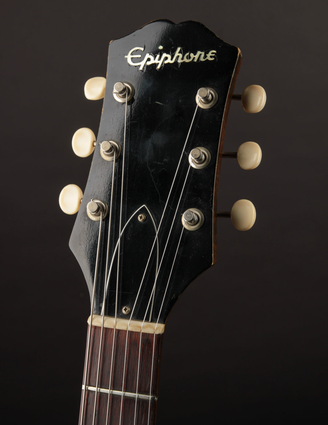 Other early 60s Epiphone features like the smaller open-book headstock shape and oval fingerboard inlays add to that unique look that is far less common than the more production-heavy ES-125T. It's got a transitional 1 5/8" nut width and a nice medium C neck carve that leans more slim than chunky, but has a smooth taper for great playability regardless of position. Factory single line Kluson tuners with original white buttons work great.