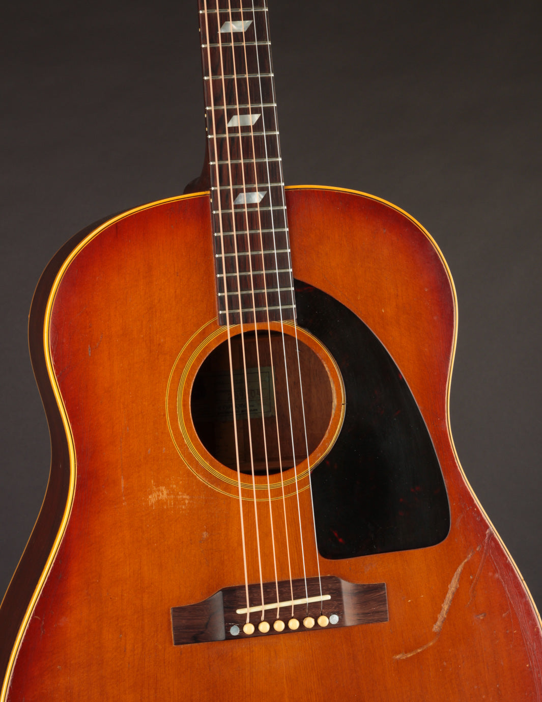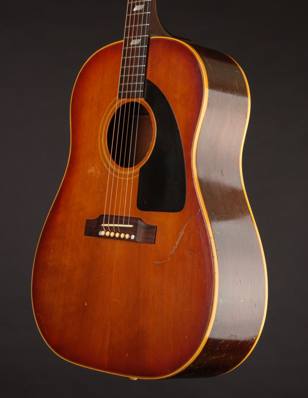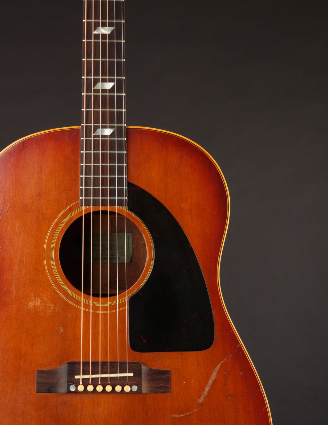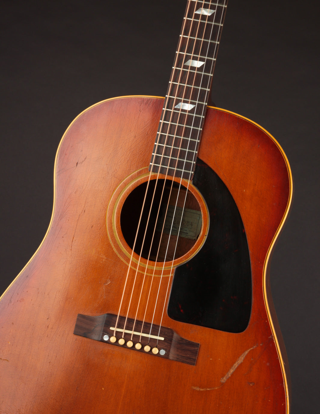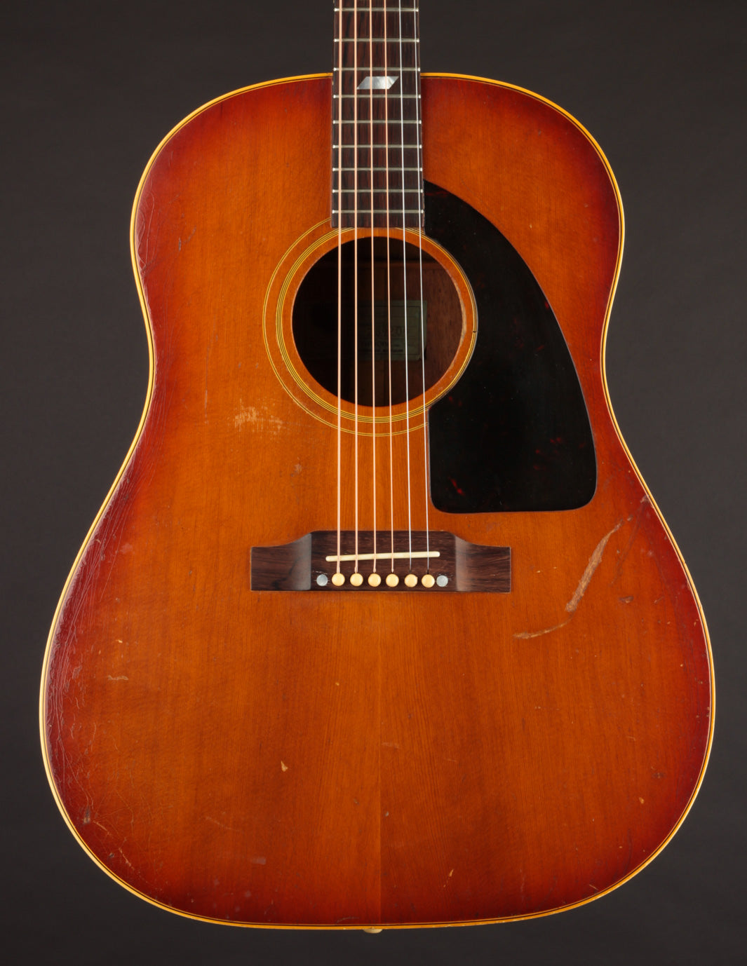 This particular Texan has weathered the years very well. And although it's been played, its structure is still in great condition. The original adjustable saddles have been replaced with a modern, bone counterpart (many of us would consider this swap an improvement). Aside from that modification, it remains as it was made in 1965 (battle scars from lots of gigs notwithstanding). No cracks, and overall very good vintage condition. We think this is a particularly good sounding Texan; and if you're looking for a vintage dreadnought it's well worth consideration. Priced with non-original hard case.