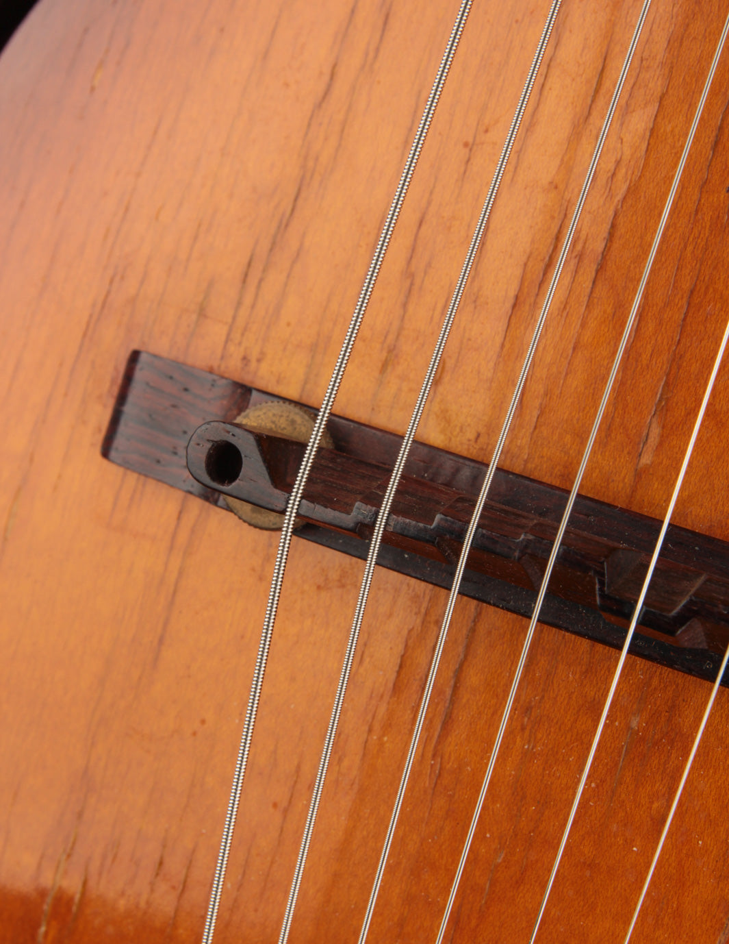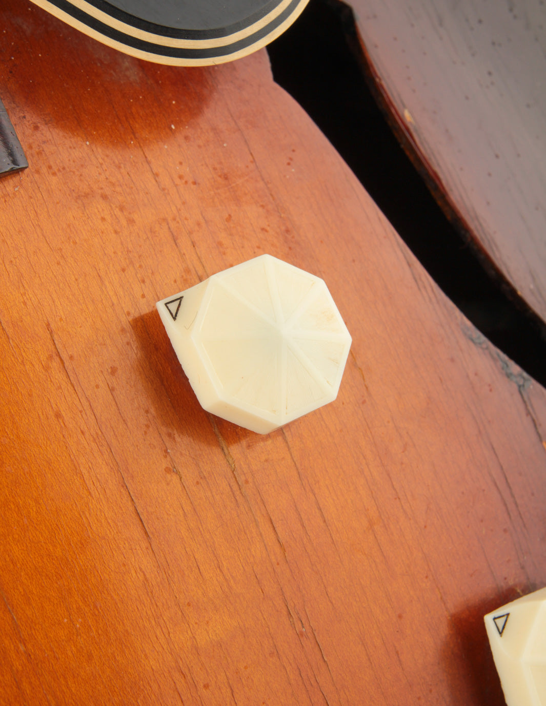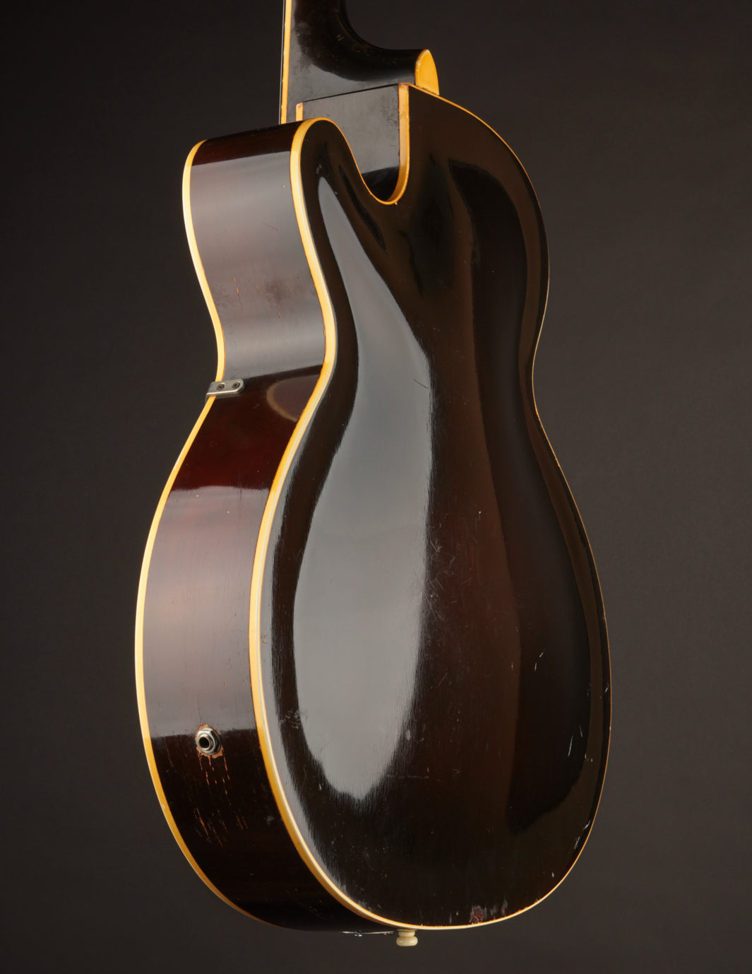The guitar certainly shows its age by way of finish wear and lacquer checking throughout. There are various nicks, scratches, bumps, and bruises commensurate with a guitar of this vintage. The single New Yorker pickup delivers a clear, crisp tone that pairs well with the woody acoustic voice of the guitar. We installed a very nice set of custom-made reproduction "carousel" knobs in lieu of some non-original knobs the guitar arrived with. The adjustable Rosewood bridge allows for further adjustability, and the original trapeze tailpiece remains in good health.