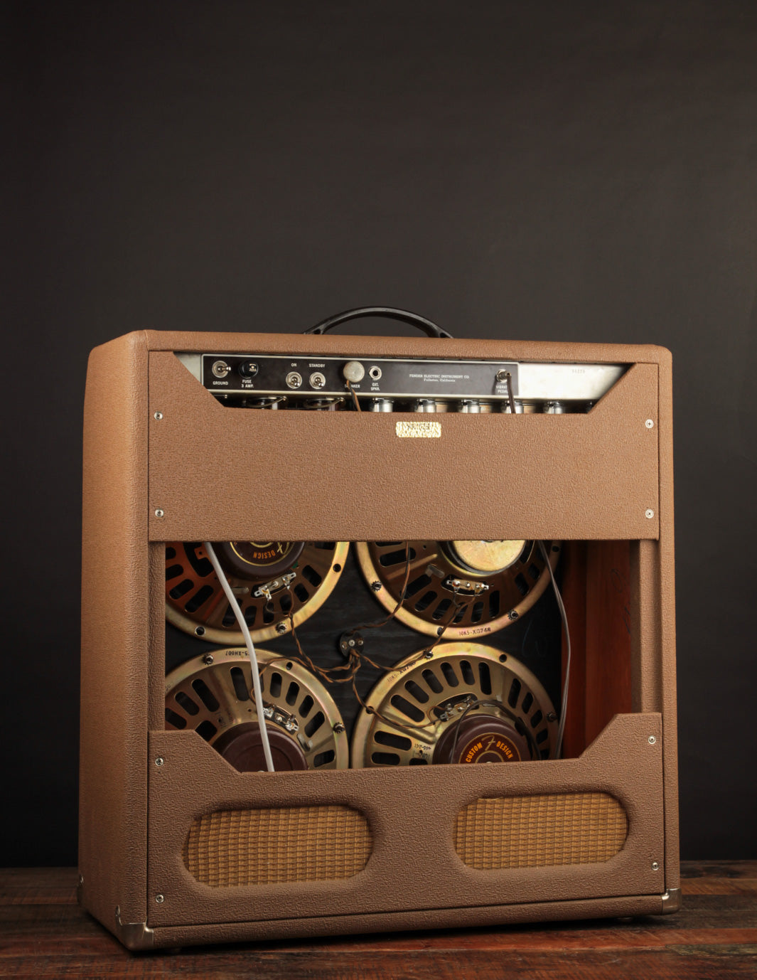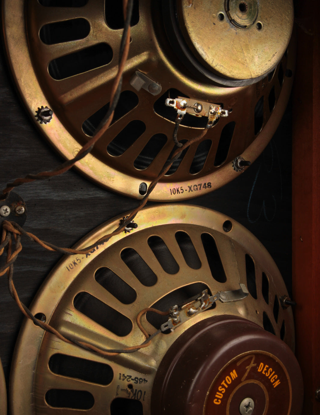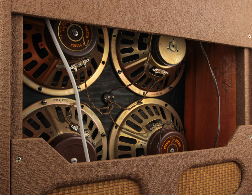 Along with some basic cleaning it was back up and running, sounding as glorious as ever. The original gold frame Oxford 10K5 speakers still sound excellent with very little cone fatigue present. One of the four speakers is strangely missing its magnet cover, but all are undoubtedly true to the original factory foursome, showing date codes c. September and October of 1962. There's some evidence of moisture exposure on the bottom section of the cabinet where some of the tolex lost its adhesion, but the tolex is stable all around.