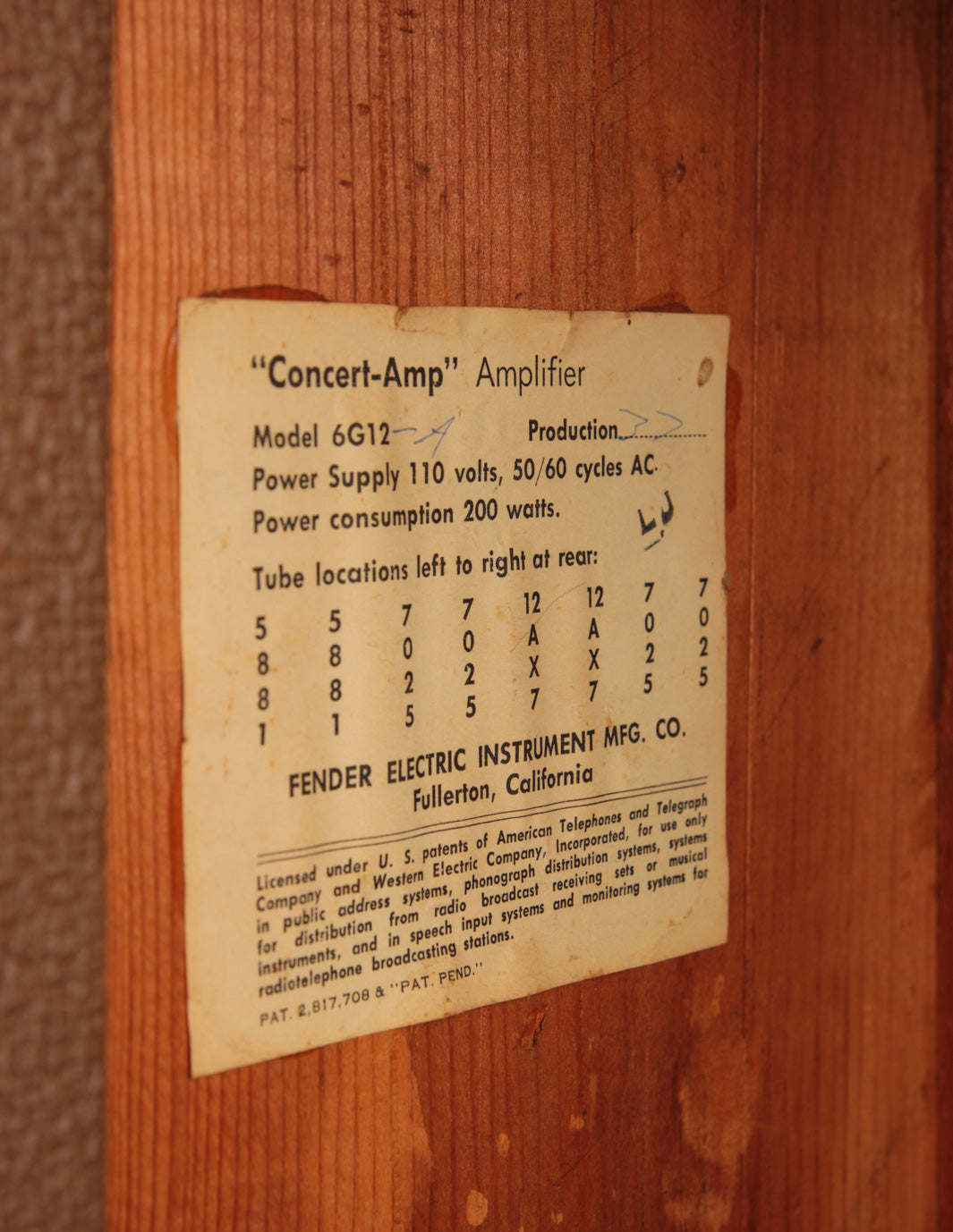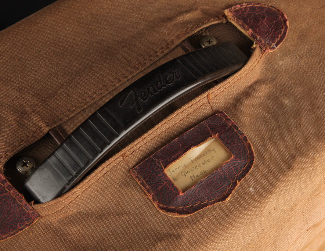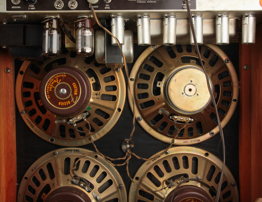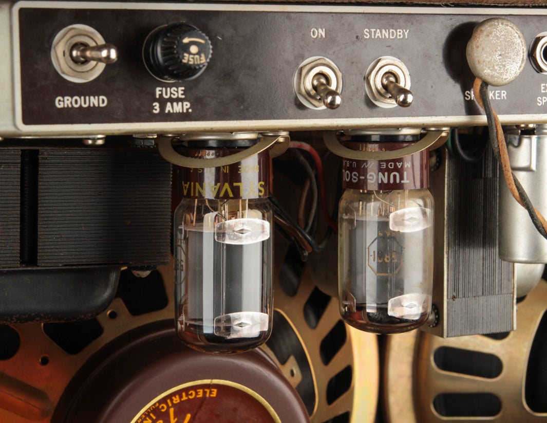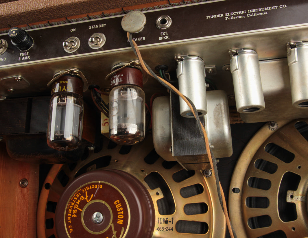 The amp had never been touched internally since it left the factory, and was still outfitted with the original tubes! We were the first to go back in and check everything out since Leo's team sent it off the assembly line in late 1962. Naturally, it needed the typical servicing all vintage amps require - replacement of the original electrolytic capacitors, a new bias resistor, and a weak power tube (one of the original Tung Sol power tubes is still in there!). The original "death cap" was also removed and a new 3-prong power cord was installed (gray, of course, in keeping with the look of the original gray power cord).