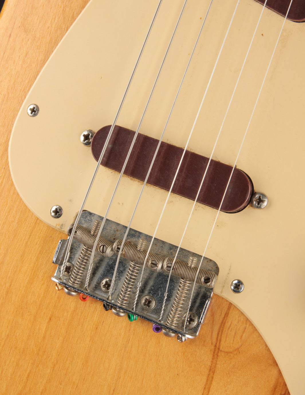 The original frets were fairly worn out, so we replaced them in-house with Jescar 43080 vintage sized wire, and it's back to playing like it was the day it shipped out of Fullerton. The slab Brazilian Rosewood fingerboard is gorgeous as well, and contrasts nicely against the lighter pickguard and ambered clear coat finish over the Poplar body. It's one of those instances where we honestly don't mind the old refin - it looks great! This will be a hard one to let go, as it very quickly became a staff favorite.