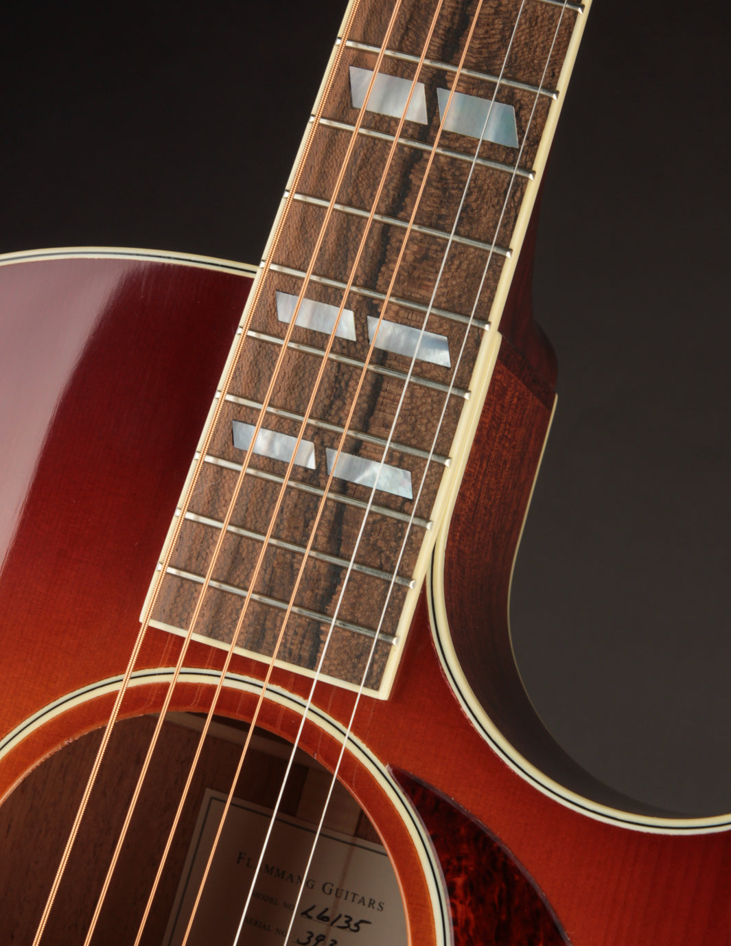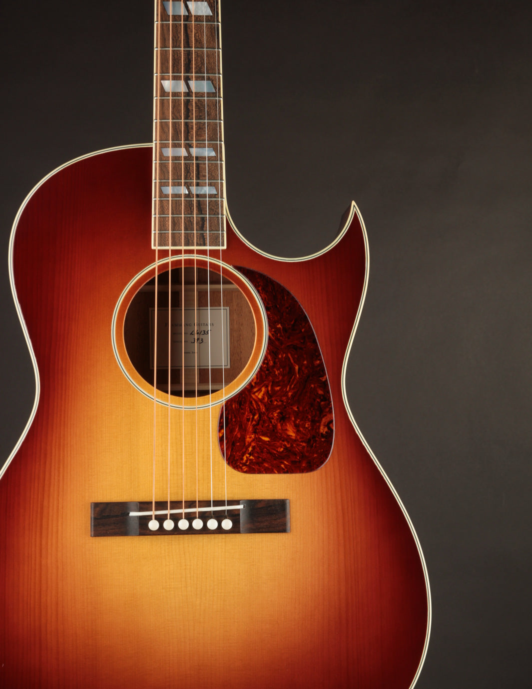 This LG-135 gives a nod to Gibson's CF-100 model. Introduced in the 1950s, the CF-100 was actually Gibson's first flattop cutaway model. Fast forward to 2025 and David Flammang has artfully reimagined this iconic guitar.