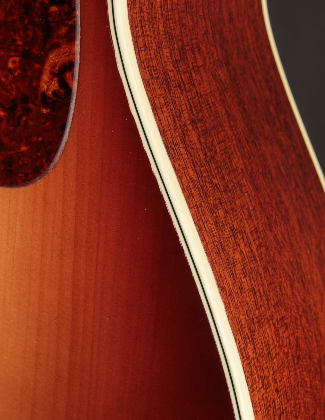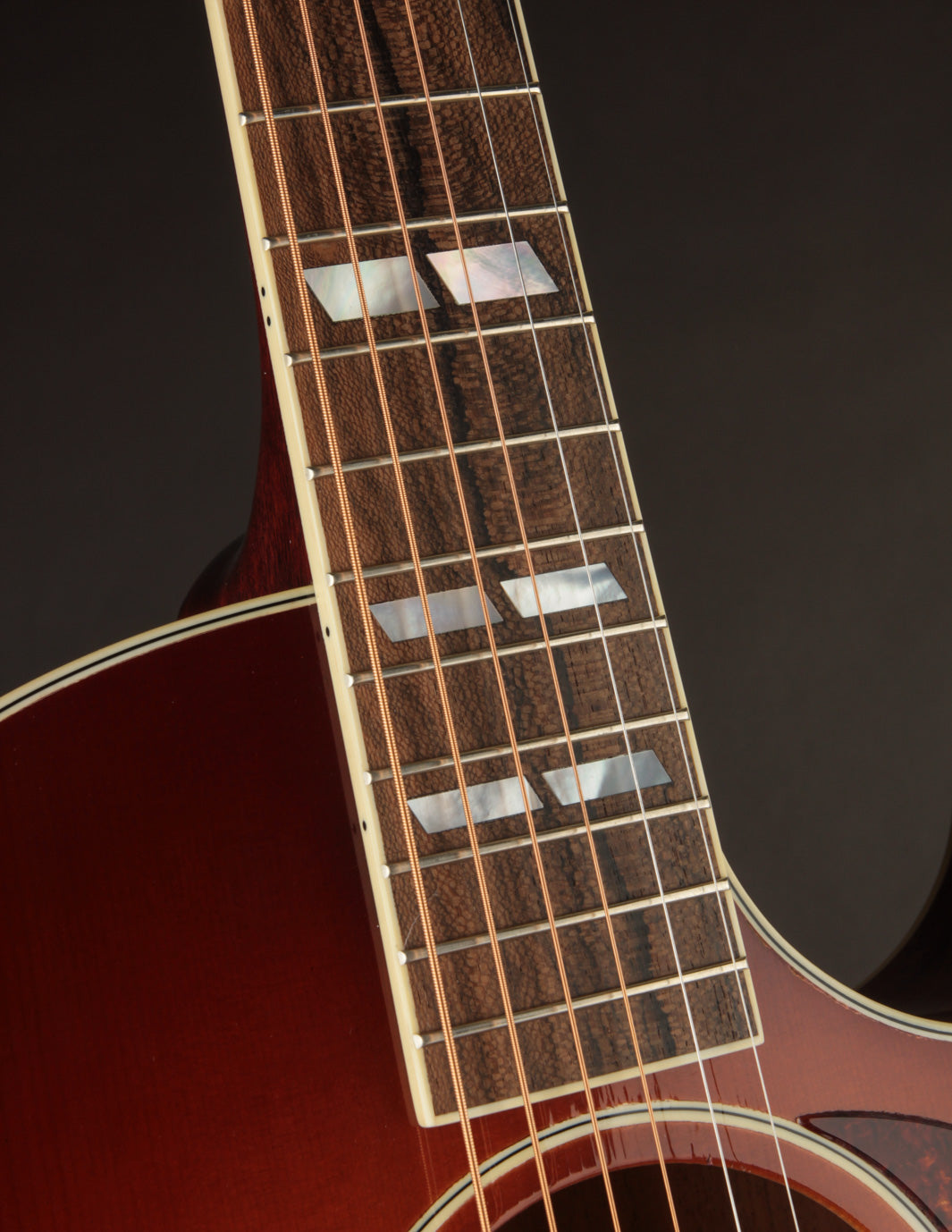 It feels feather-light when picked up and is incredibly responsive and fun to play. It's got a surprising amount of rumble for a smaller LG size guitar and really captures the warm throaty vibe of a vintage guitar. It's rare to find a cutaway on a guitar this small, which makes capo'ing and reaching those upper frets a breeze. A must play for Gibson enthusiasts or anyone simply looking for a great small body guitar.