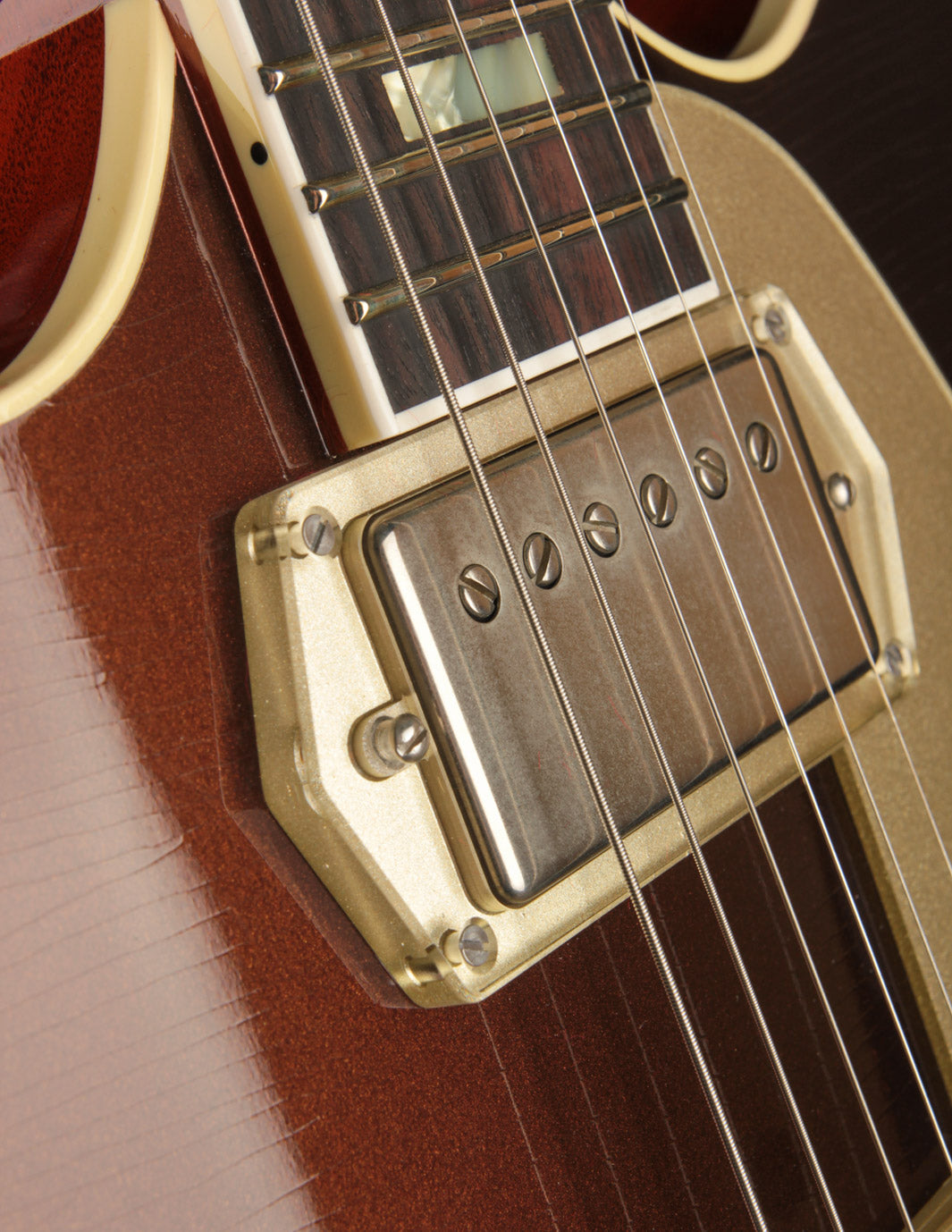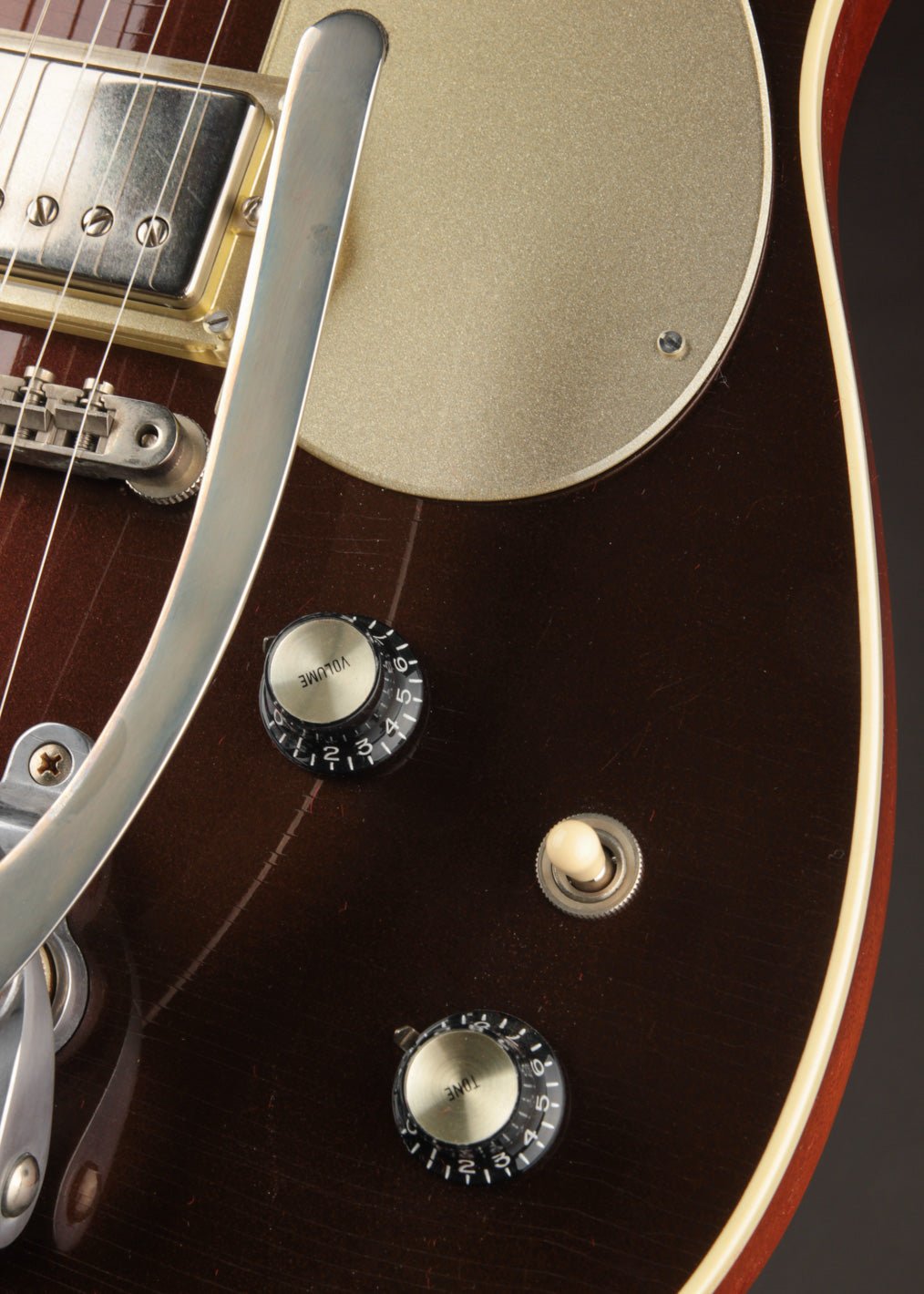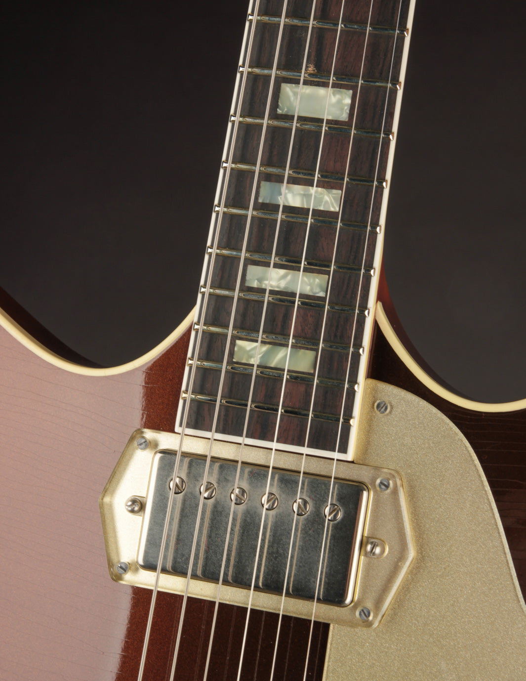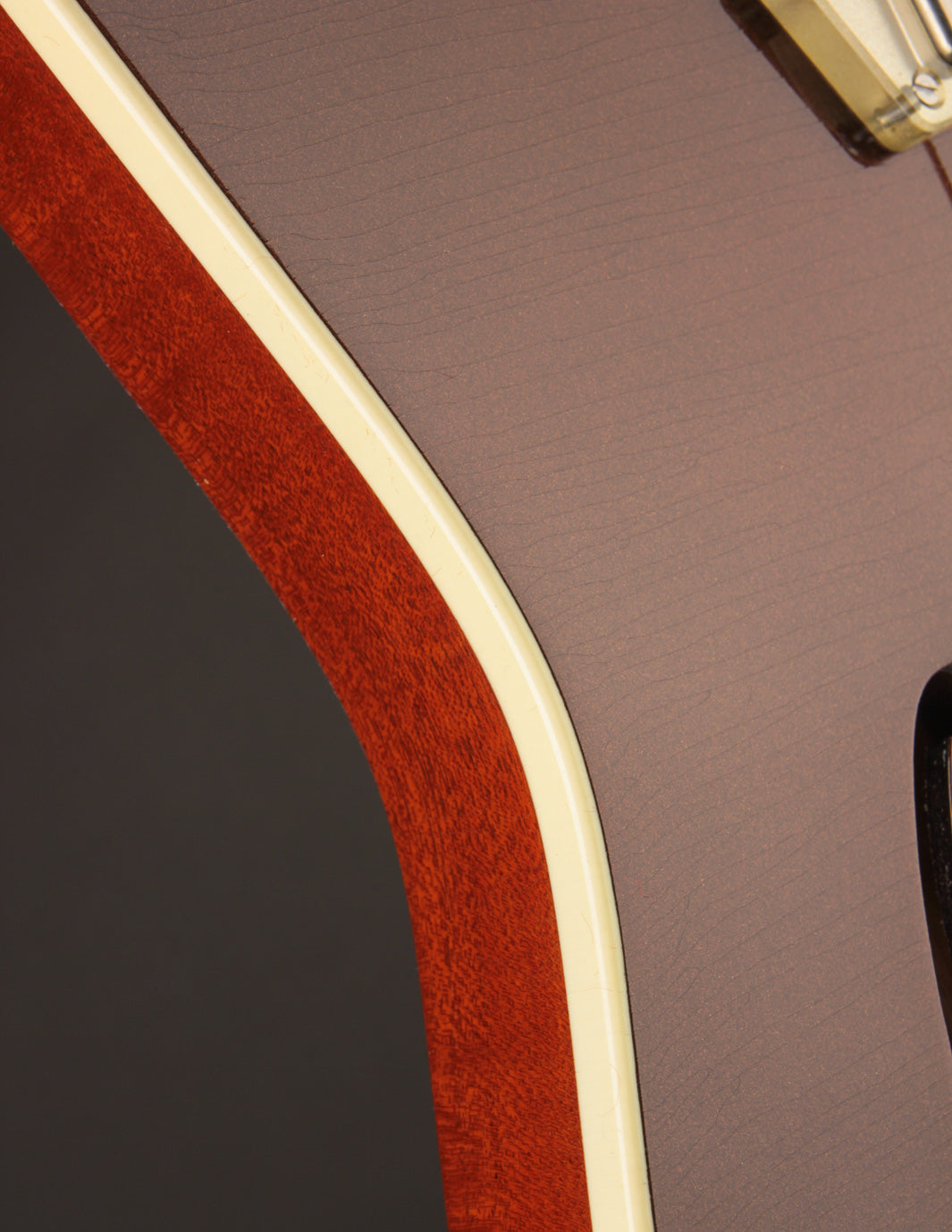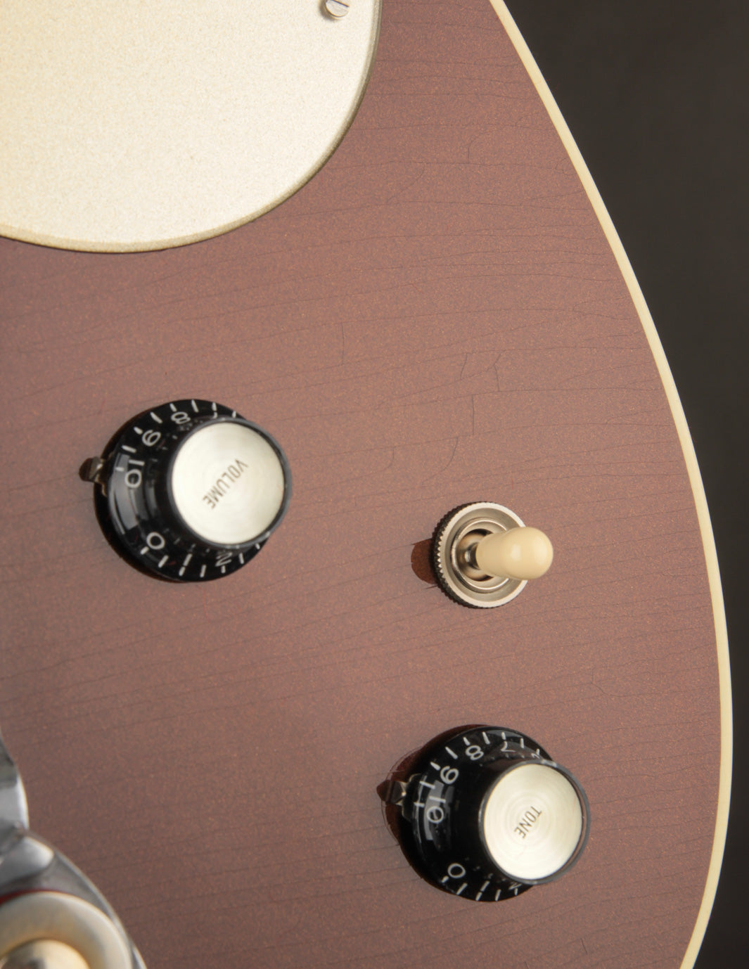 Its lightly relic'd Antique Bronze finish is both understated and stunning in person, perfectly setting the tone for the rest of the guitar. Paired with clear acrylic pickup surrounds, a clear acrylic pickguard backed with Pewter Silver, small block inlays, and Grover "Milk Bottle" Rotomatic tuners, this guitar exudes a vintage, broken-in charm that makes it irresistible to play.