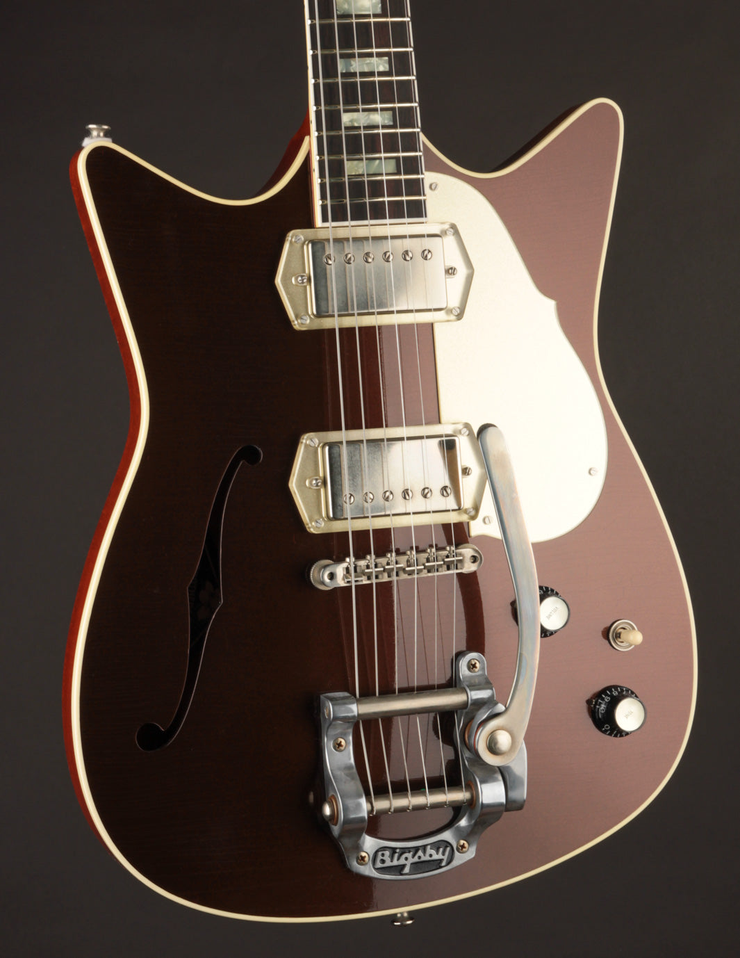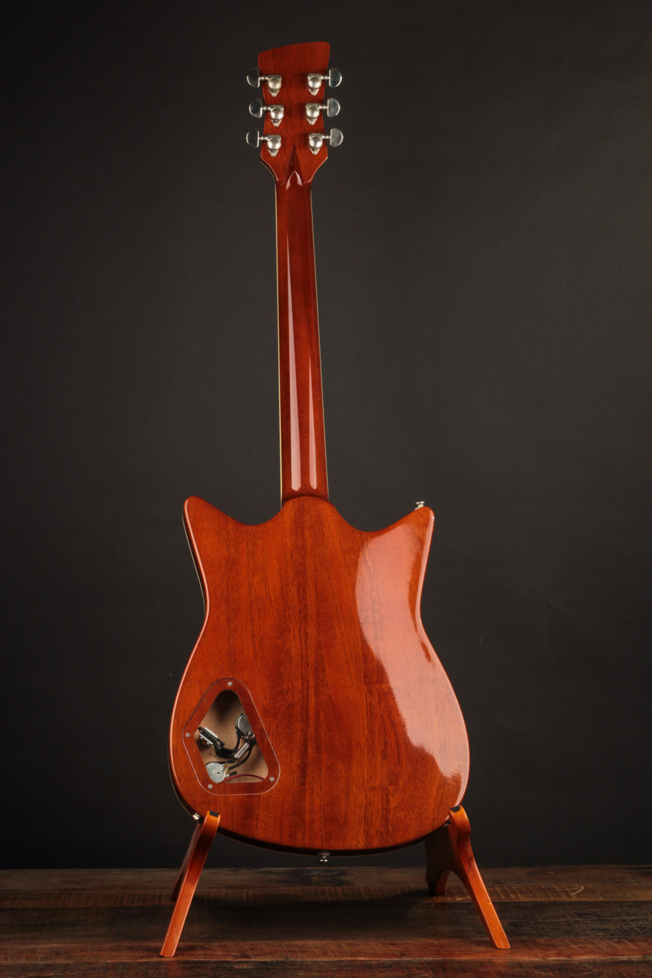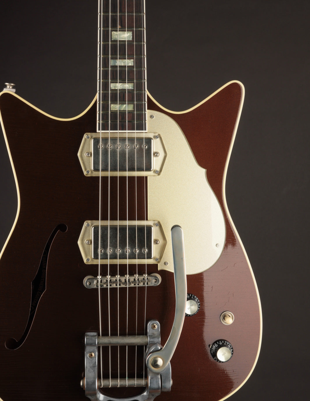 The Frank Brothers Arcade Thinline blends their signature silhouette with a large cavity on the bass side, reducing weight while enhancing acoustic projection, clarity, and responsiveness.