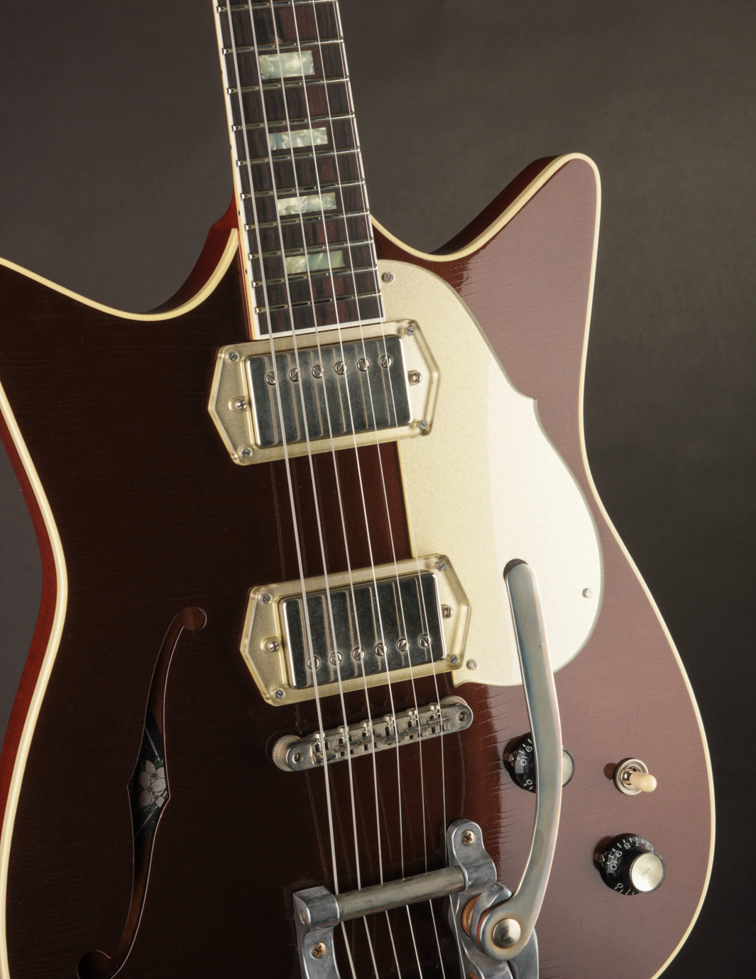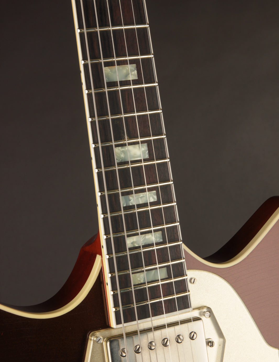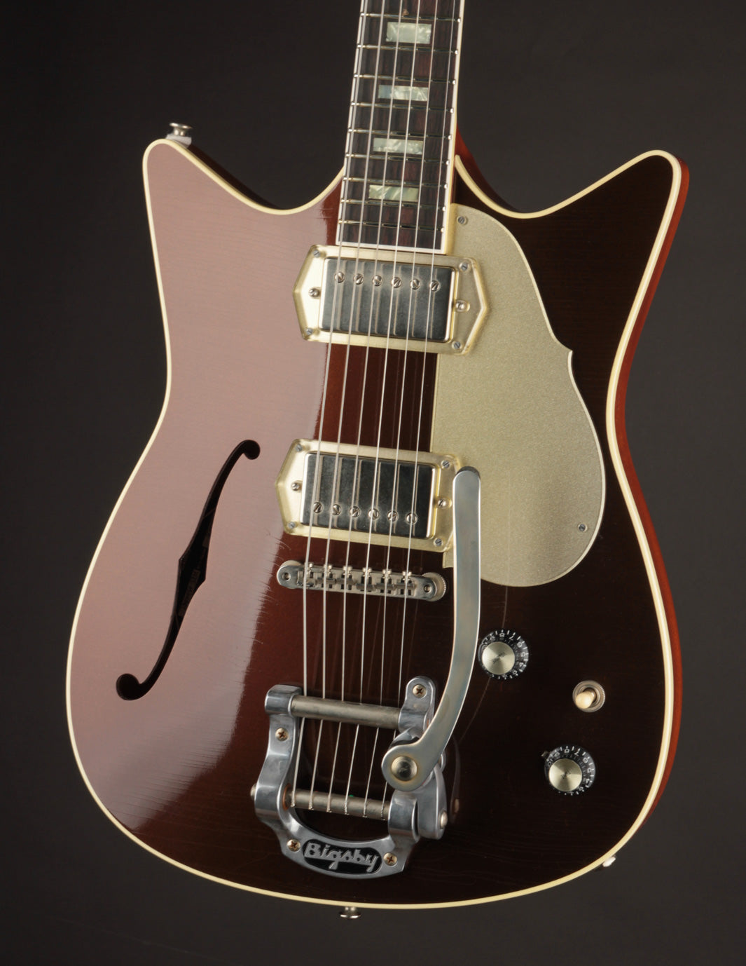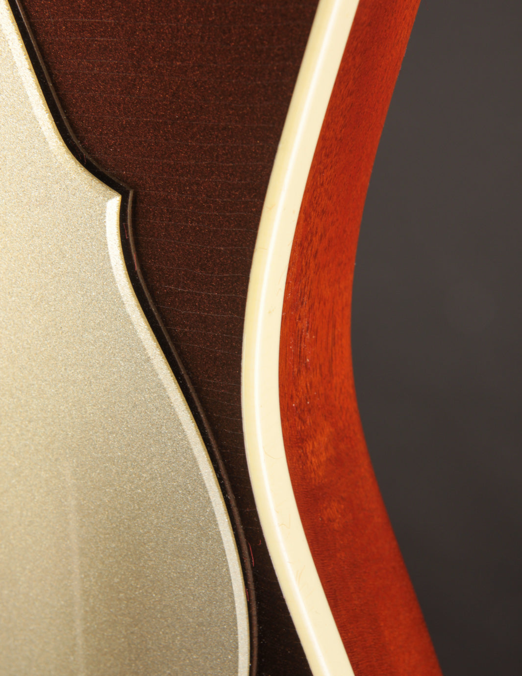 The Frank Brothers Arcade Thinline blends their signature silhouette with a large cavity on the bass side, reducing weight while enhancing acoustic projection, clarity, and responsiveness.