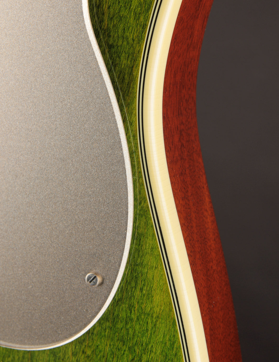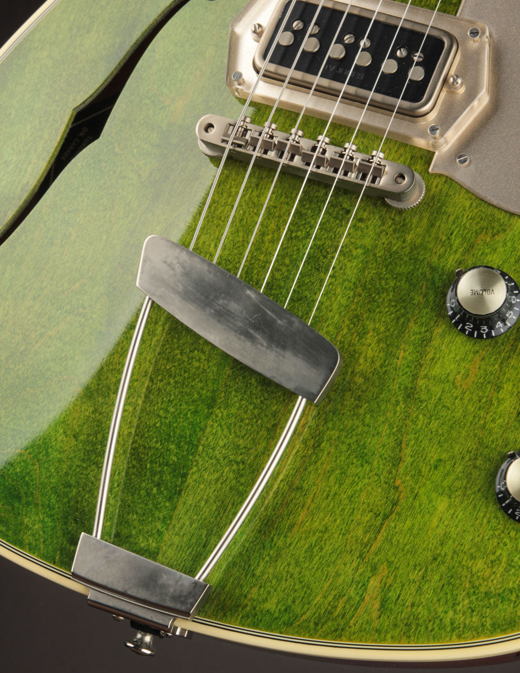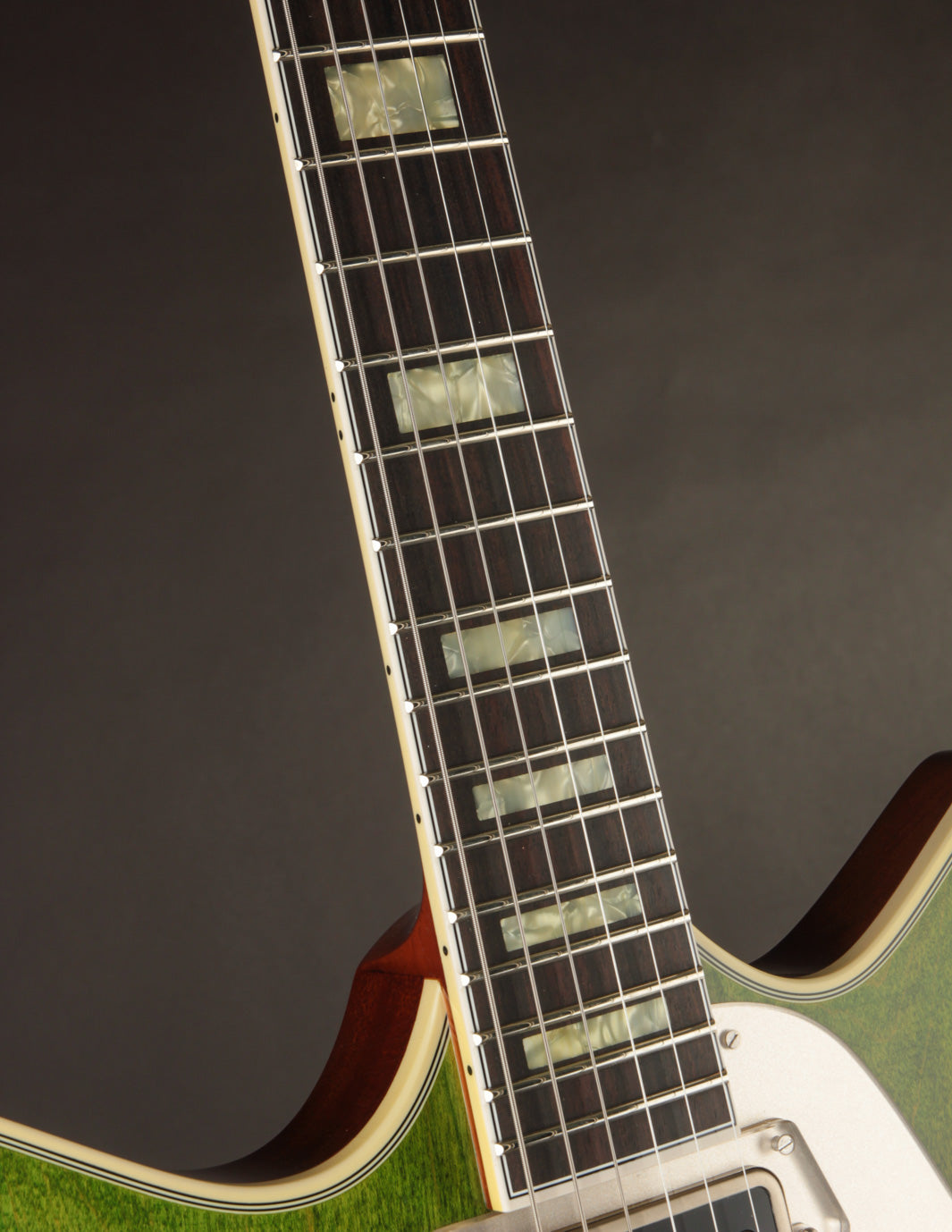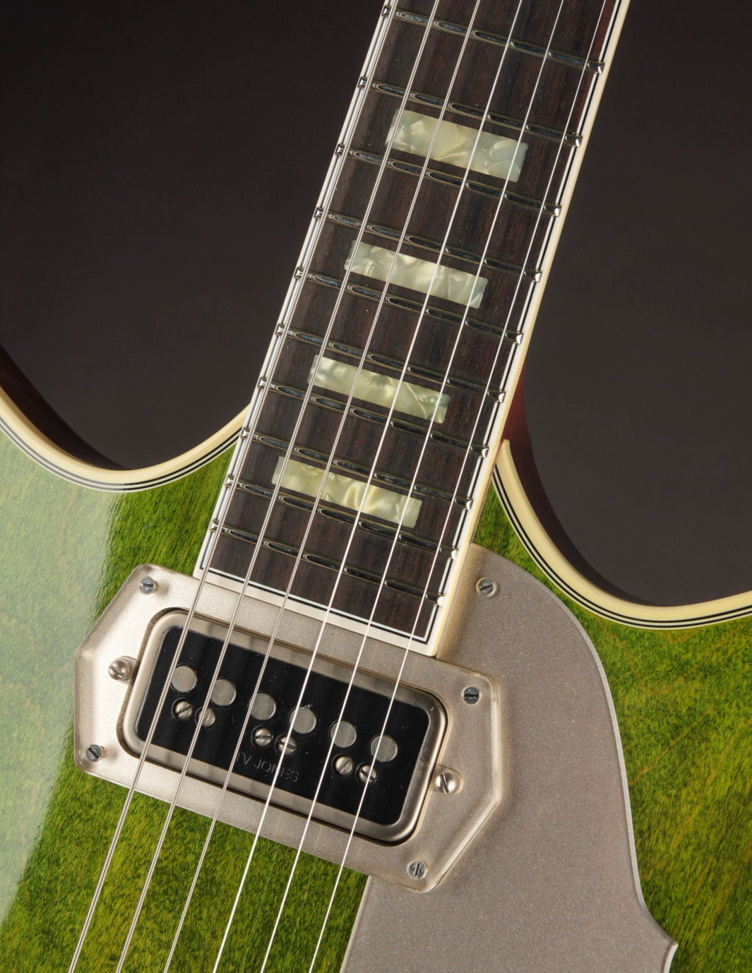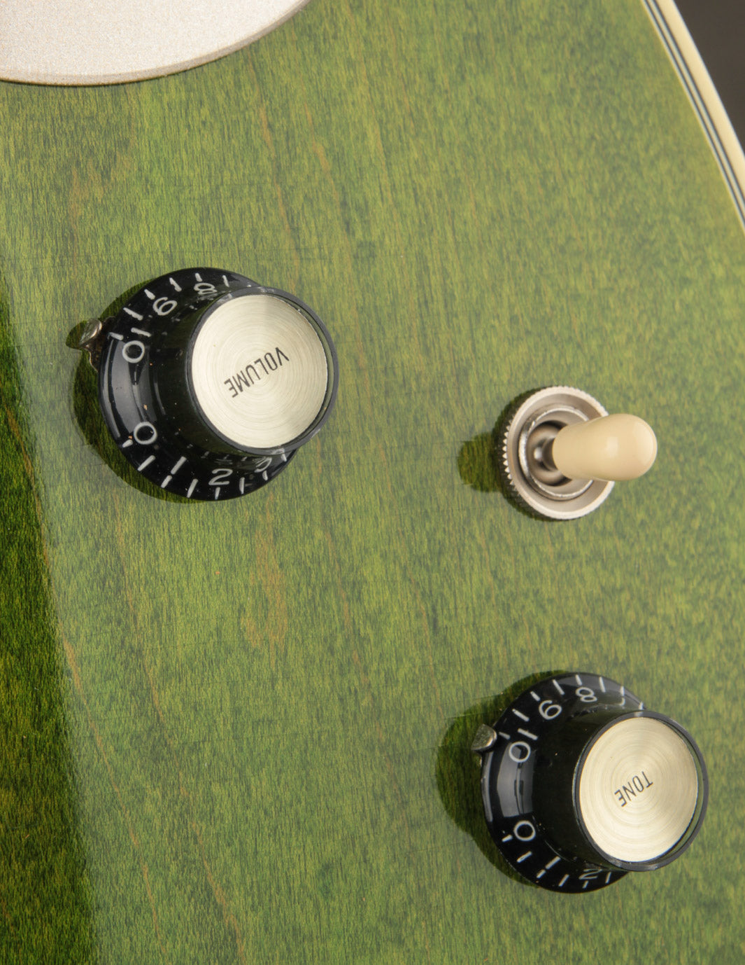 The lightly relic’d Faded Evergreen finish has a quiet sophistication that photos can’t quite capture—subtle, striking, and beautifully matched by the clear acrylic appointments throughout. The pickup surrounds and pickguard (backed in Silver), along with small block inlays and Grover "Milk Bottle" Rotomatics, give this guitar a vintage-inspired, broken-in feel that’s immediately inviting. One part vintage Gretsch, one part vintage Gibson (though the overall feel leans way more in the Gibson direction).